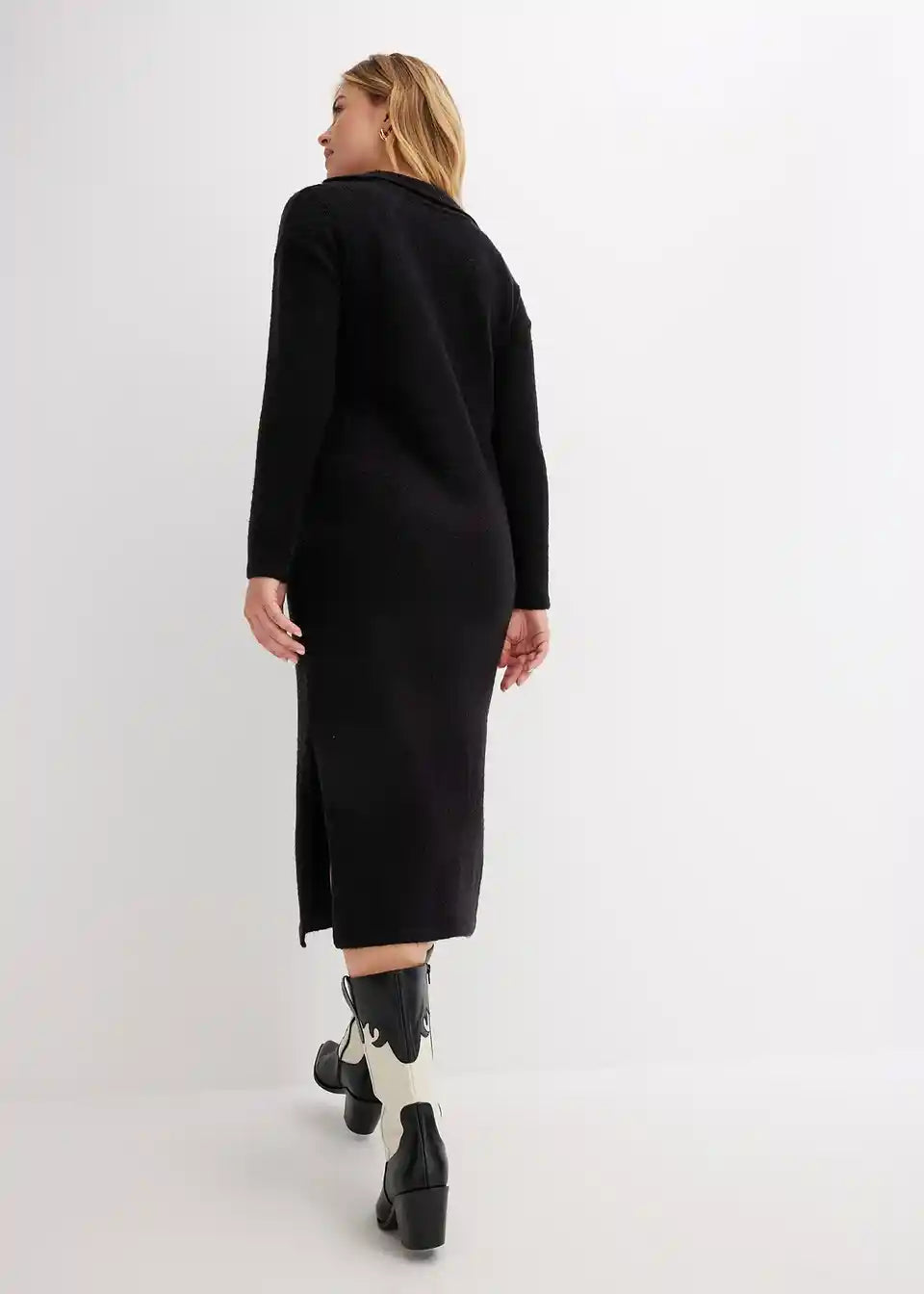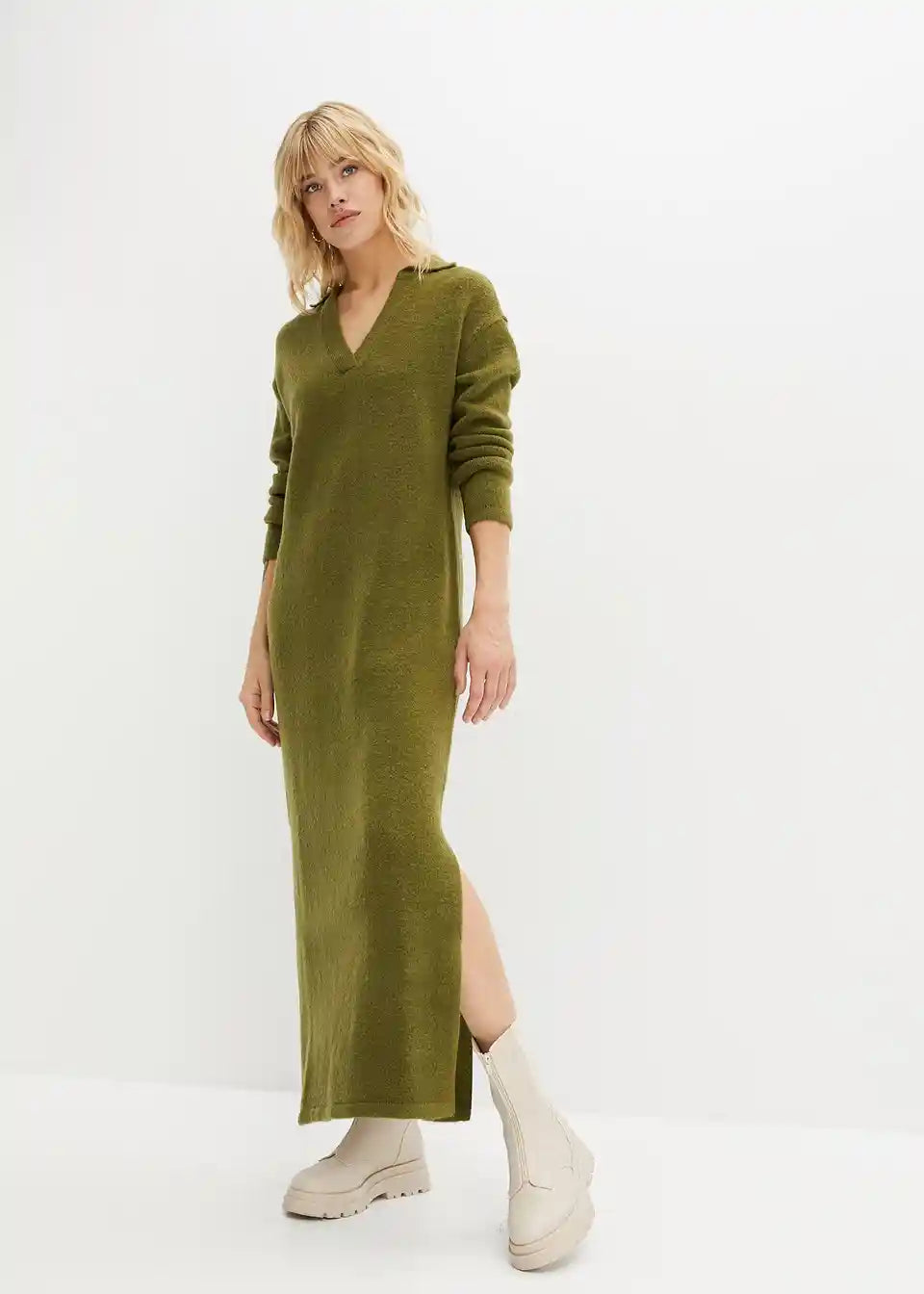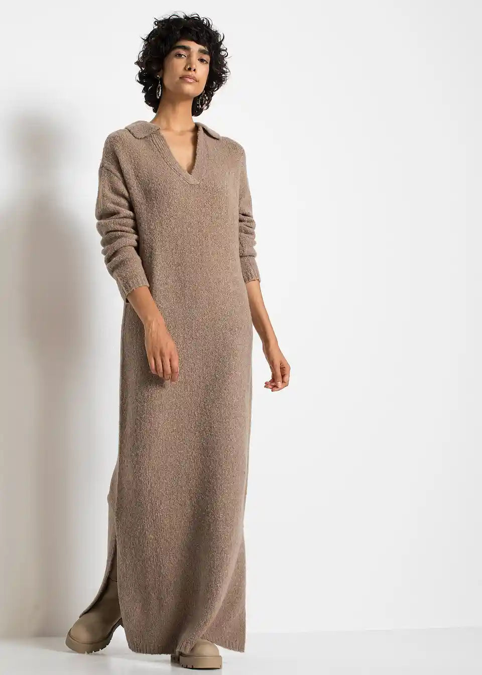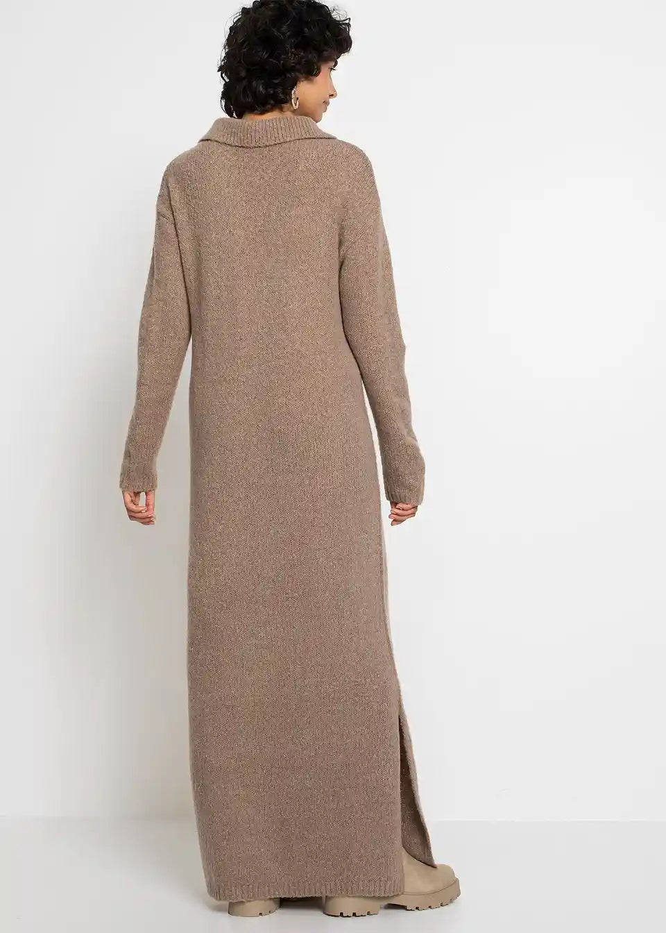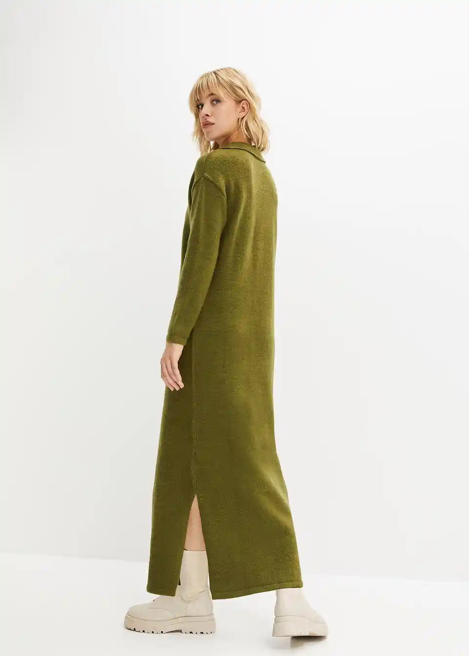 Duga pletena haljina s kragnom na košulju i prorezom na strani