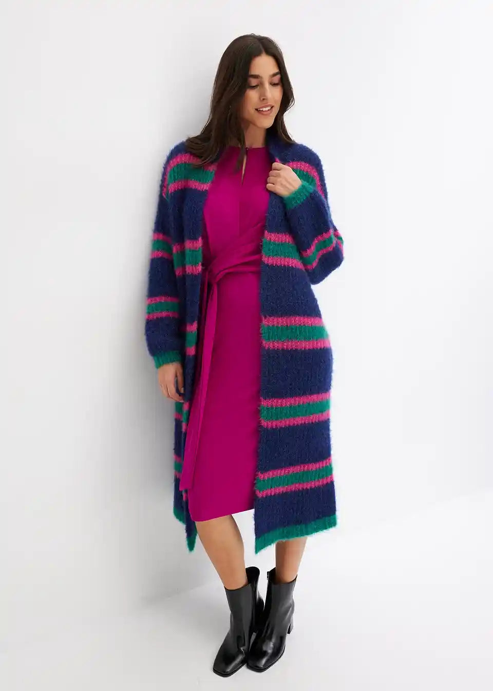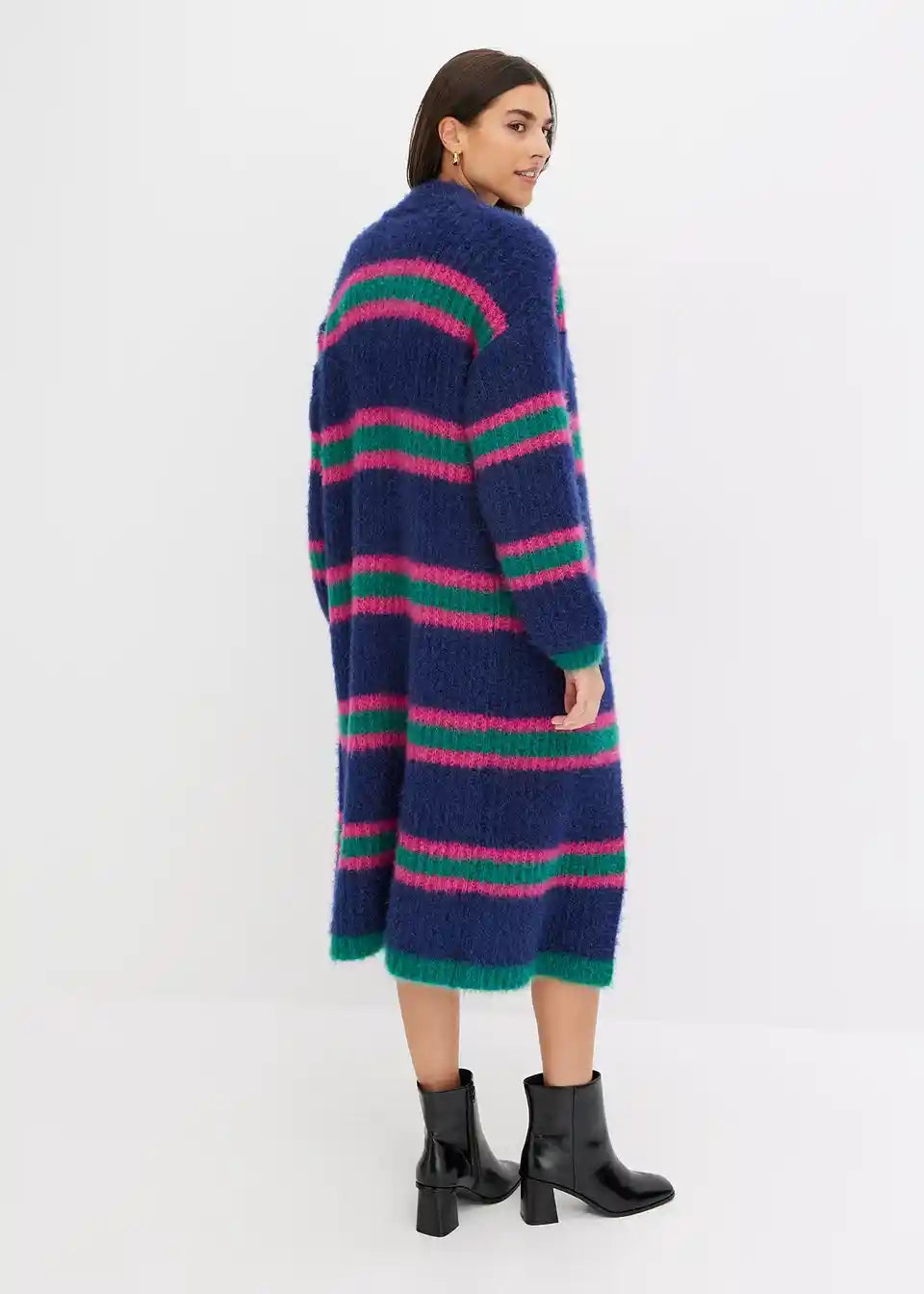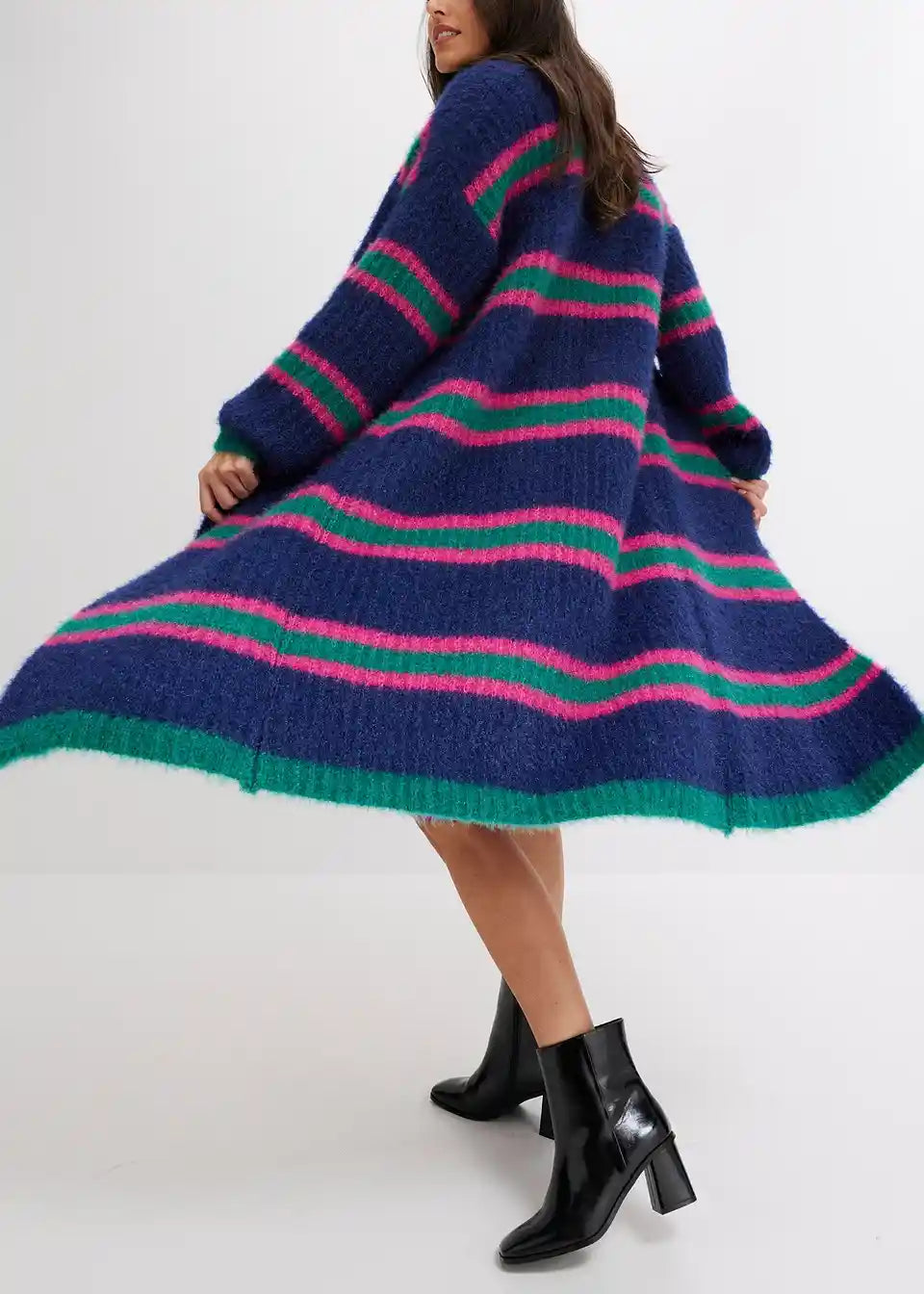 Moderan i ženstven: Oversized-pleteni kaput s pahuljastom pređom i prugama.