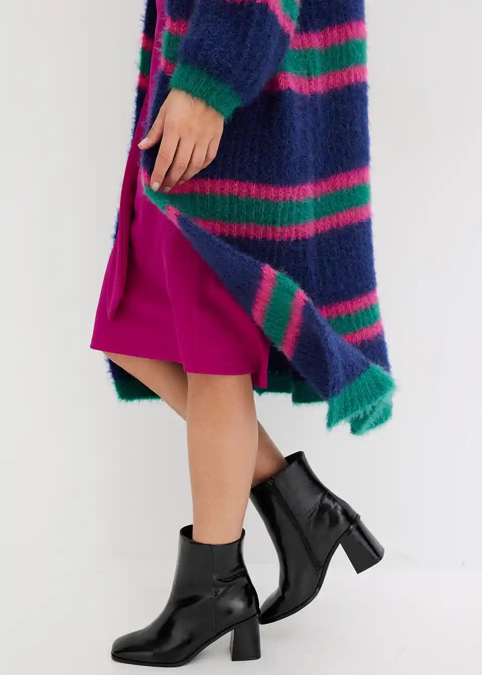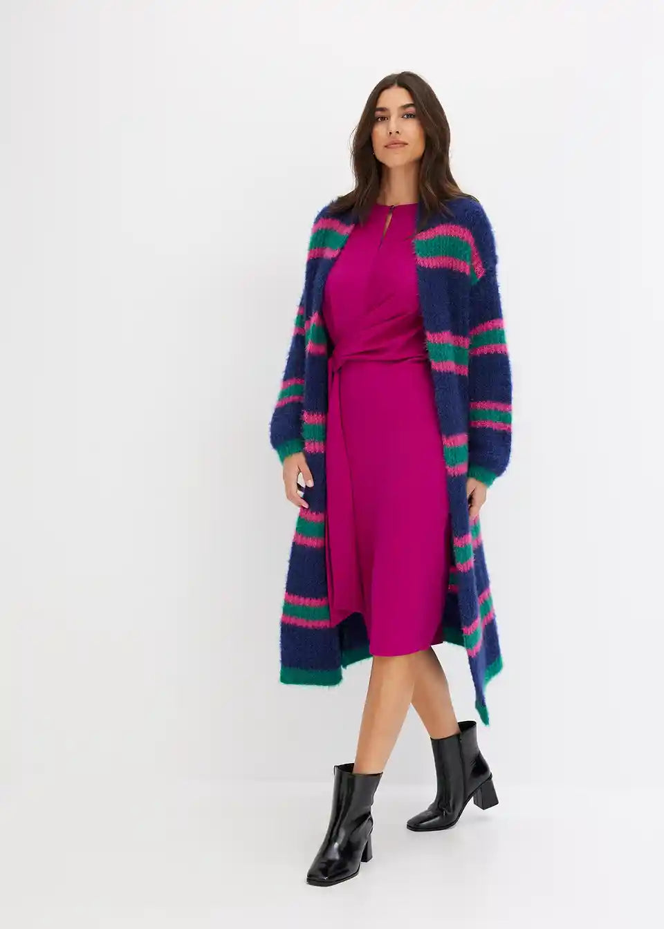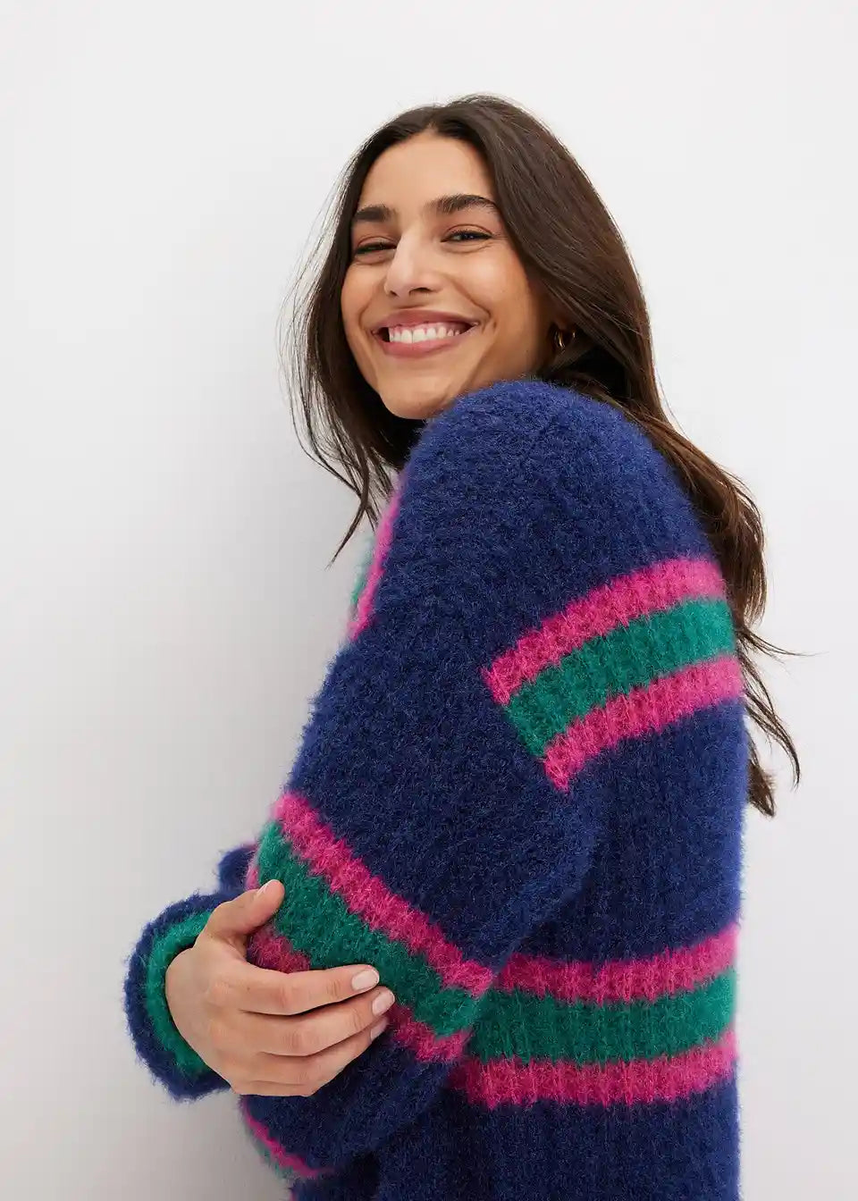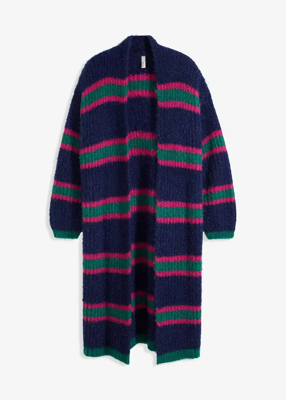 Moderan i ženstven: Oversized-pleteni kaput s pahuljastom pređom i prugama.