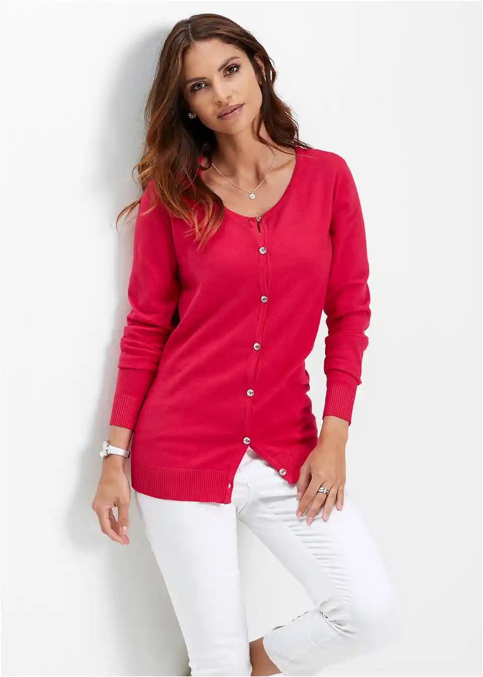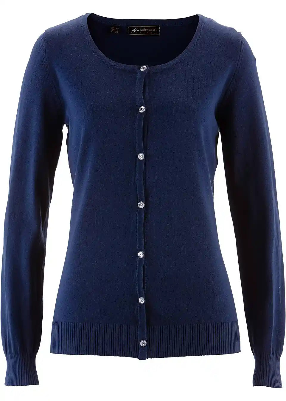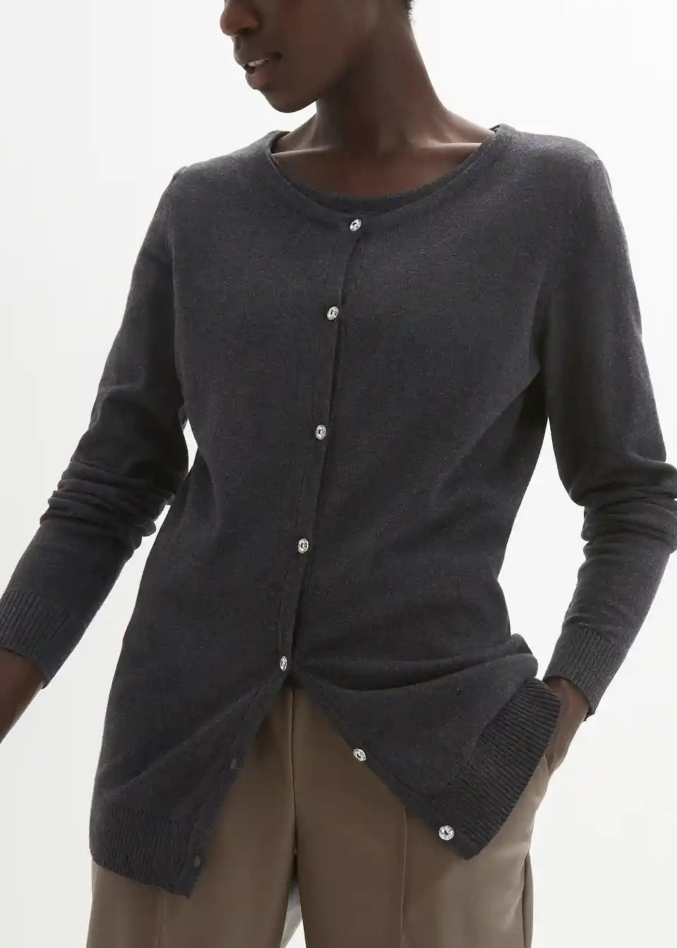 usko krojen, s dekorativnim gumbima s efektom kristala, okrugli izrez, duljina od cca 64 cm (vel. 36/38) do cca 74 cm (vel. 56/58), periv u perilici rublja,