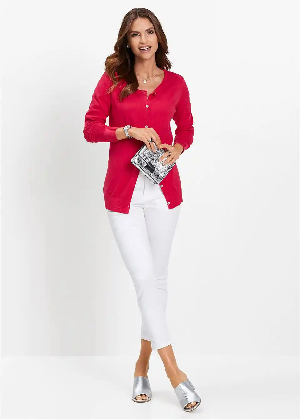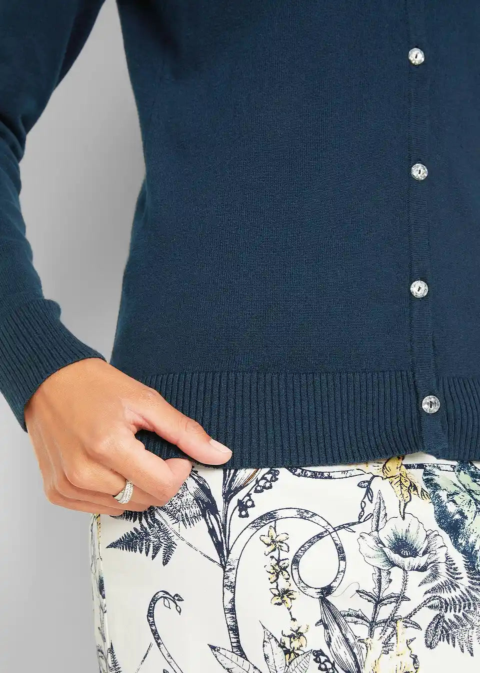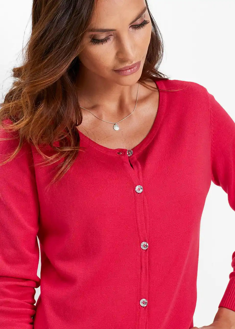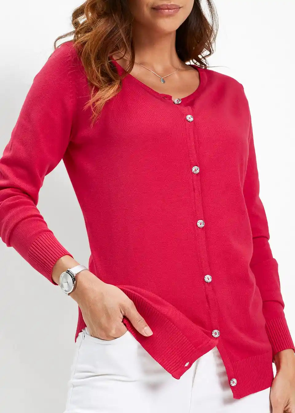 usko krojen, s dekorativnim gumbima s efektom kristala, okrugli izrez, duljina od cca 64 cm (vel. 36/38) do cca 74 cm (vel. 56/58), periv u perilici rublja,