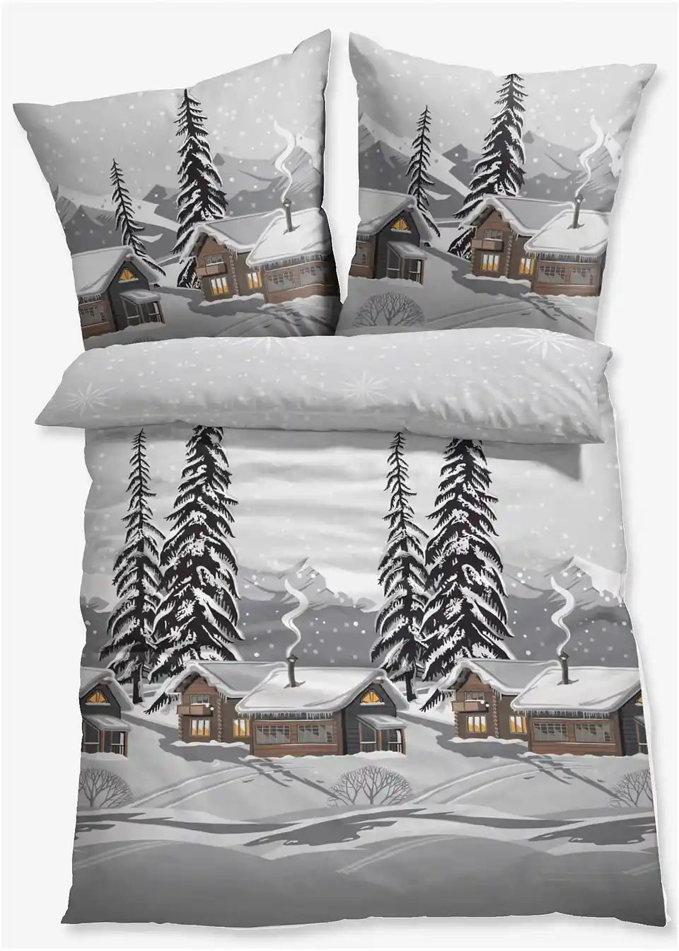 Posteljina s planinskom kućicom u snježnom krajoliku