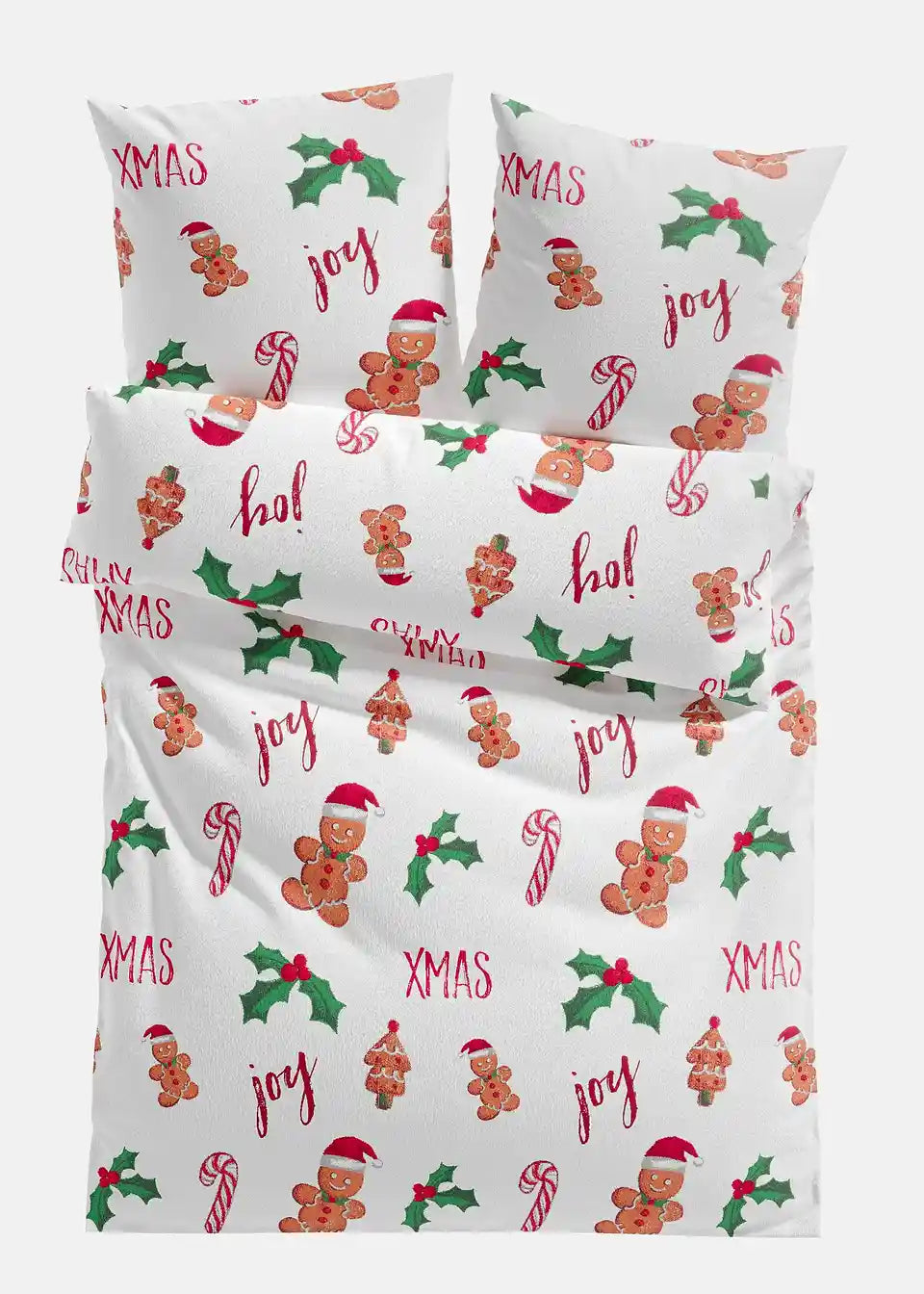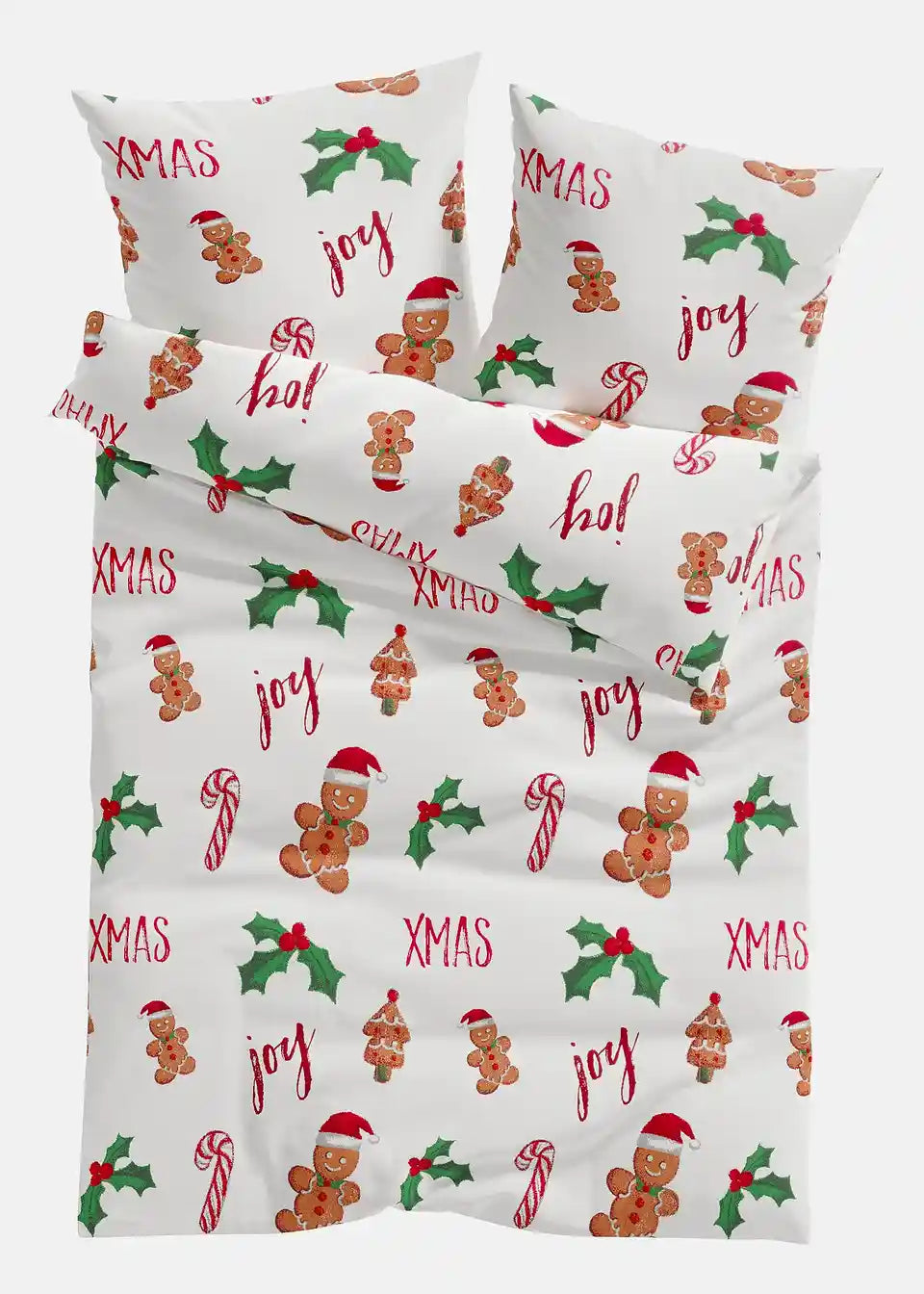 Posteljina s motivom čovječuljka od medenjaka i štapićima od šećera unosi božićni ugođaj u spavaću sobu.