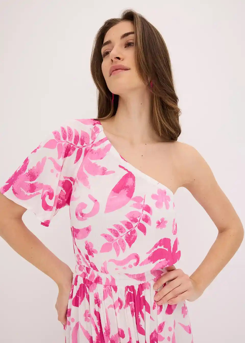 cvjetno printana haljina na jedno rame midi dužine od strukturirane viskoze sa širokim lepršavim rukavom i volanom na rubu suknje