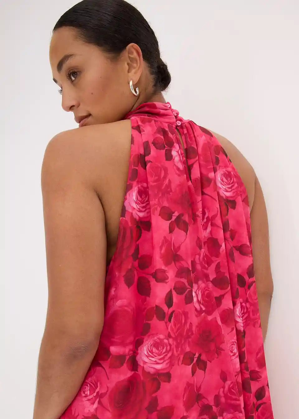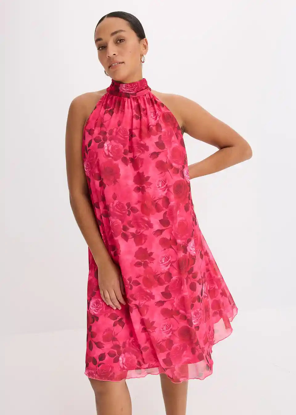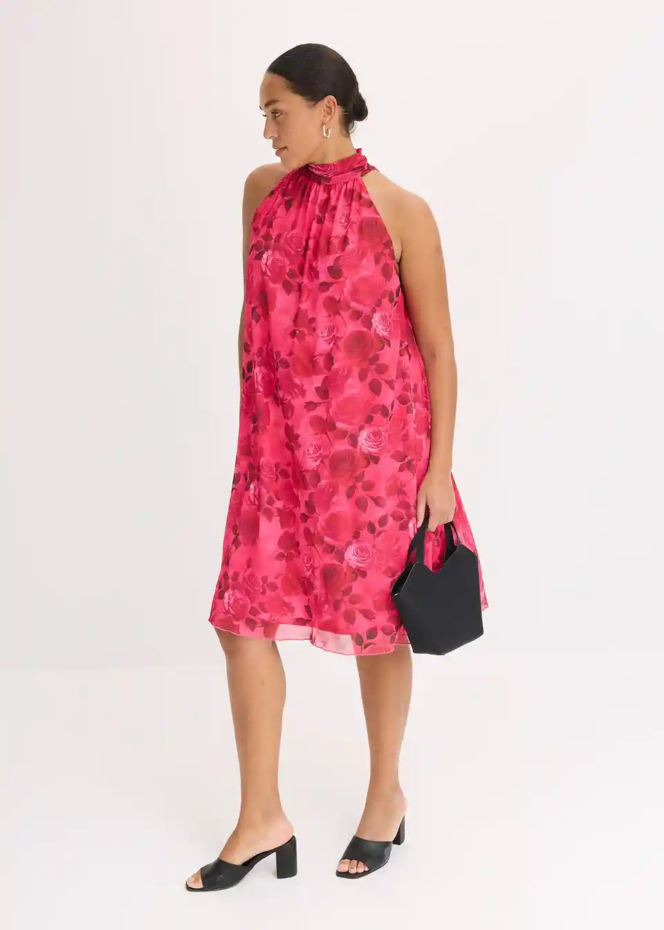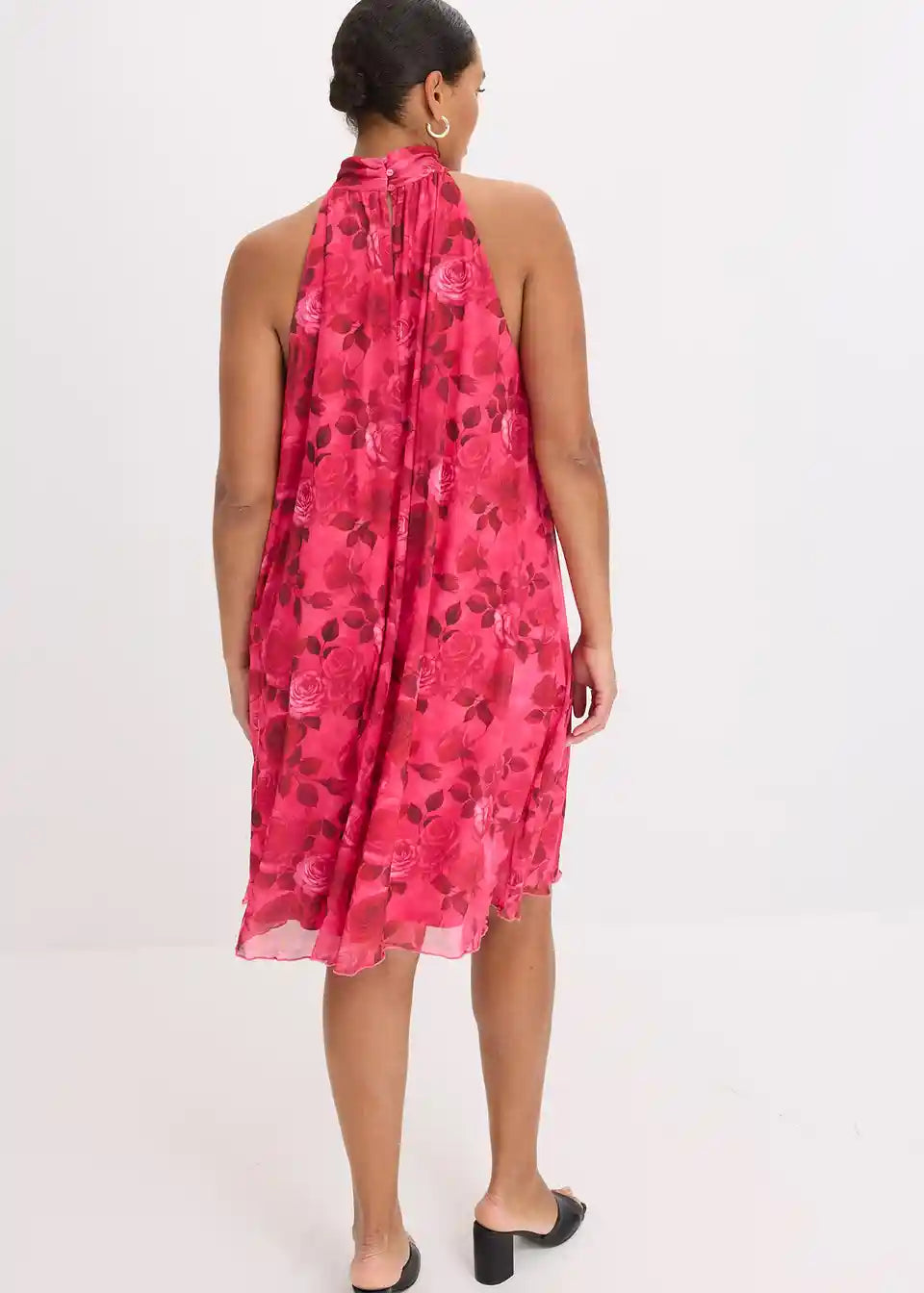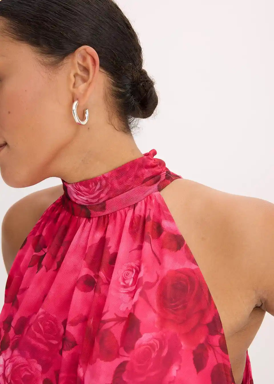 kratka haljina od meke mrežaste tkanine s cvjetnim printom i kopčanjem na gumb straga na izrezu