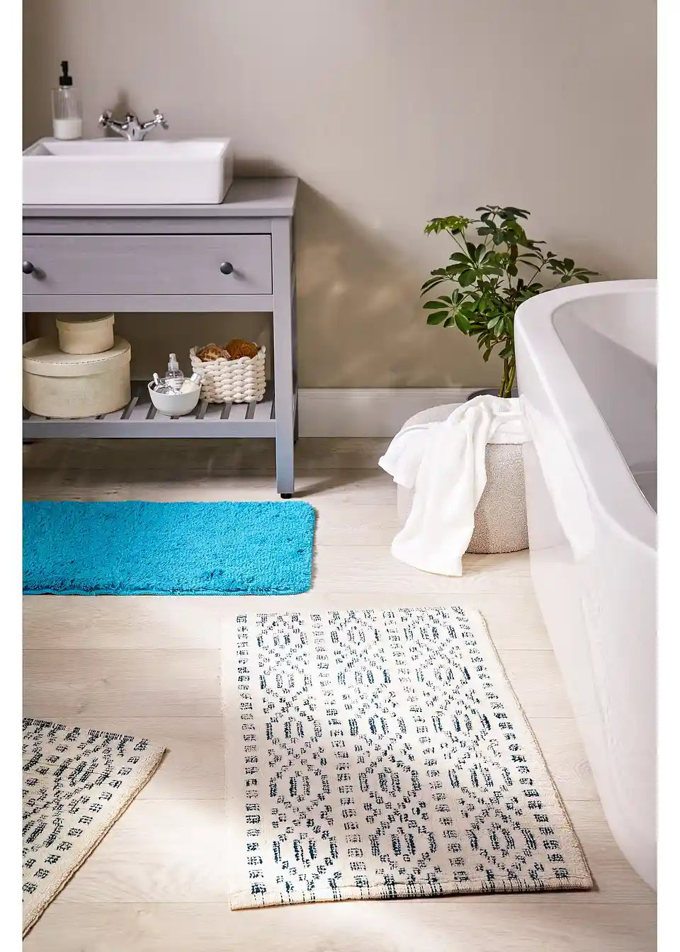 Ručno tkana prostirka za kupaonicu, periva na 30°C, donja strana protuklizna, pogodna za podno grijanje.