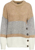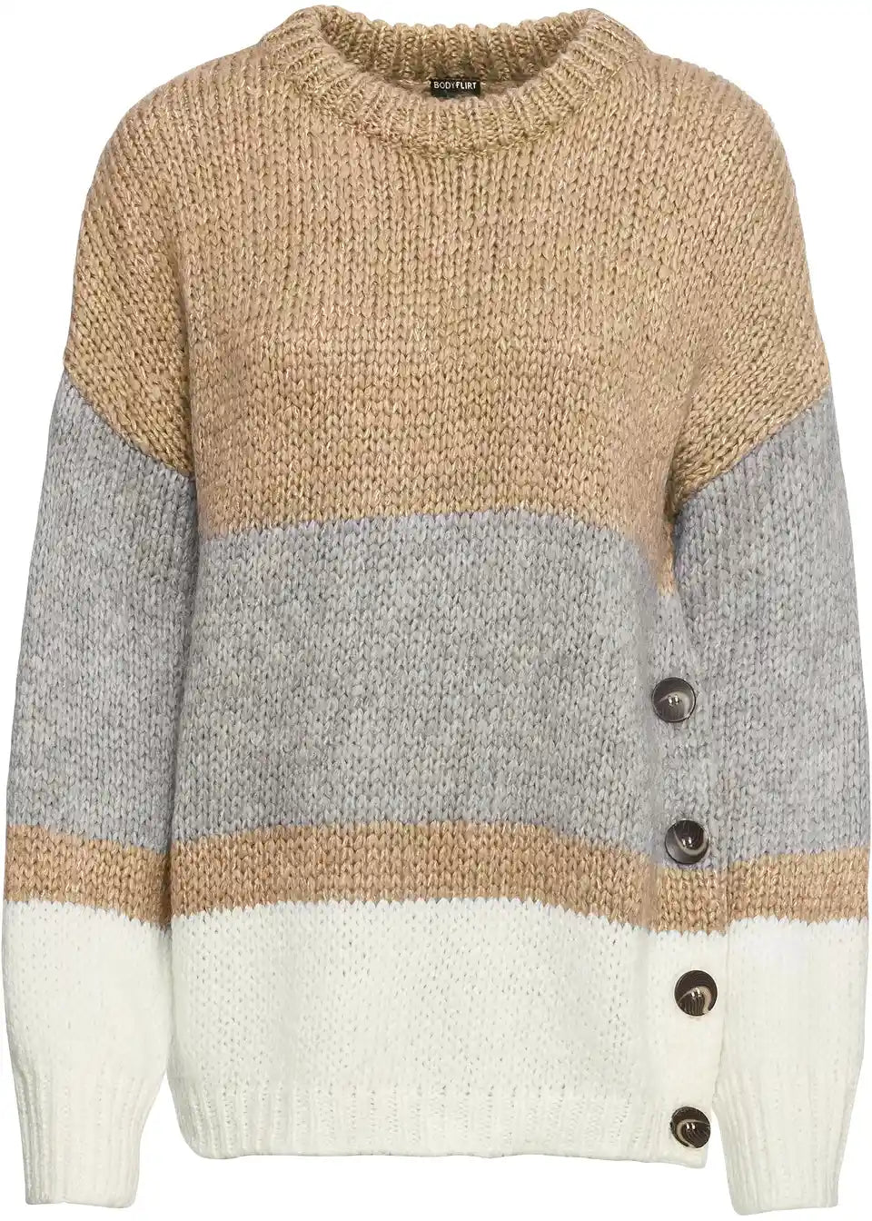 Prugasti oversized pulover s gumbima brenda Bodyflirt. Pulover ima okrugli izrez i rubove od rebrastog pletiva na izrezu, završetku rukava i porubu. Vizualna dužina u veličini 36/38 je cca 68 cm.