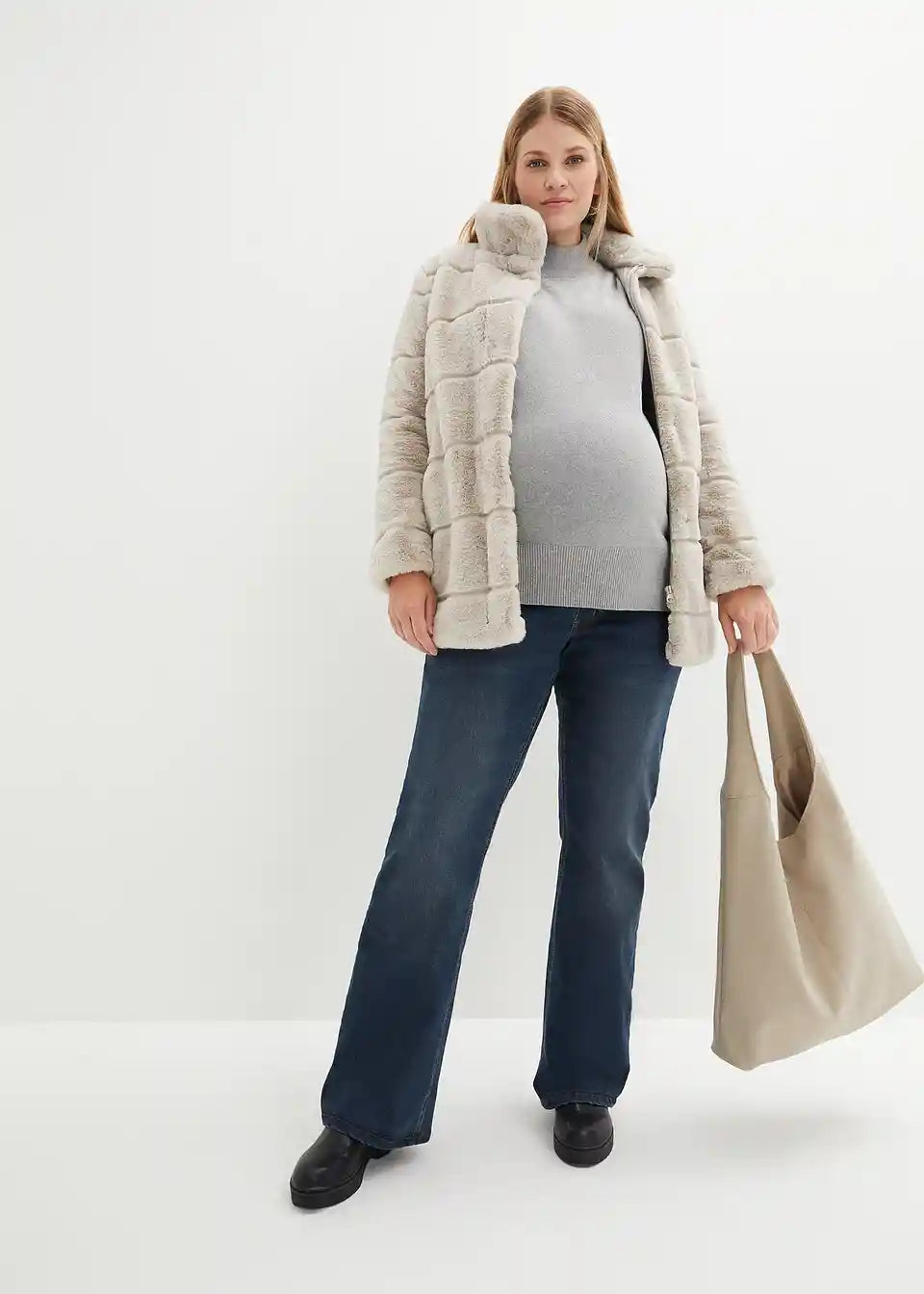 Jakna od umjetnog krzna s patentnim zatvaračem duž cijele duljine. Bočni patentni zatvarači omogućuju fleksibilnu prilagodbu širine, tako da se jakna može nositi i tijekom trudnoće i nakon nje. Napomena: Materijal se može lagano linjati. Kako biste to smanjili, preporučujemo da jaknu operete na nježnom ciklusu prije prvog nošenja ili je obradite četkom za dlačice.