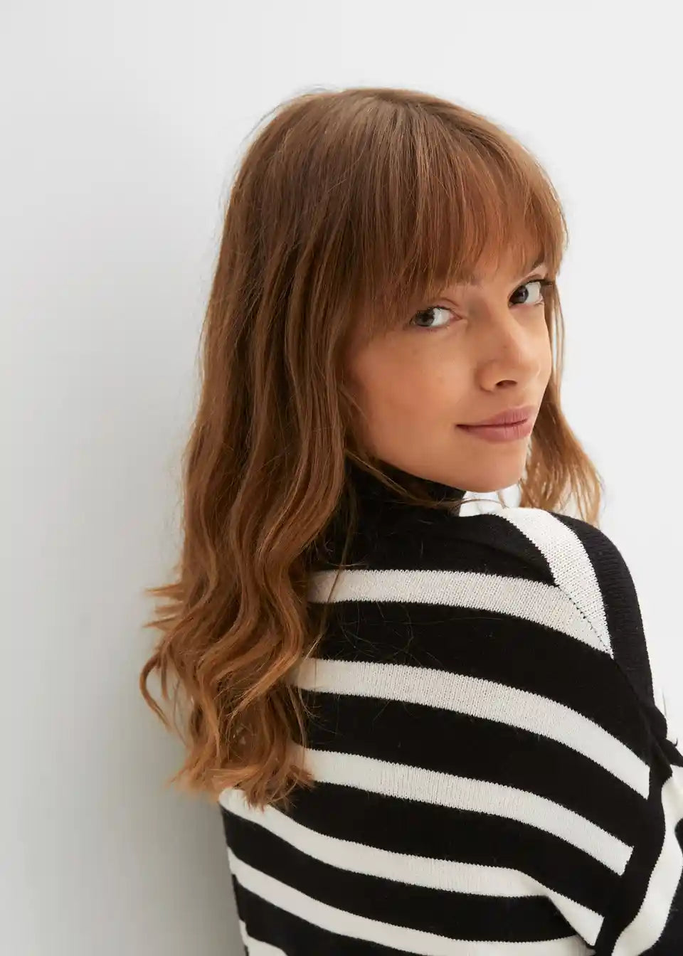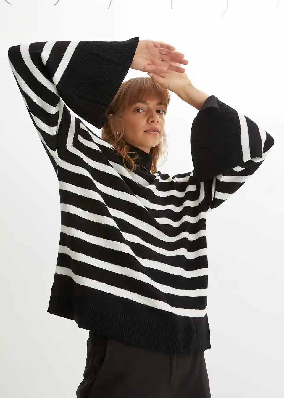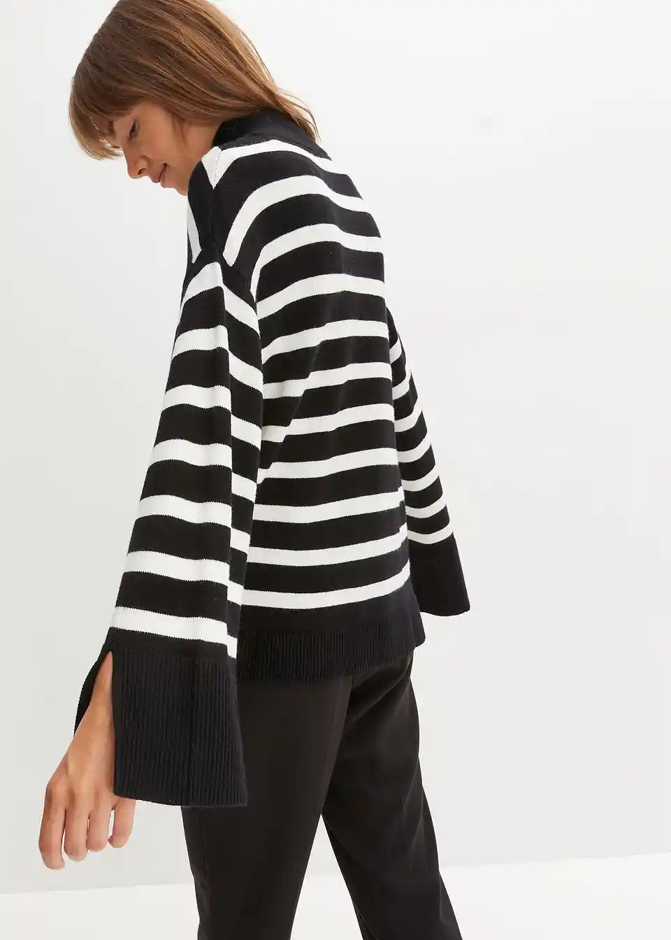 Ganz softer, weicher Pulli, toller Schnitt, normale Länge. Die offenen Ärmel sind allerdings gewöhnungsbedürftig. Ich habe ihn eine Nummer kleiner bestellt, passt super. Würde ich auf jeden Fall wieder bestellen.