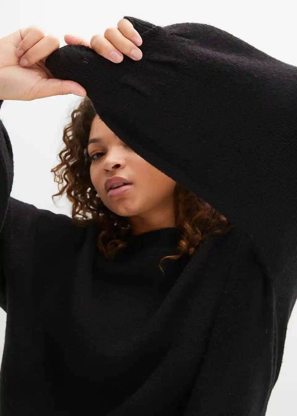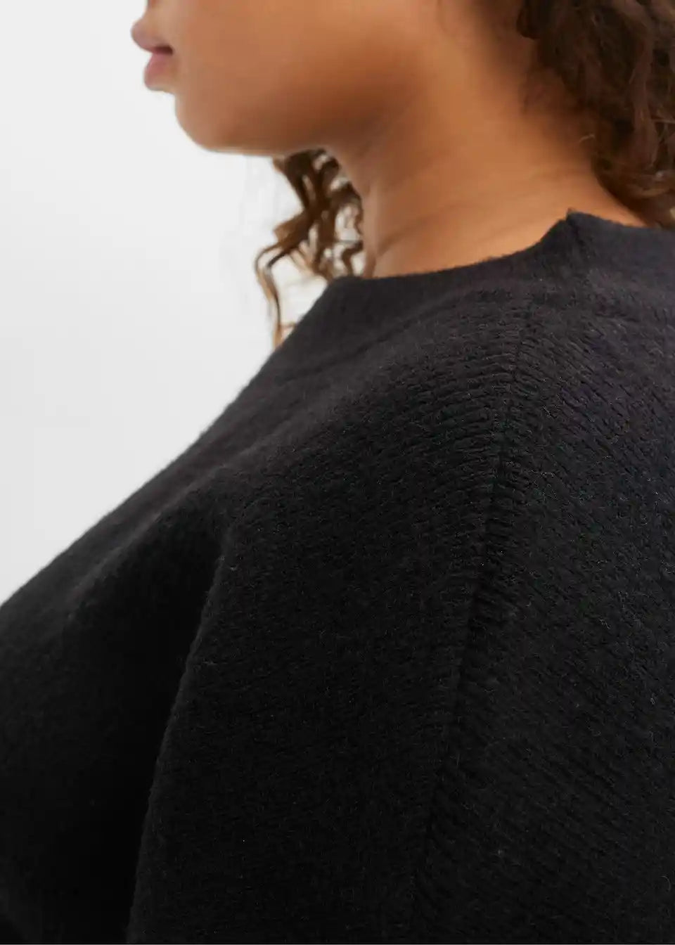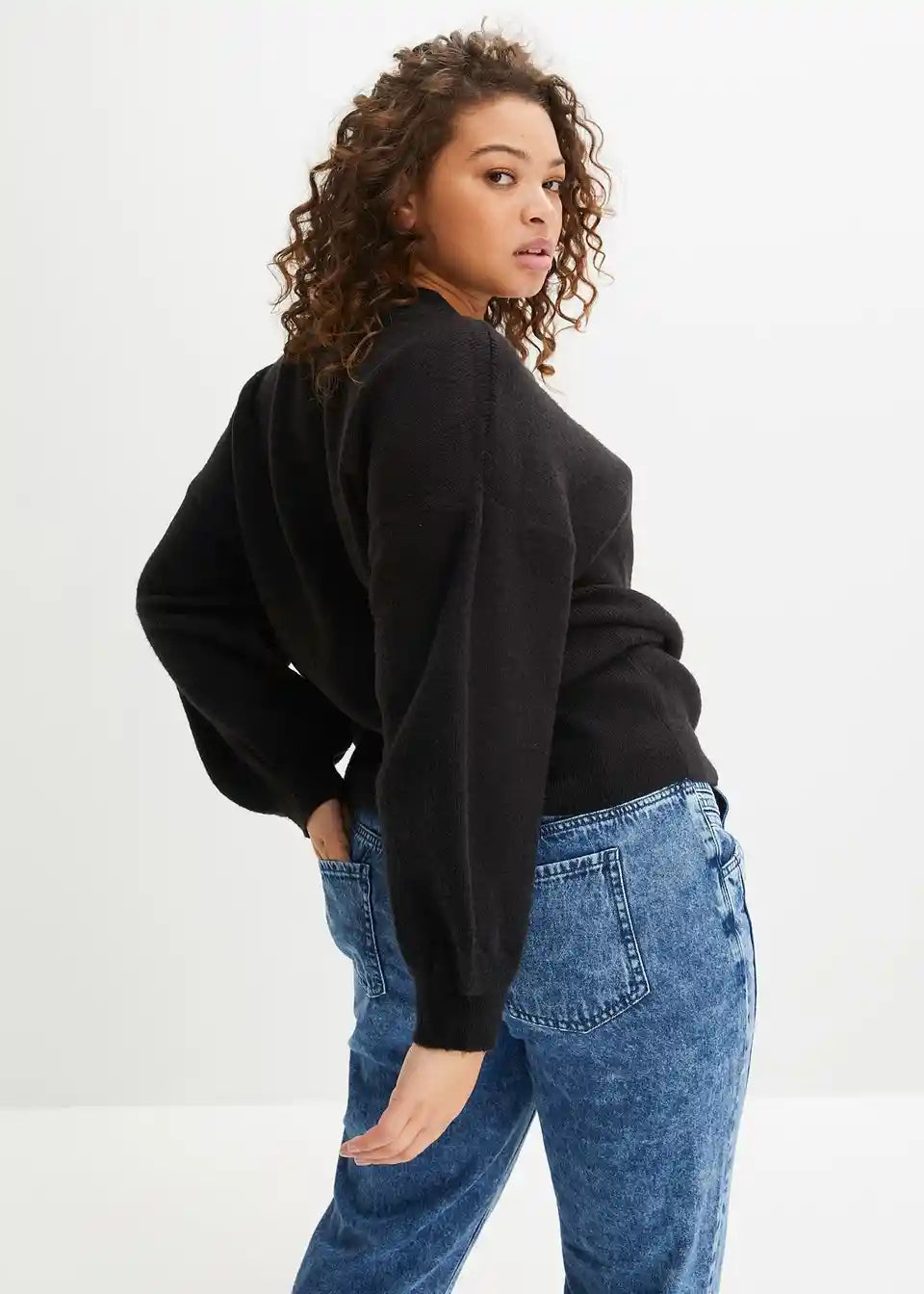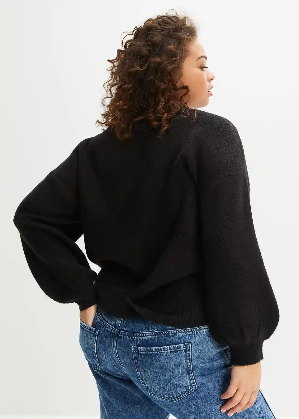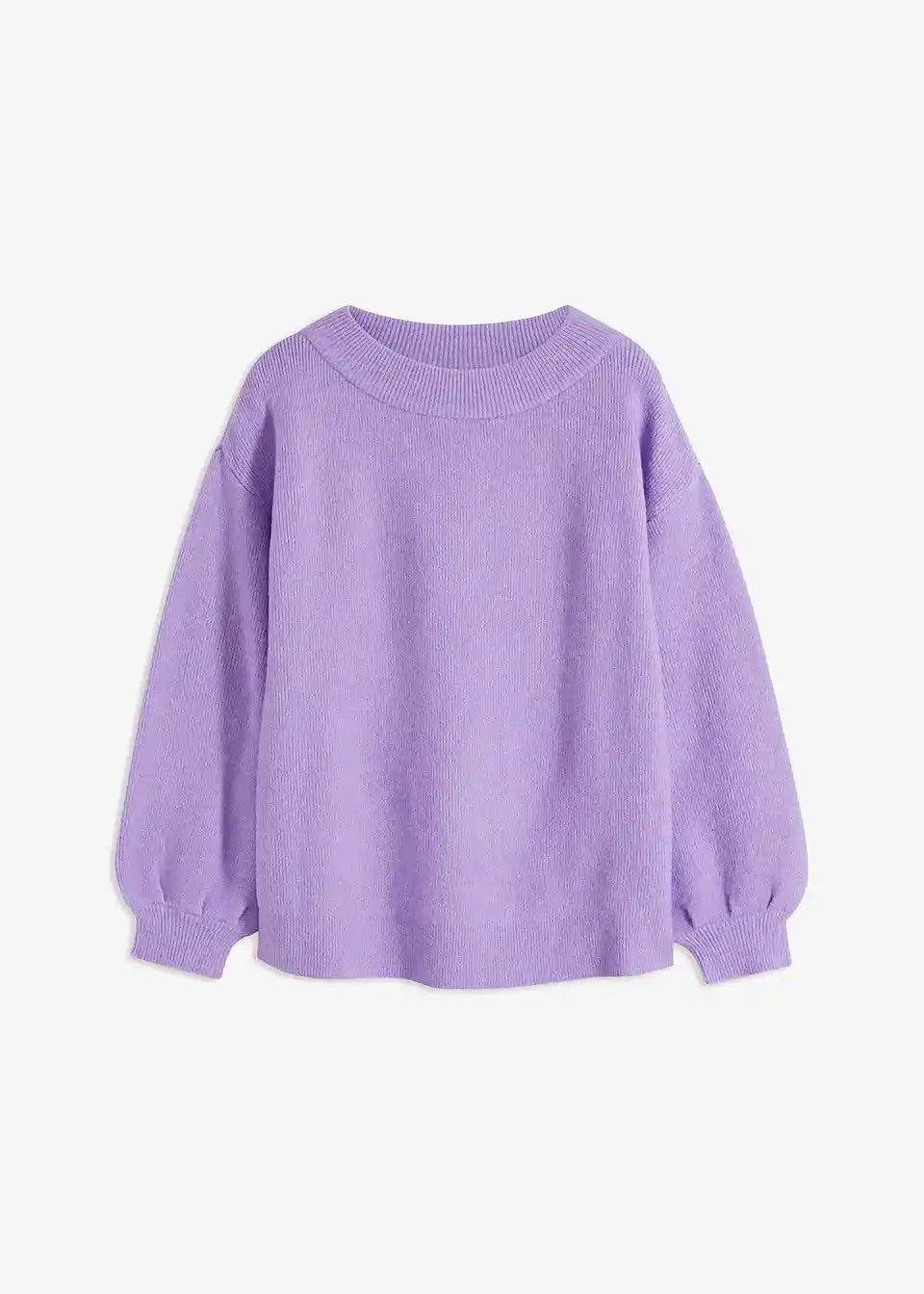Atraktivni pleteni pulover s visokim okruglim izrezom i modernim balon rukavima