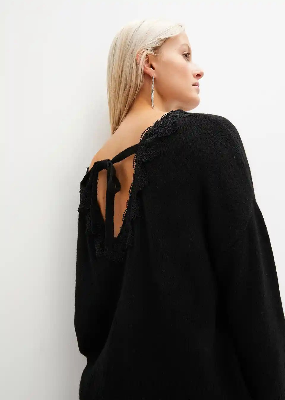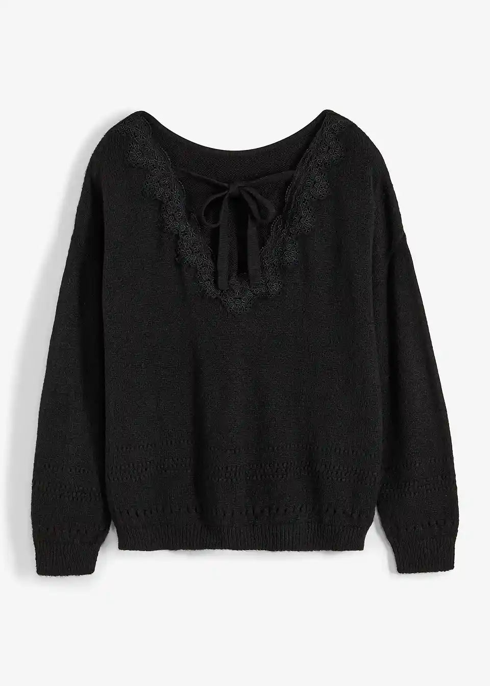 femininski pulover s dubljim V-izrezom i čipkom na leđima.
