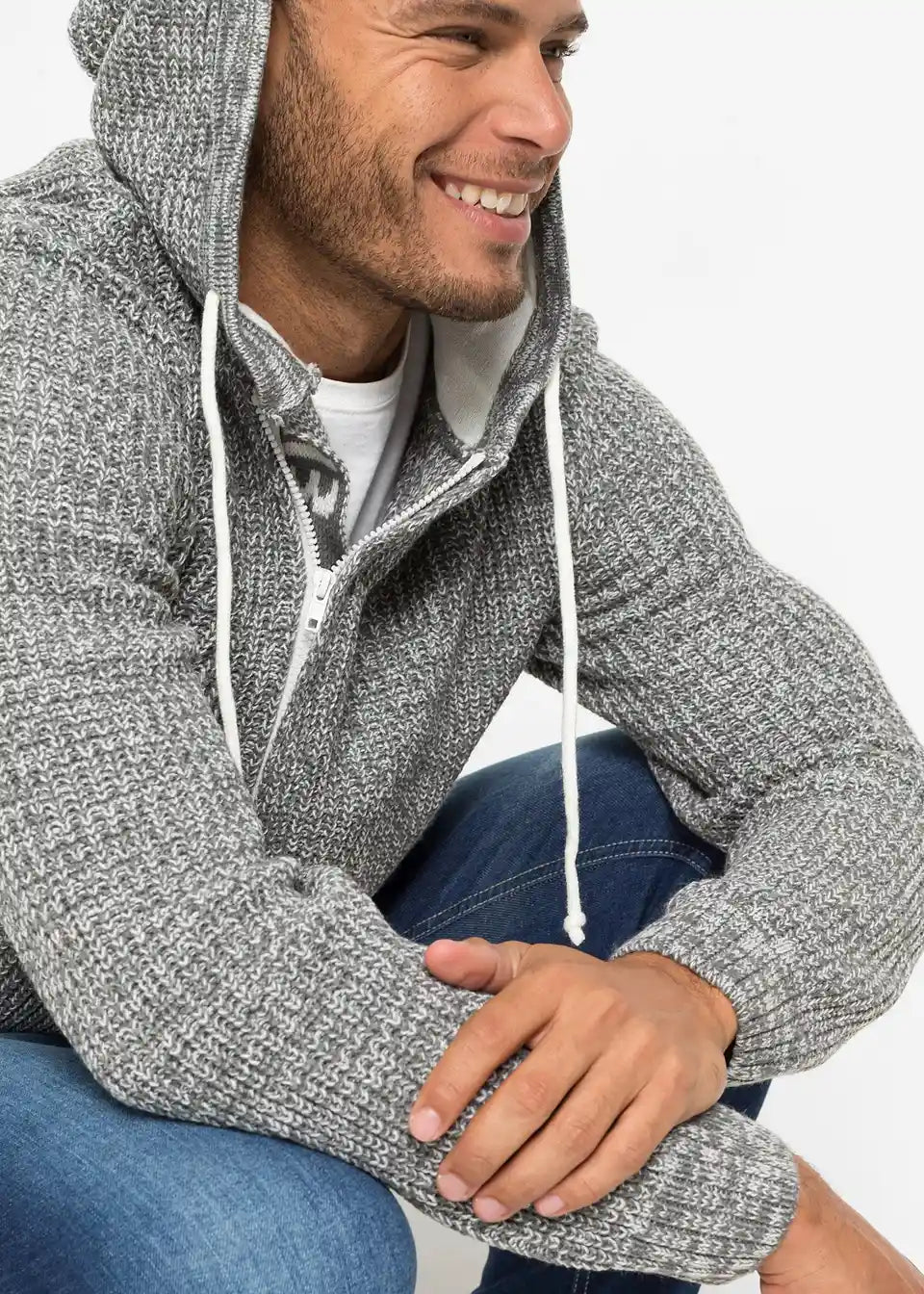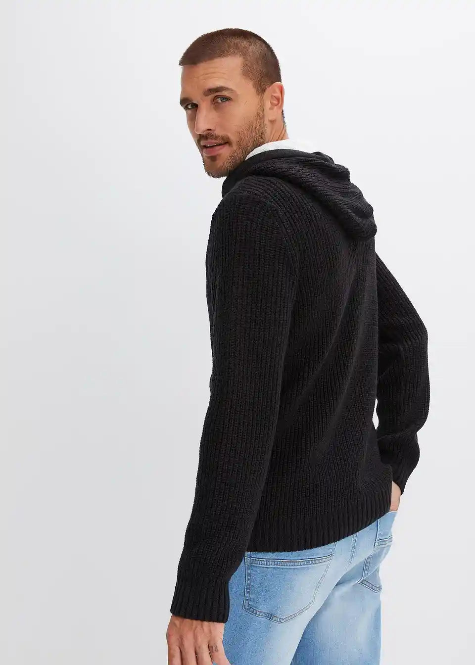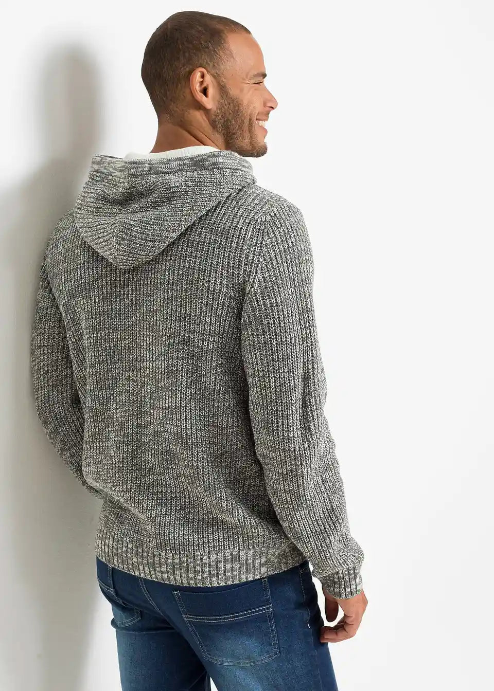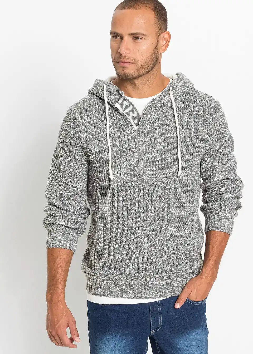Trendi pulover s većim izrezom i kapuljačom.