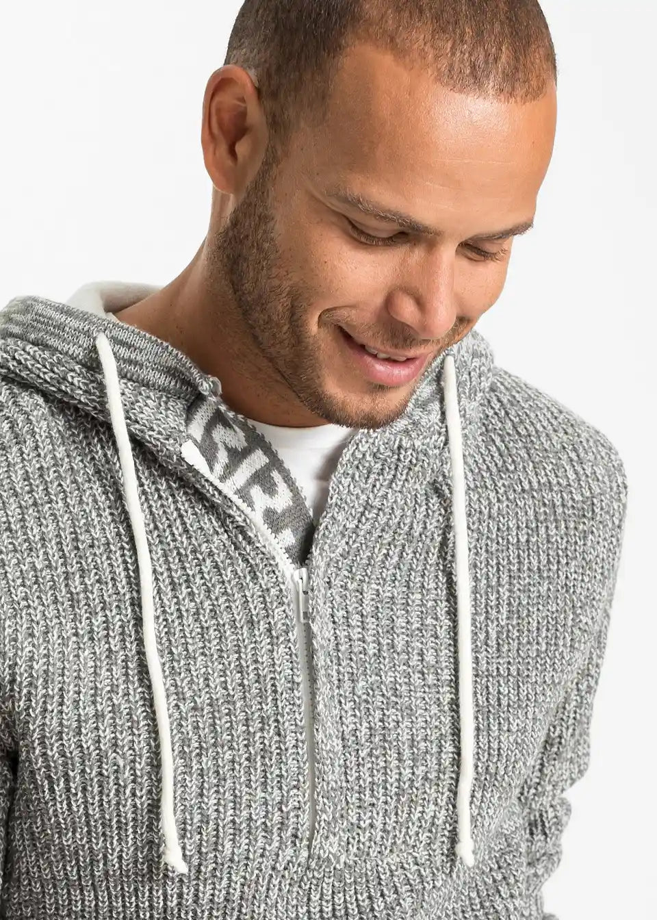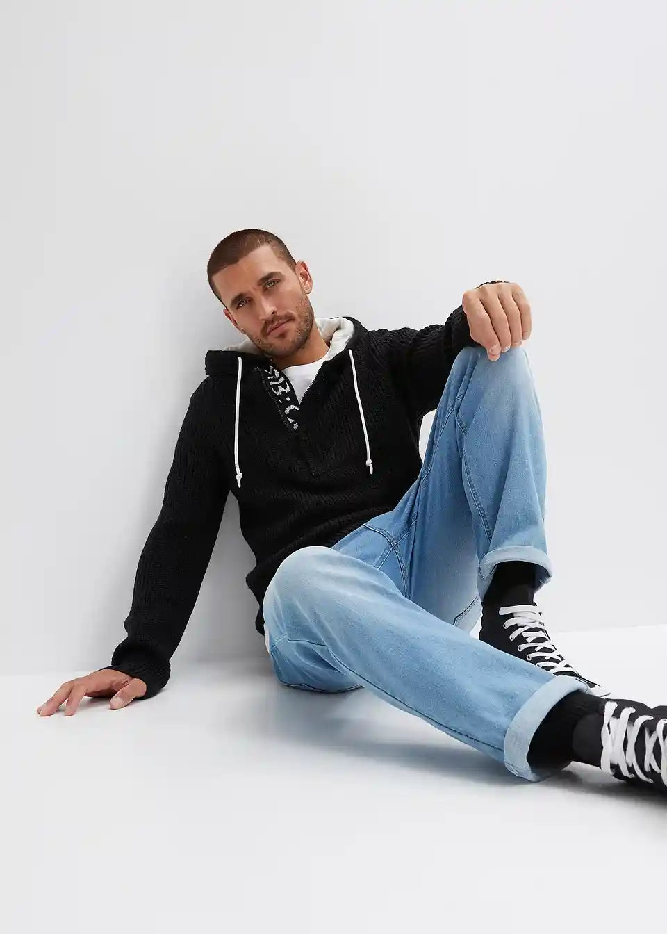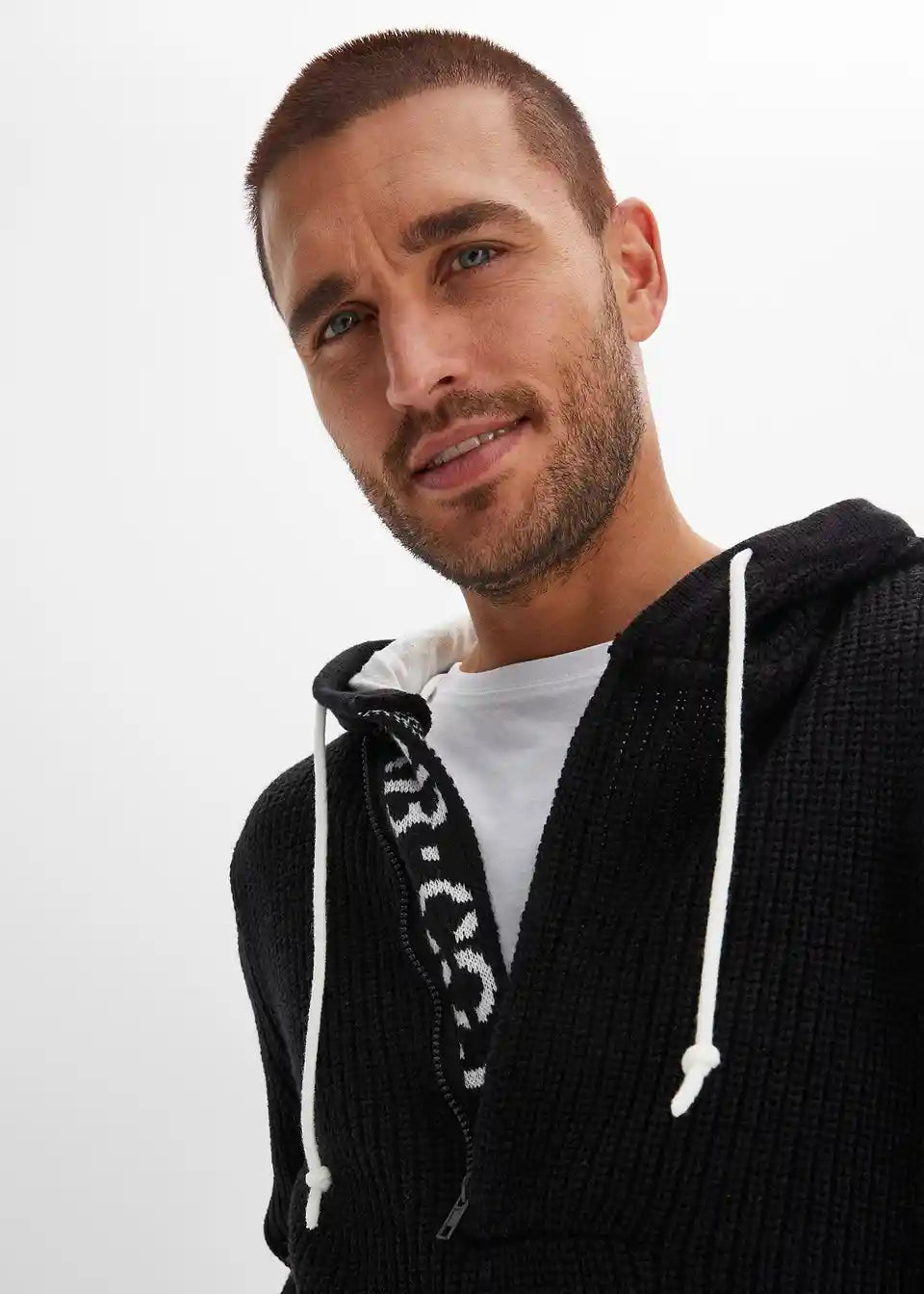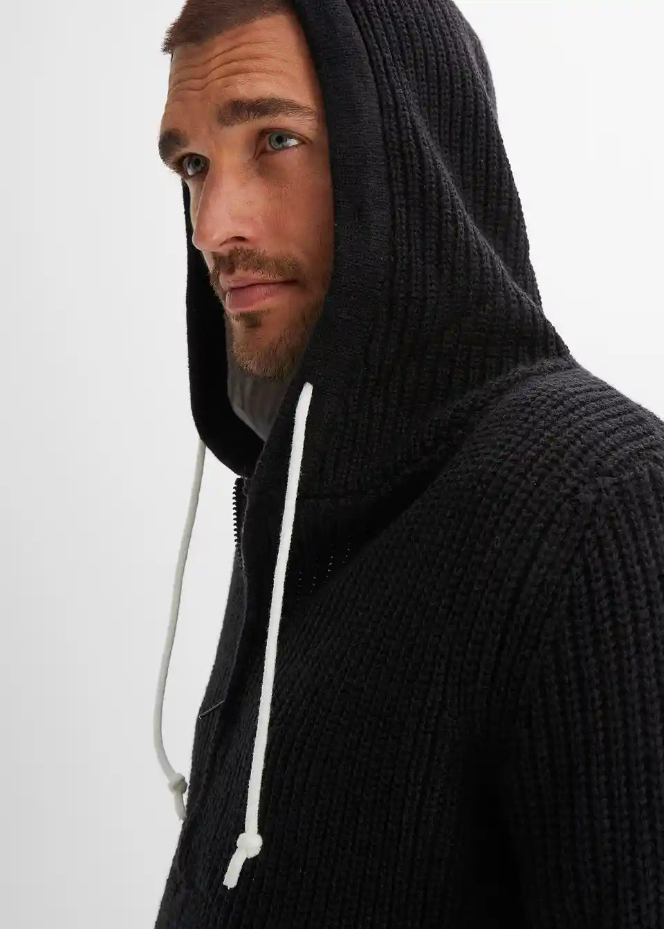 Trendi pulover s većim izrezom i kapuljačom.