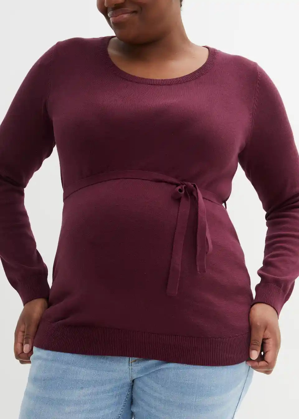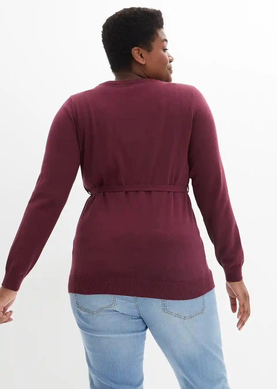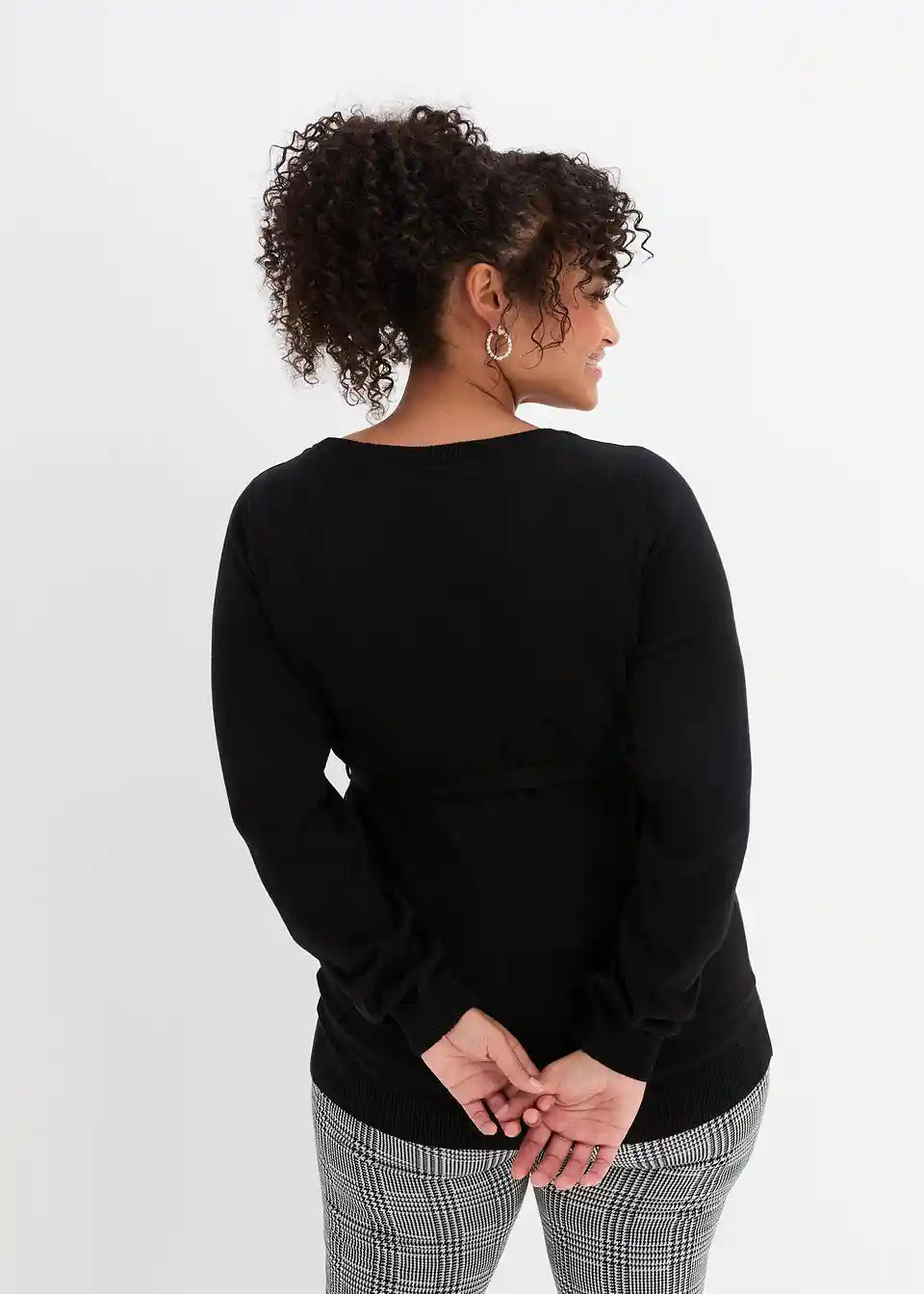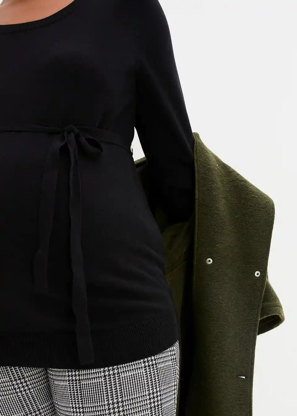 Pulover od mekanog pamučnog pletiva s okruglim izrezom, dugim rukavima i uklonjivom vezicom. Ravan rub i rebrasti rubovi na izrezu, rukavima i donjem rubu.