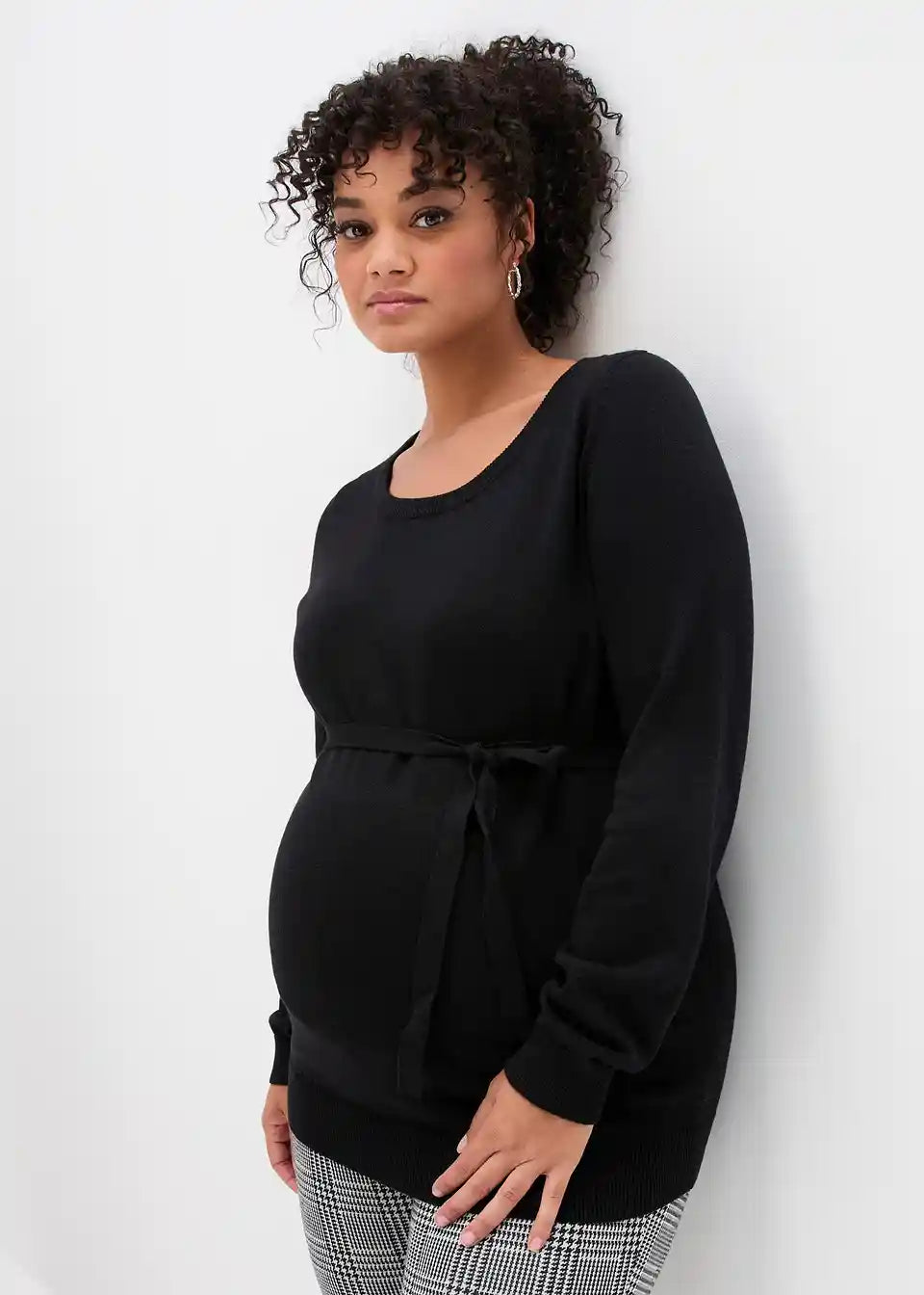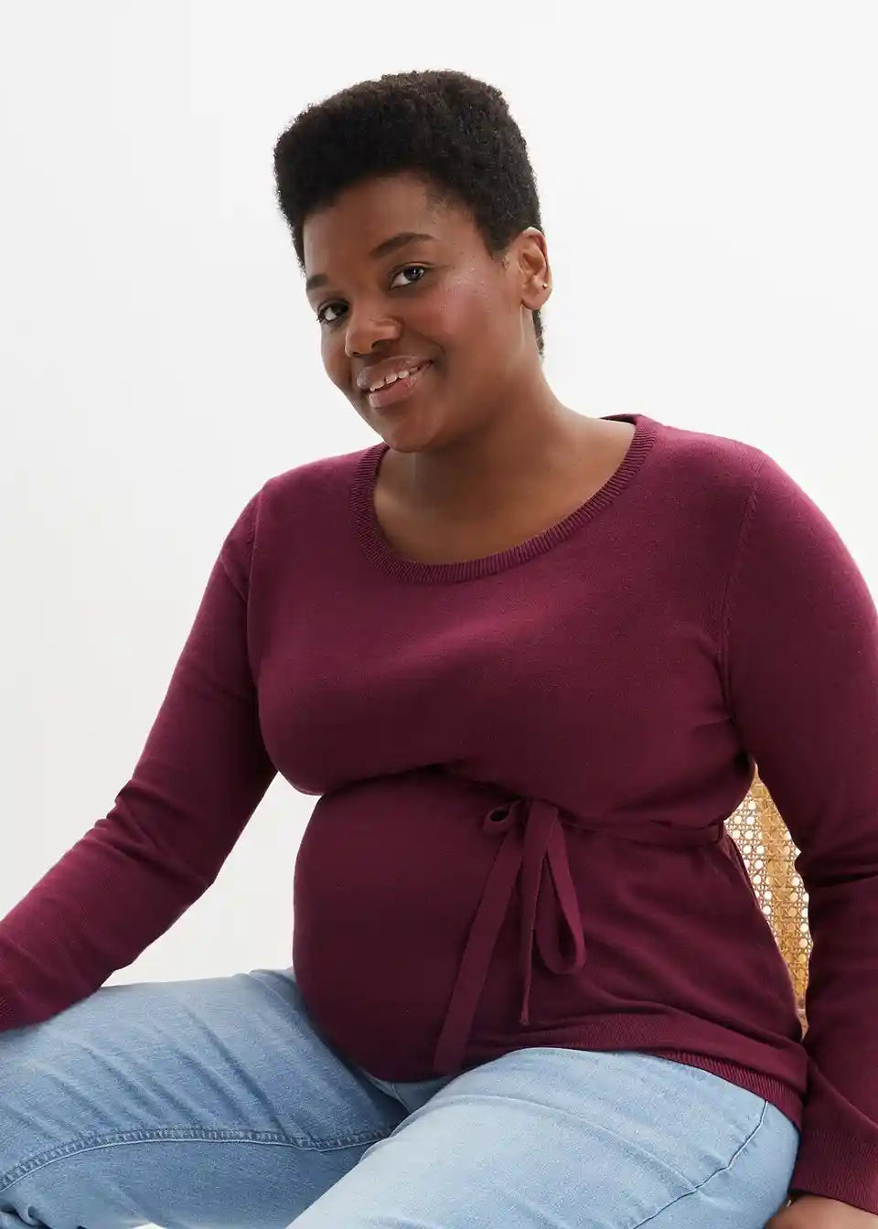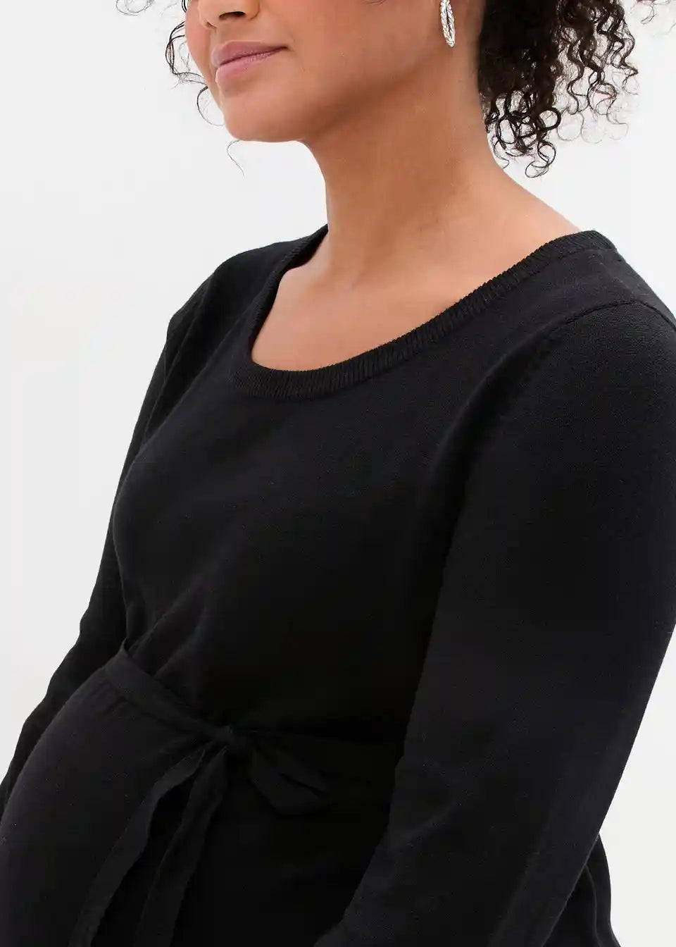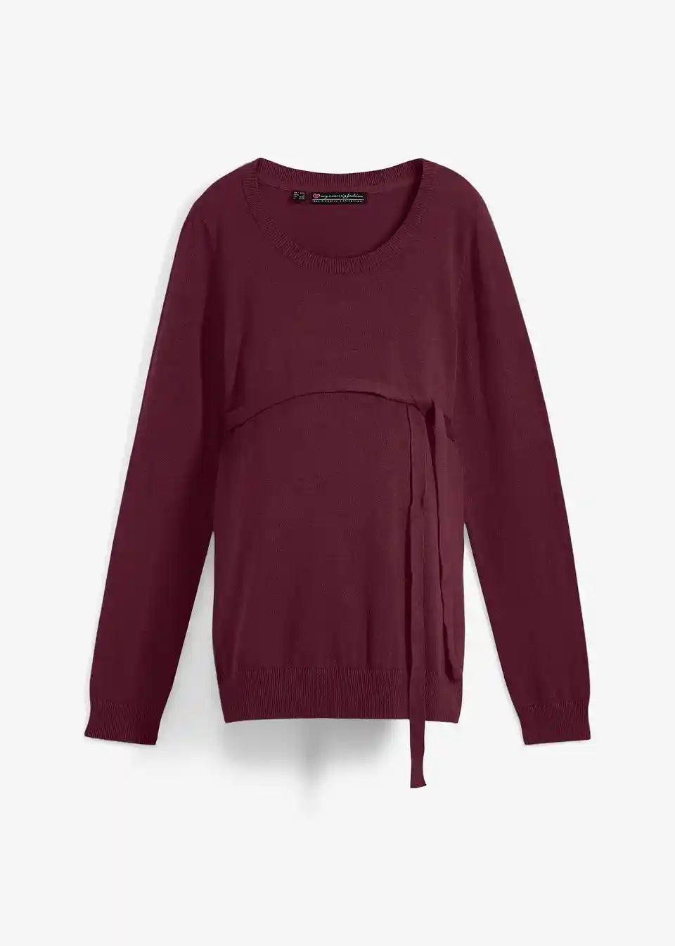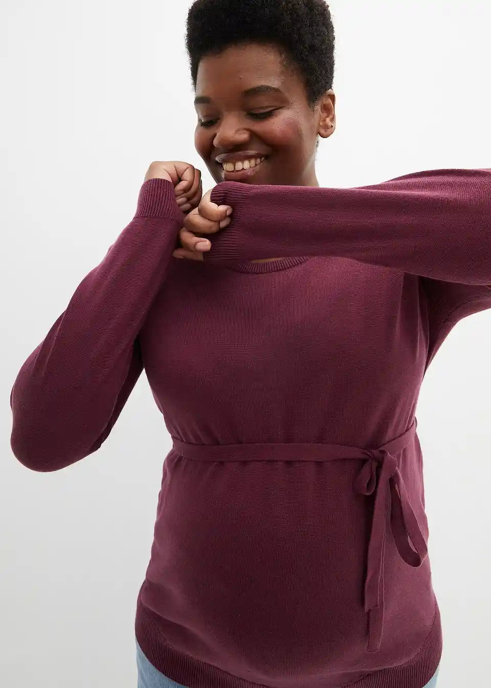 Pulover od mekanog pamučnog pletiva s okruglim izrezom, dugim rukavima i uklonjivom vezicom. Ravan rub i rebrasti rubovi na izrezu, rukavima i donjem rubu.
