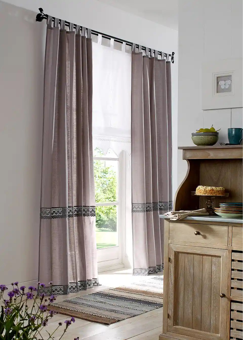 Ova prekrasna Raffrollo zavjesa u rustikalnom stilu privlači sve poglede zahvaljujući mnogim detaljima. Izrađena je od poluprozirne poliesterske tkanine: Pažljivo izrađeni rub dolazi do izražaja zahvaljujući kukičanom umetku i obrubi. Prikladni resice još su jedan lijep detalj i vješto zaokružuju cjelokupni izgled. Molimo skinite resice prije pranja.