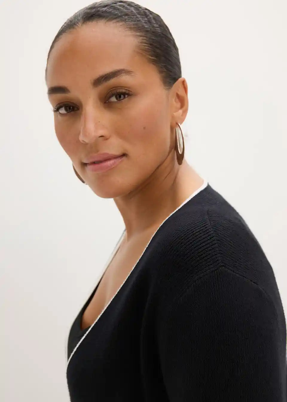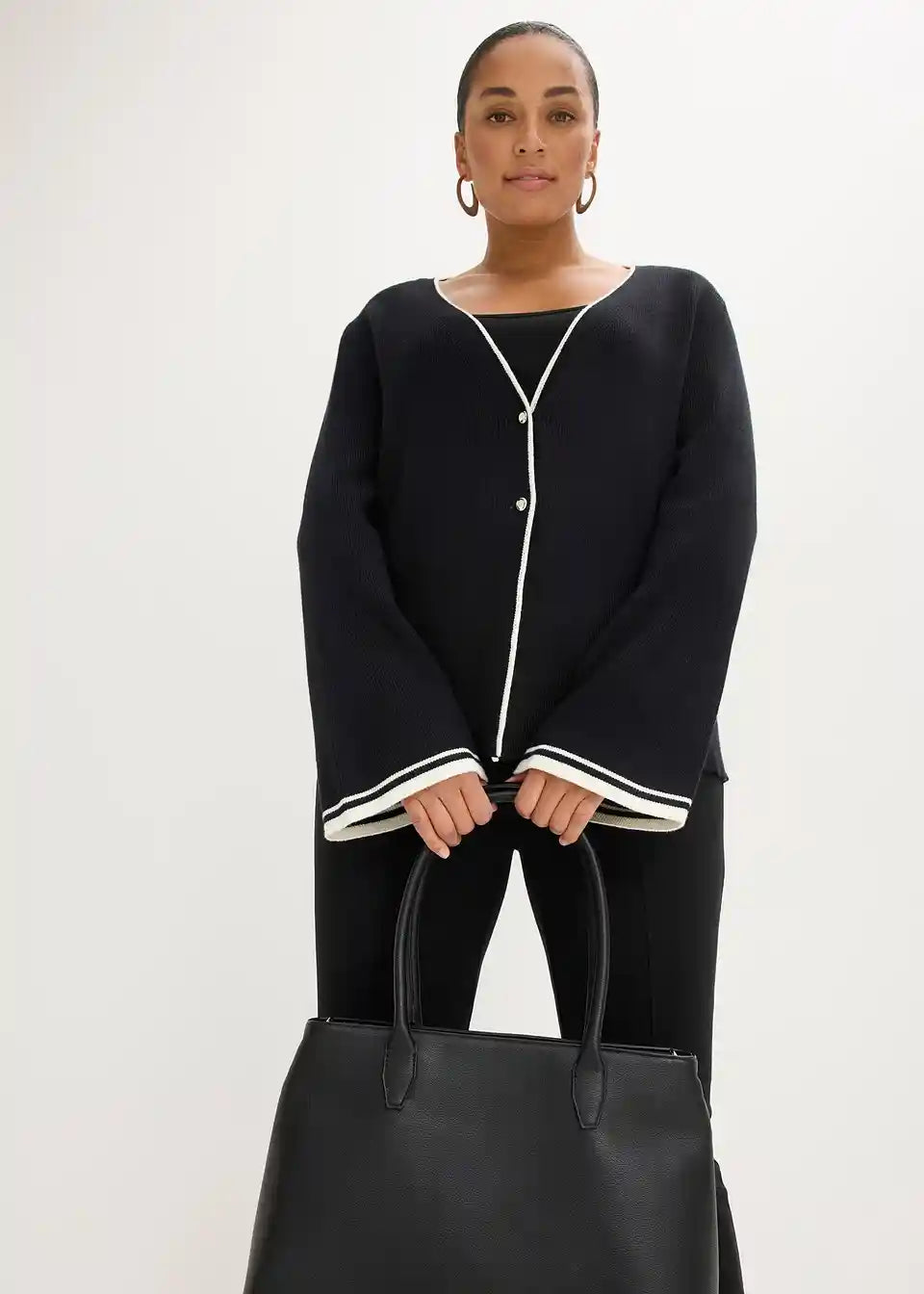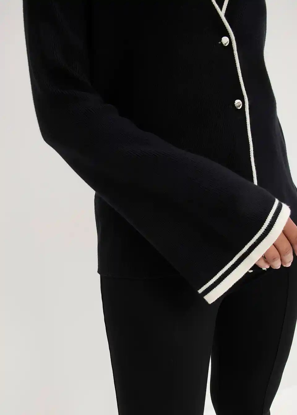 Moderna pletena jakna s modernim kontrastnim cjevovodom i visokokvalitetnim gumbima