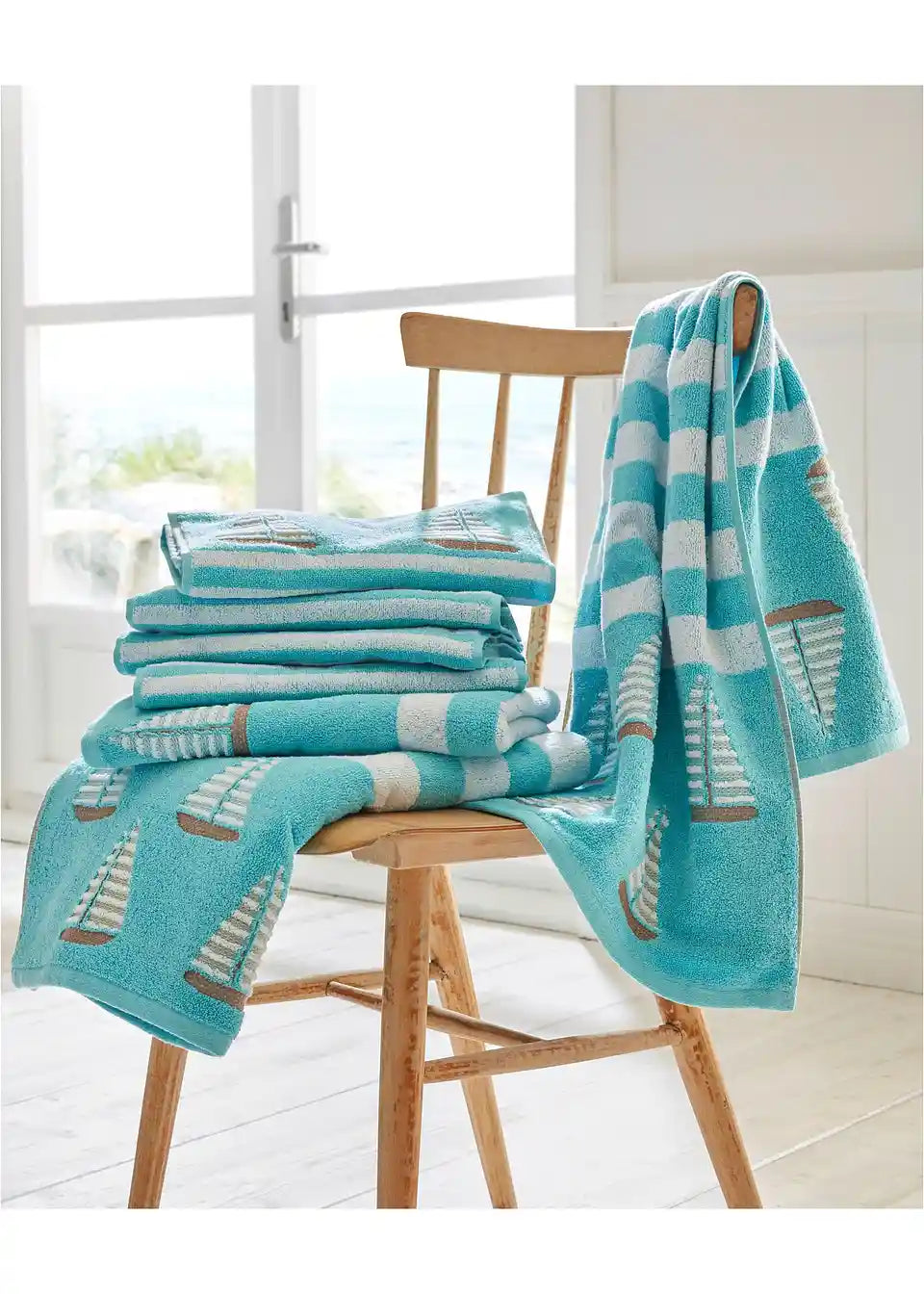 Ručnik s motivom broda, periv na 60°C, ugodan mekan i kvalitetno upijajući materijal.