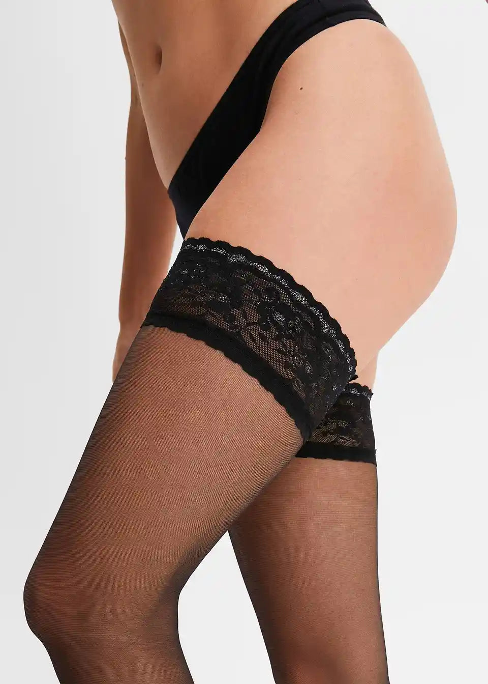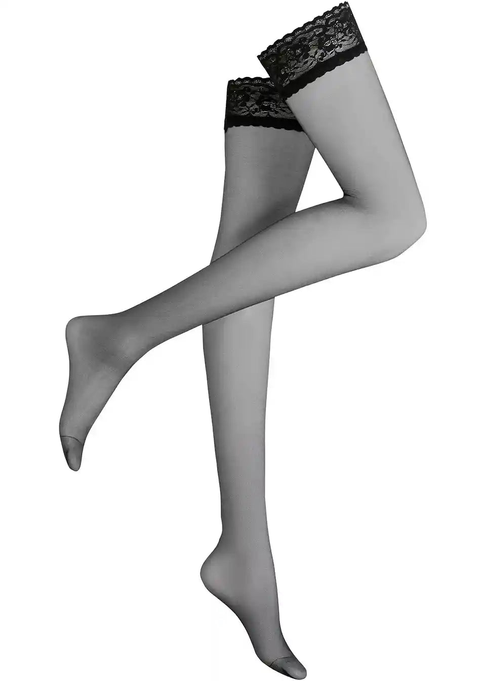 Samostojeće čarape pružaju nositeljici osjećaj ženske elegancije. Srebrna efektna nit osigurava prekrasan sjaj i blistave efekte na čipkastom završetku ovih ženskih čarapa BODYFLIRT. Poluprozirne čarape savršene su za elegantnu večernju odjeću. Također izvrsno pristaju uz uredske kostime ili elegantne ženske haljine te pružaju osjećaj luksuza na koži.
