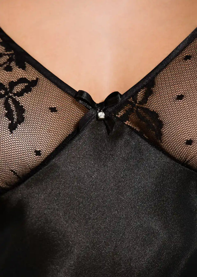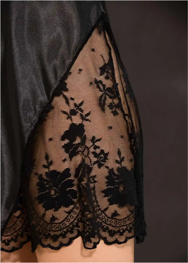 Ovaj prekrasni negliže očarava svojom floralnom vezom cvjetnih uzoraka, koja je umetnuta u području grudi i sa strane, te zahvaljujući prozirnosti zavodljivo prikazuje siluetu. Svileni materijal zbog svog mekanog pada senzualno oblikuje vaše obline i pruža visok nivo udobnosti pri nošenju.