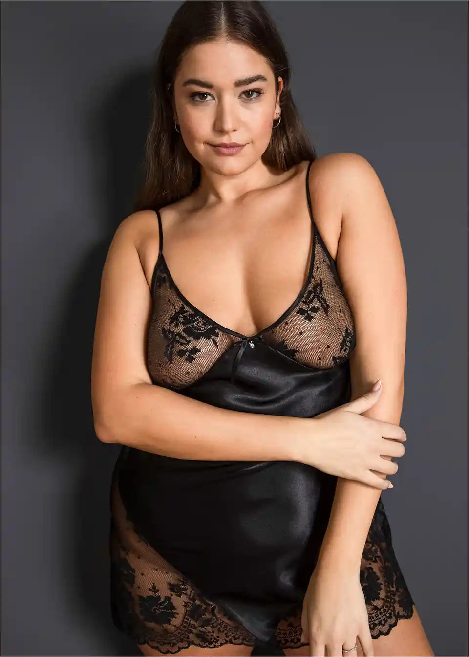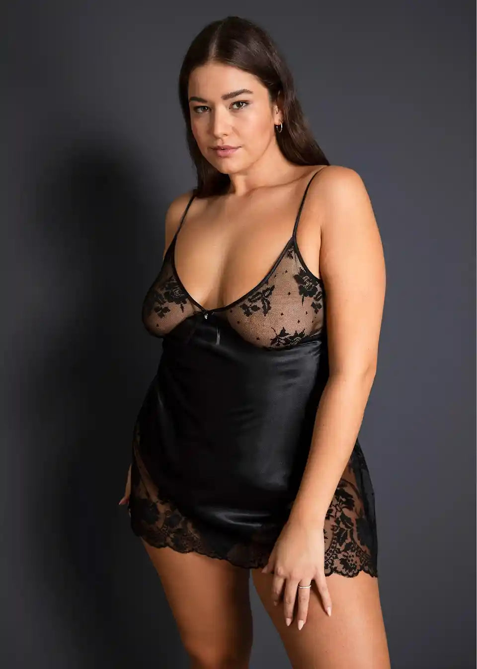Ovaj prekrasan negliže očarava vas cvjetnim izvezenim ukrasima, koji su smješteni u predjelu grudi i sa strane, a njegova prozirnost zavodljivo otkriva siluetu. Svilenkasta tkanina nježno prati vaše obline zahvaljujući svom mekanom padu i pruža visoku udobnost nošenja.