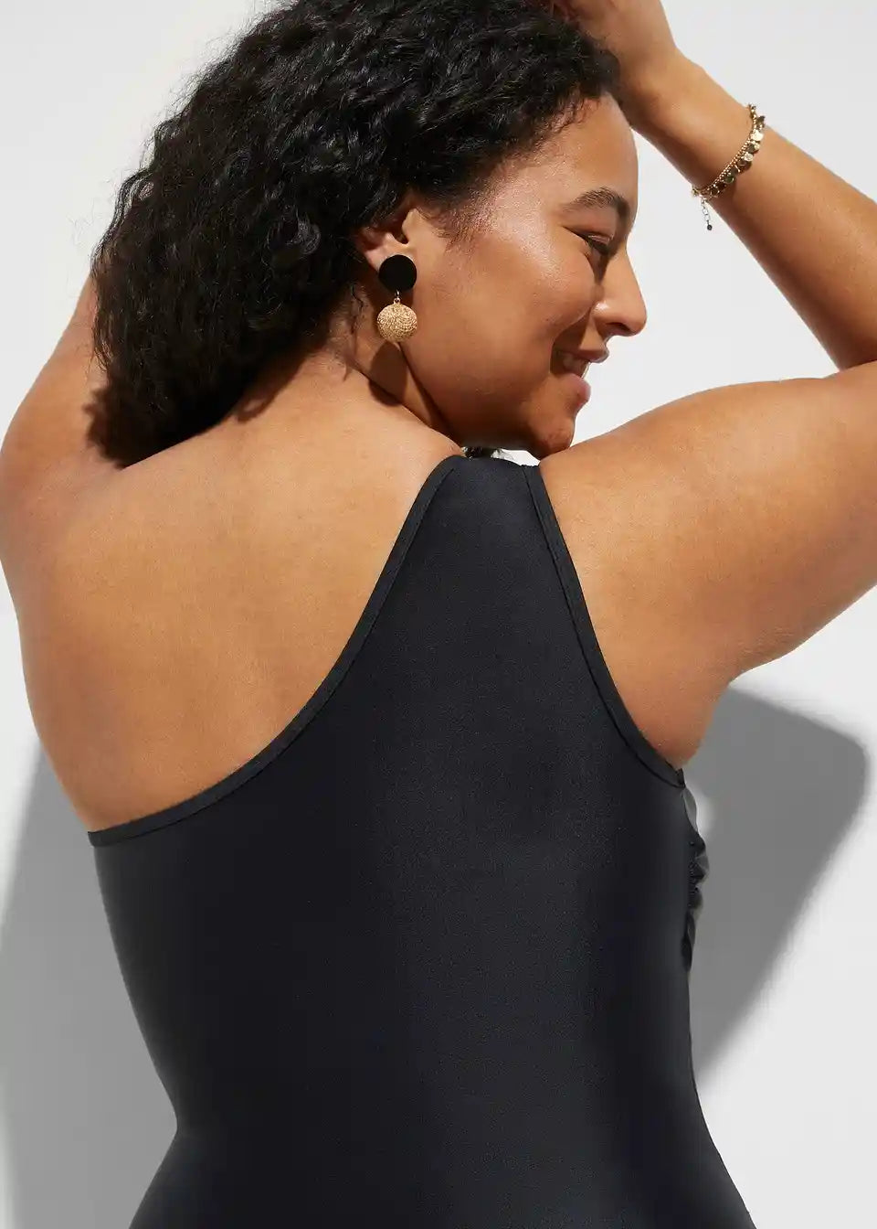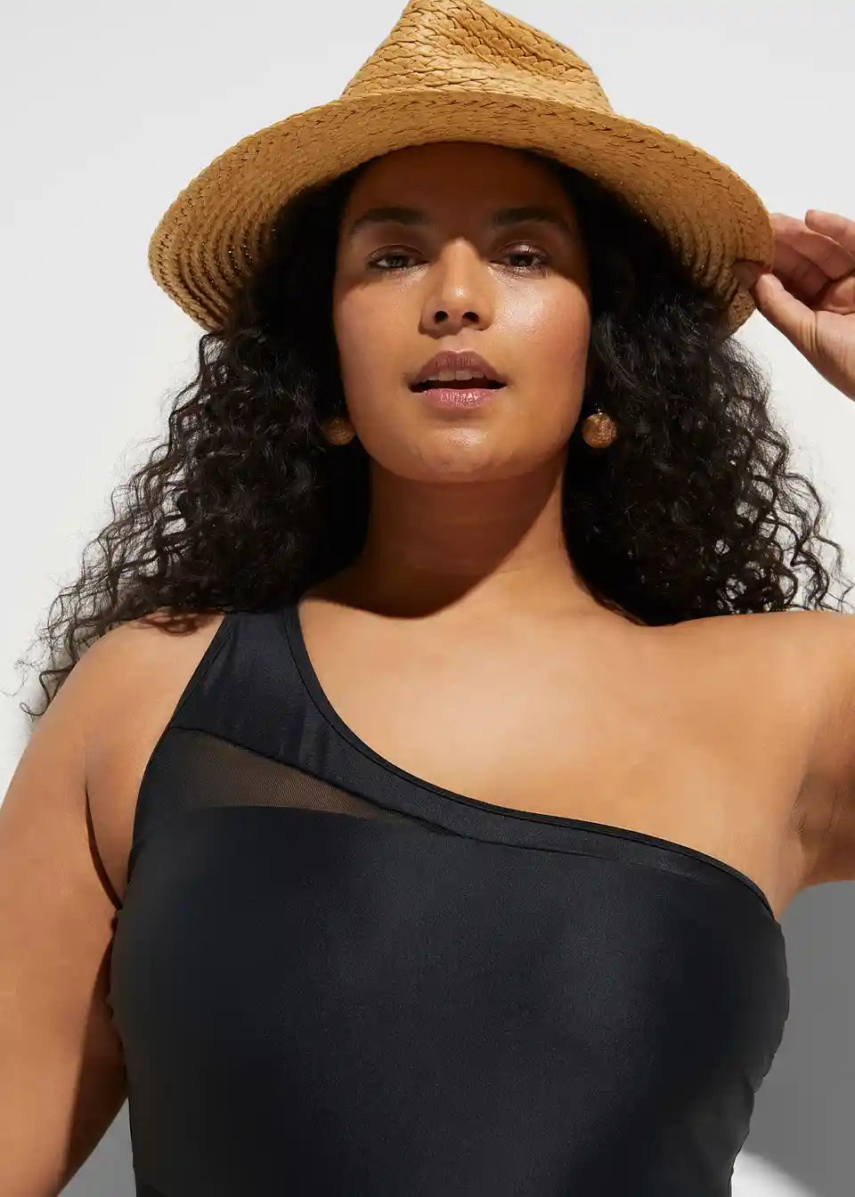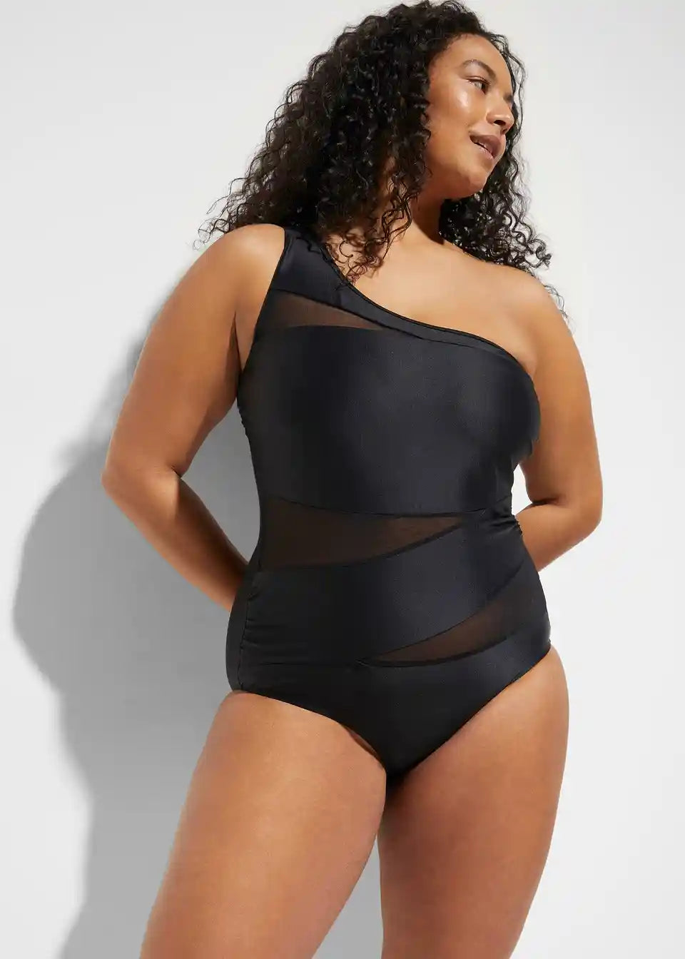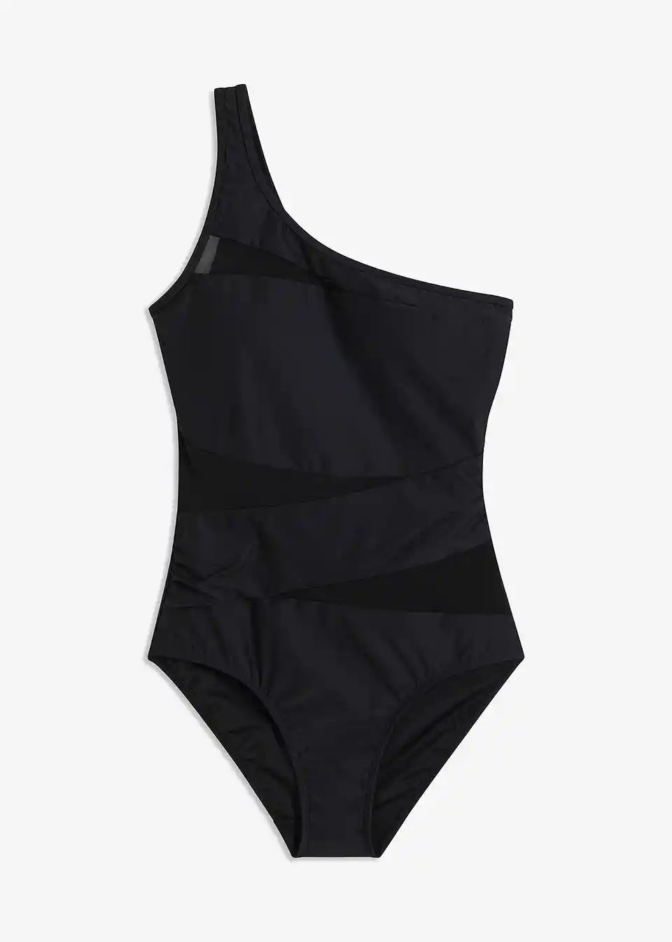 Jednokratki Shape kupaći kostim od materijala koji oblikuje. Ugrađeni mekani košarice s gumom ispod grudi. S prozirnim mrežastim umetkom sprijeda. Efekt oblikovanja zahvaljujući materijalu koji oblikuje i posebnoj podstavi sa svojstvom oblikovanja sprijeda. S postavom na području međunožja.
