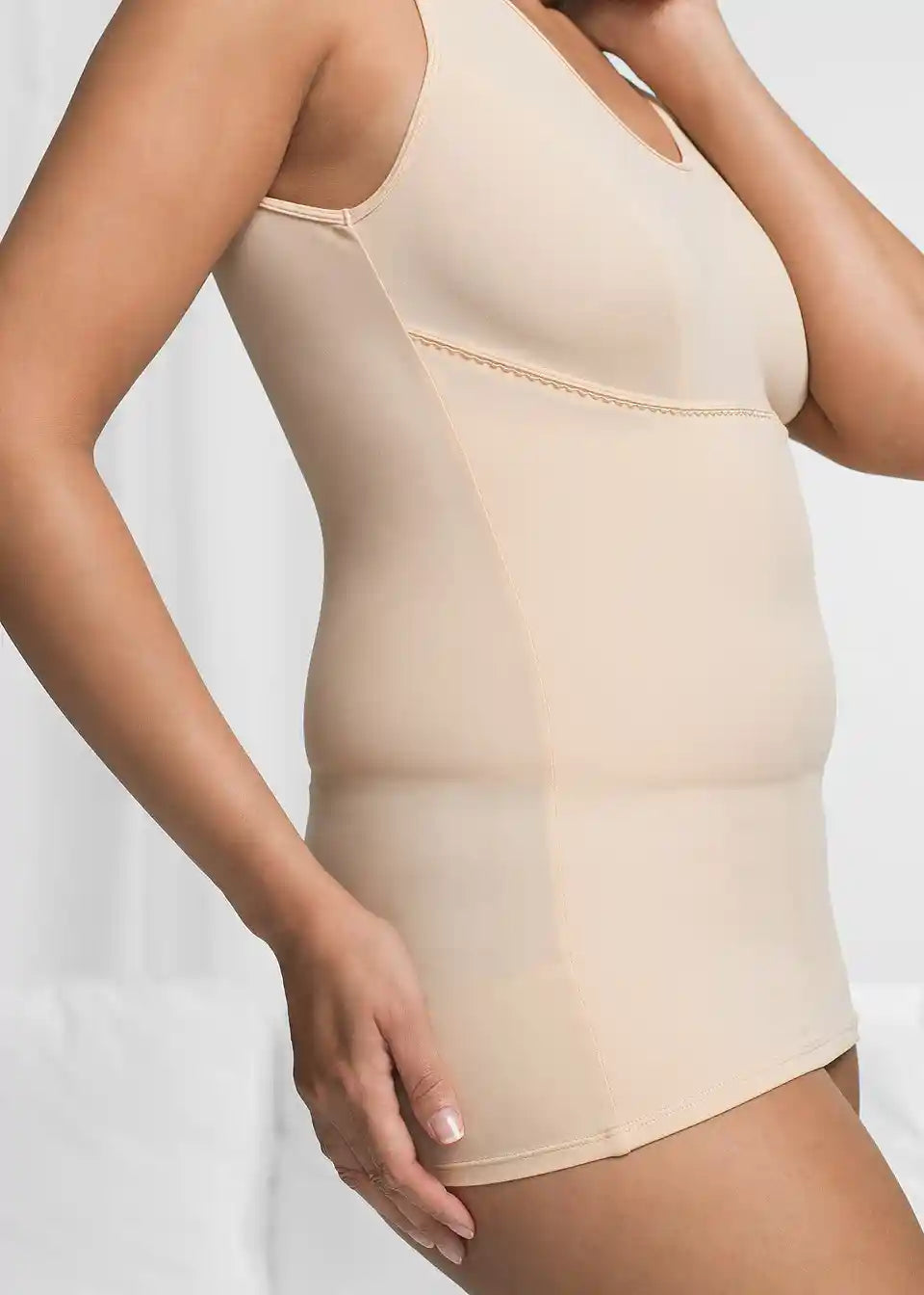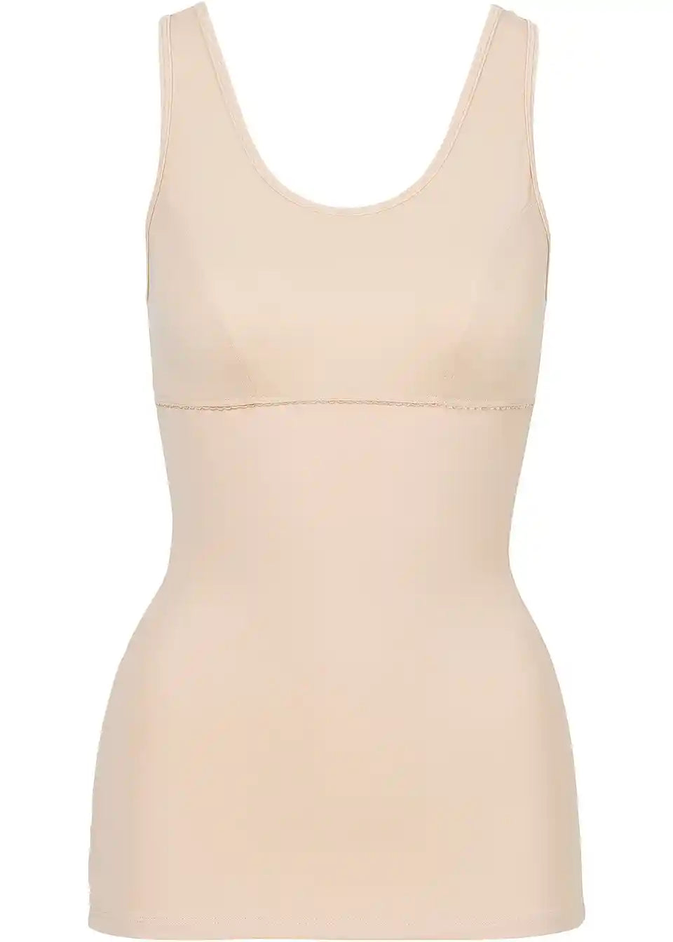 Ovaj top za oblikovanje čini trbuh ravnim i vizualno sužava struk. Zahvaljujući dvostrukom sloju na području trbuha, top pruža dodatnu potporu. Kao ukrasni detalj ističe se mali čipkasti rub ispod prsa. Top za oblikovanje brenda Nice Size može se nositi s grudnjakom s košaricama i idealan je za pripijenu odjeću.