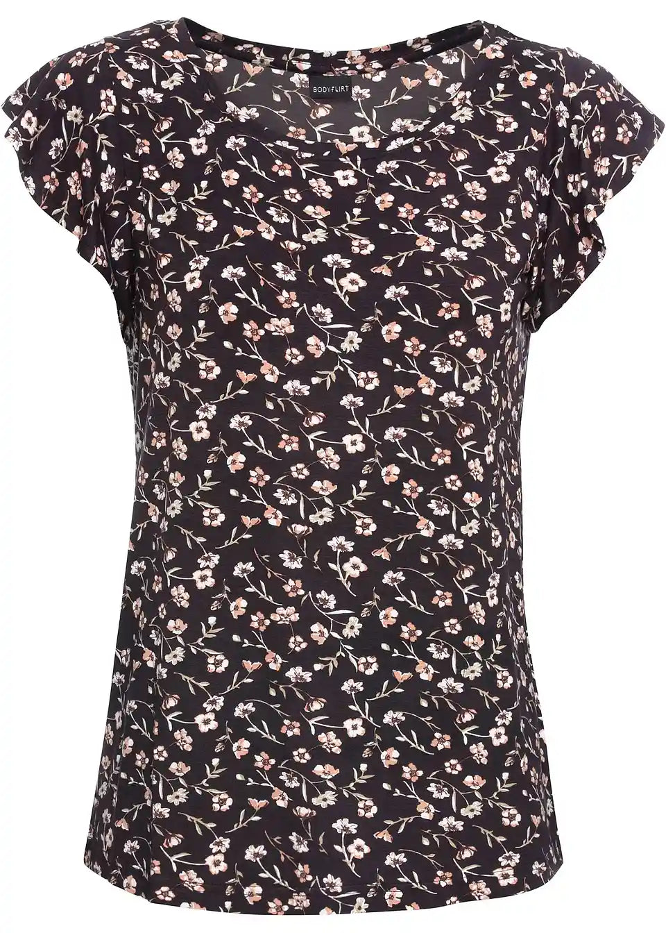 Trendovska majica od Bodyflirt. Haljina je izrađena s volanima na otvorima rukava. Duljina u veličini 36/38 iznosi cca 64 cm.