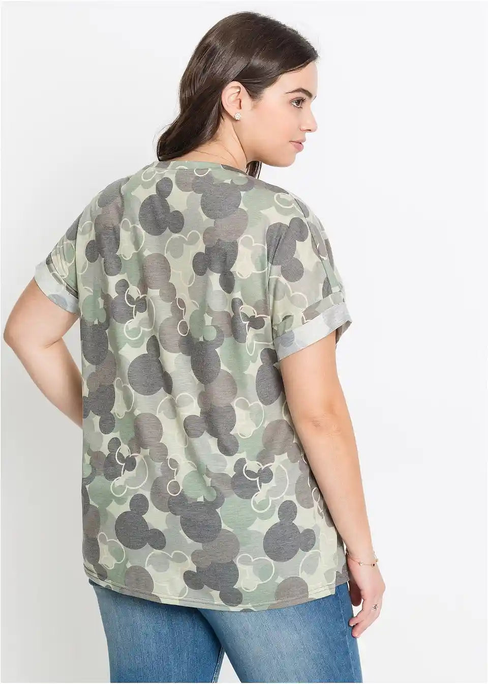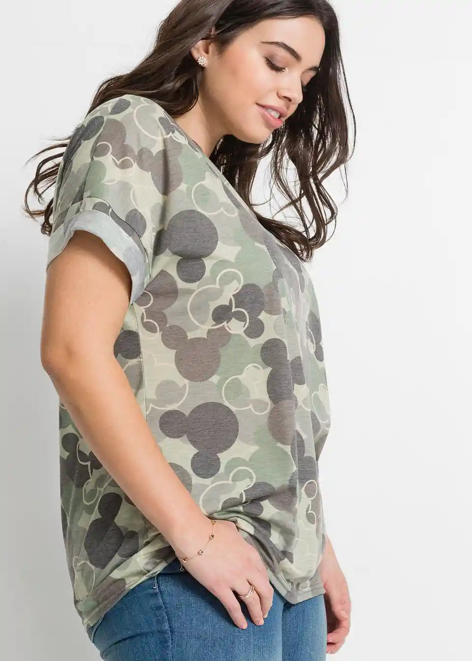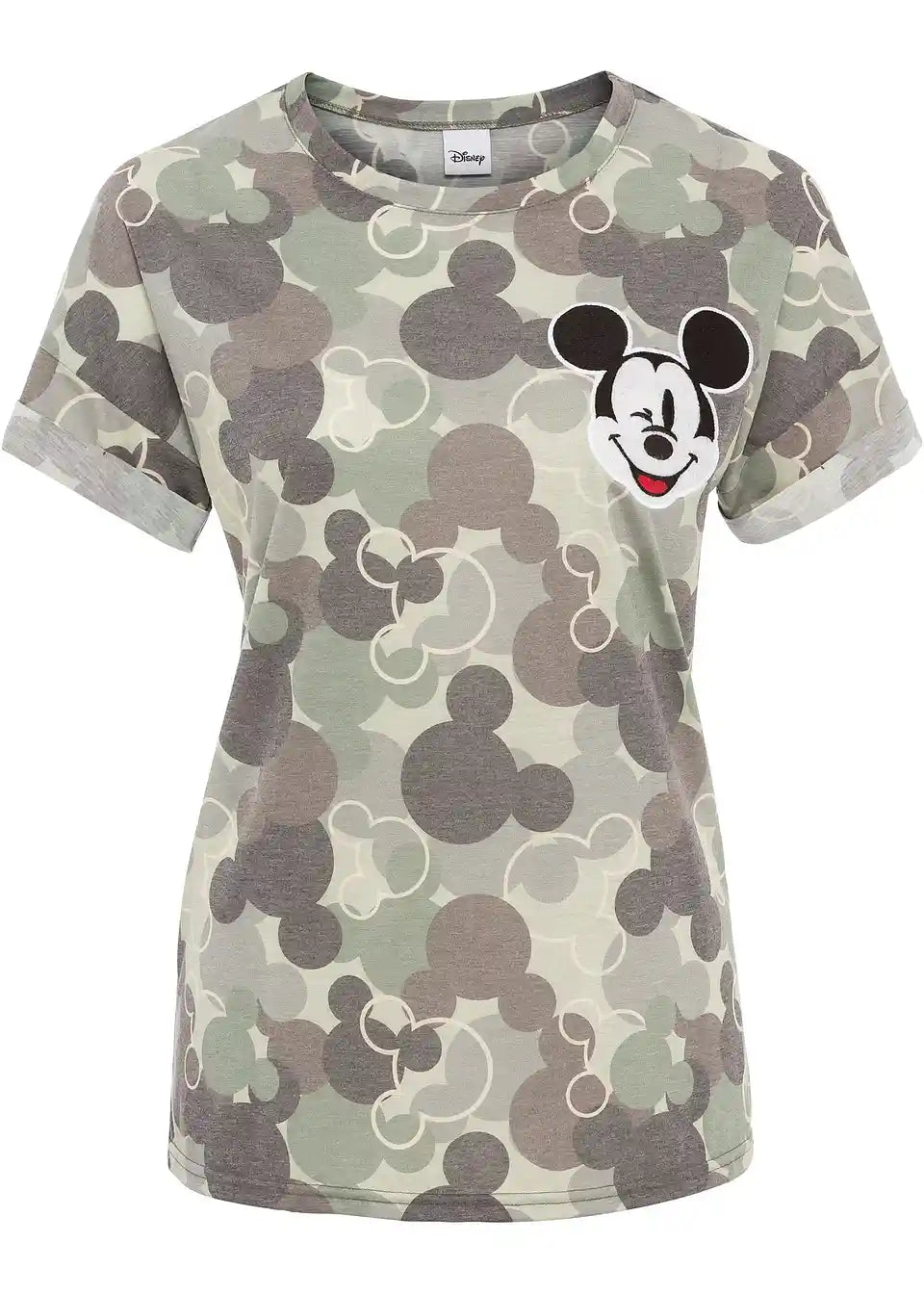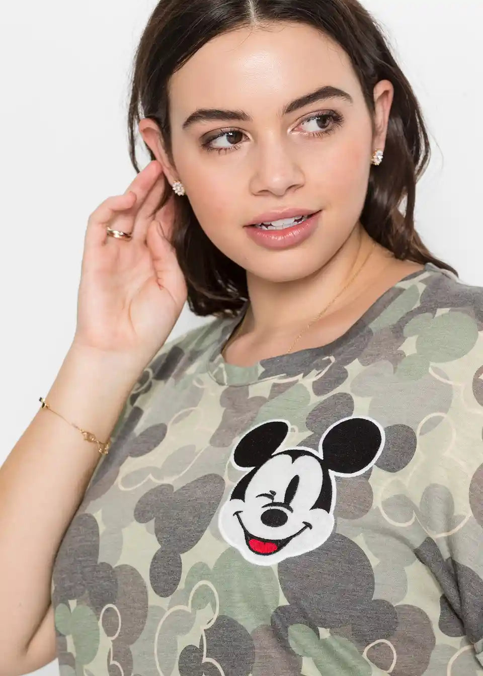 Upečatljiv kamuflažni uzorak daje ovoj majici originalan dodir. Mickey Mouse aplikacija nalazi se u gornjem području prsa. Uz ovaj moderan izgled, model s okruglim izrezom oduševljava i opuštenim krojem u ramenima za ekstra ležeran izgled. Zavrnuti krajevi rukava upotpunjuju genijalan izgled. Skinny traperice i balerinke naglašavaju majicu jednako dobro kao i mini suknja od imitacije kože s gležnjačama.