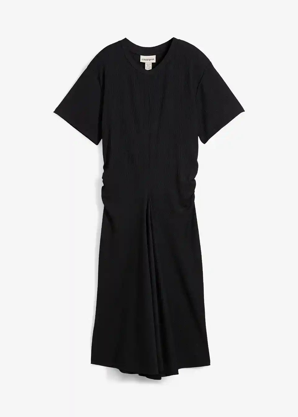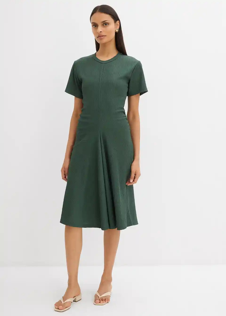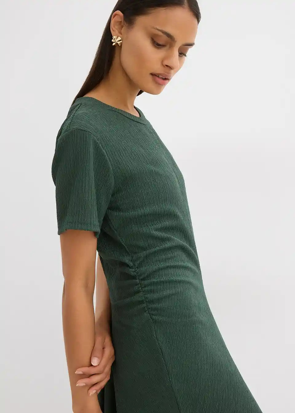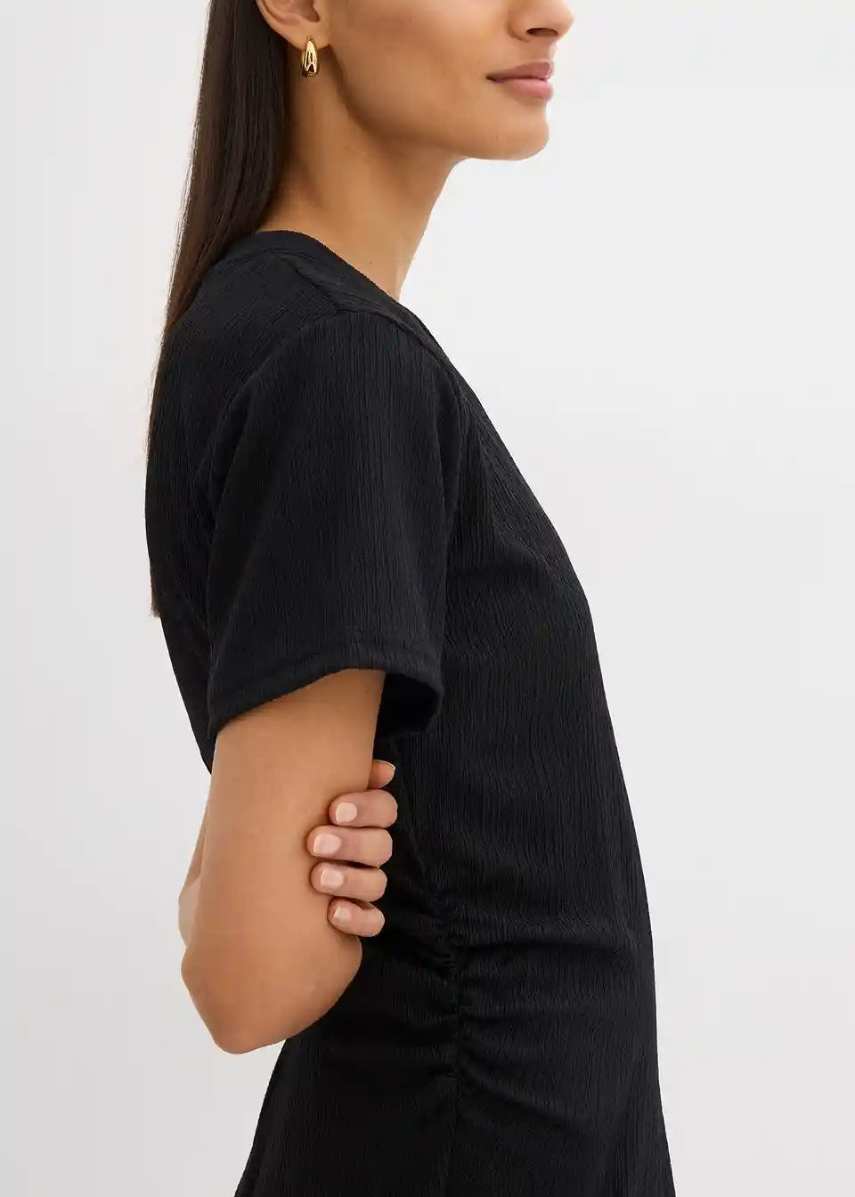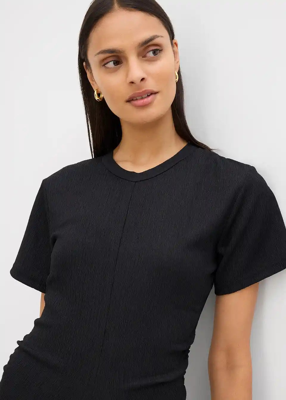 Shirt haljina od tkanine sa strukturiranim uzorkom. Okrugli izrez i kratki rukavi. Nabori u struku i vertikalni dio šava sprijeda.