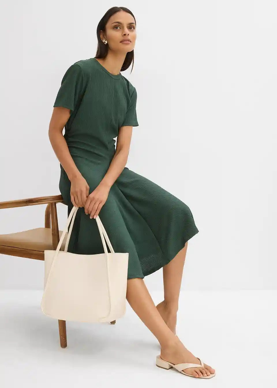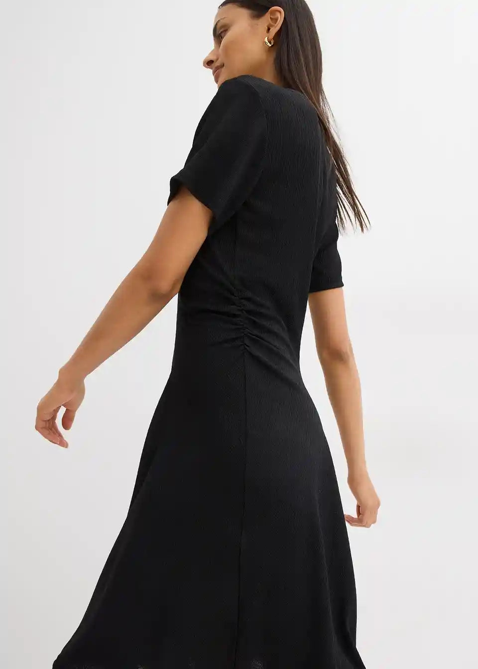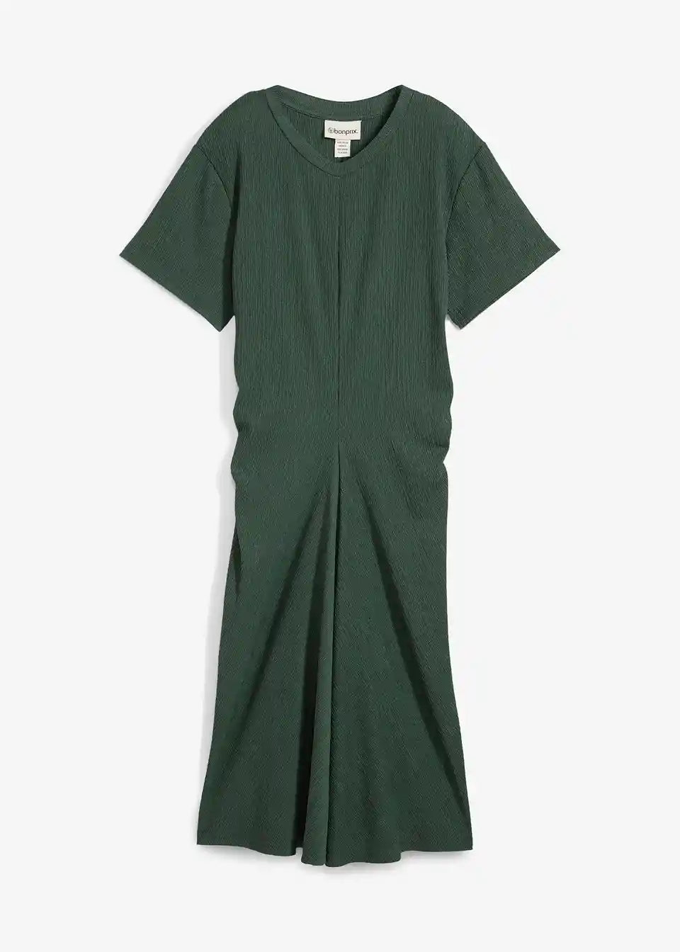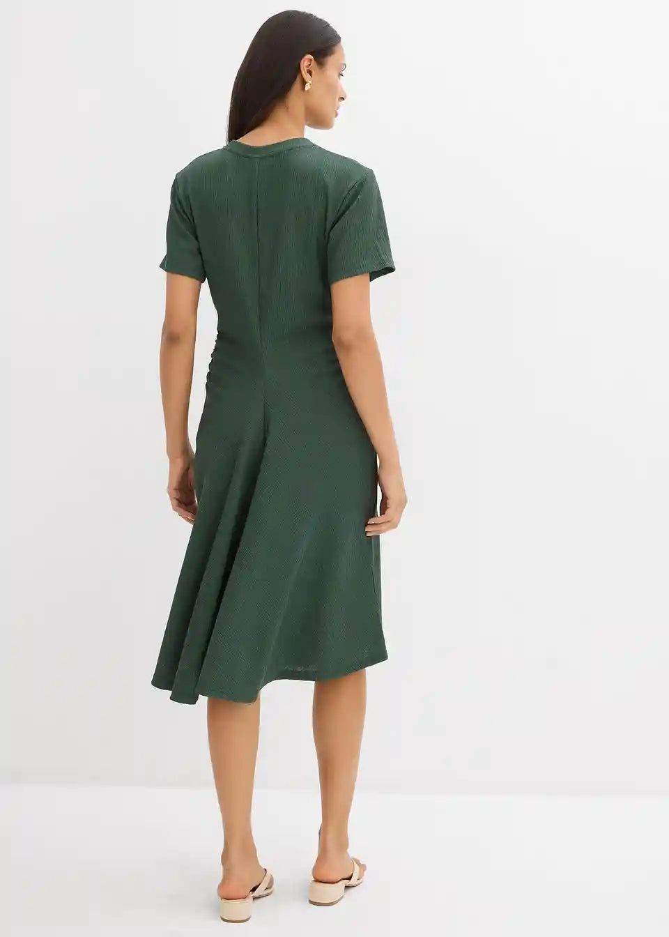 Shirt haljina od tkanine sa strukturiranim uzorkom. Okrugli izrez i kratki rukavi. Nabori u struku i vertikalni dio šava sprijeda.