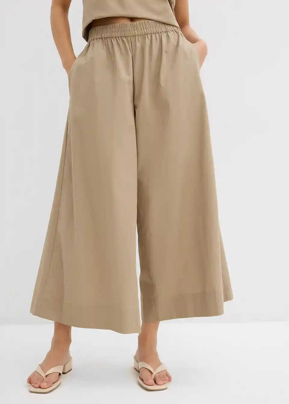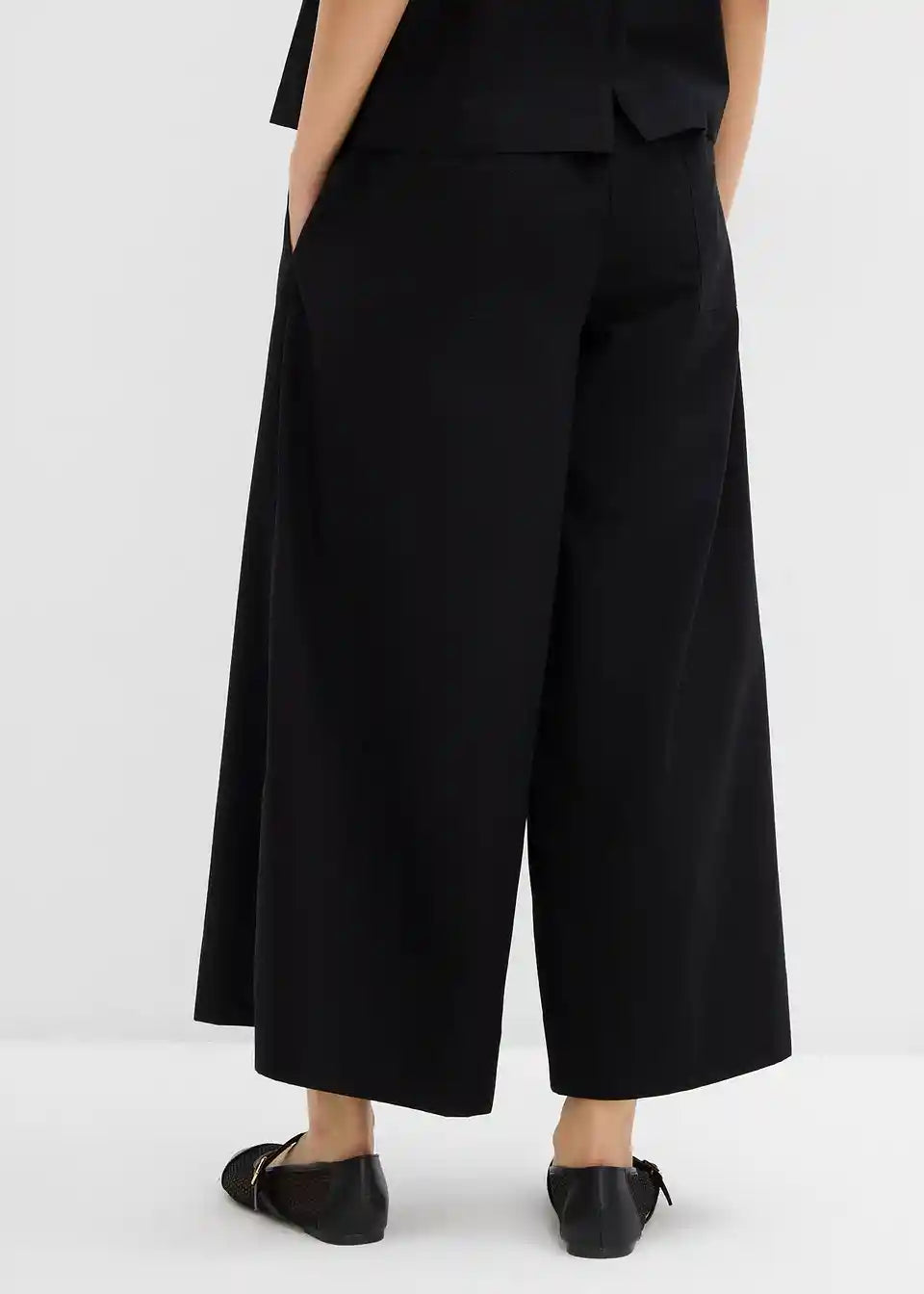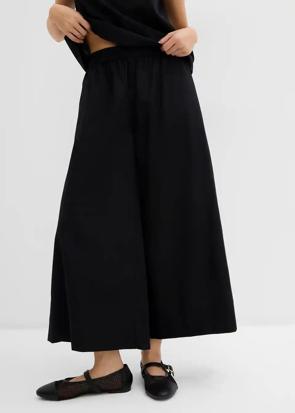 Culotte s posebno širokim nogavicama, udobnim elastičnim pojasom, prednjim džepovima u šavu i našivenim stražnjim džepovima