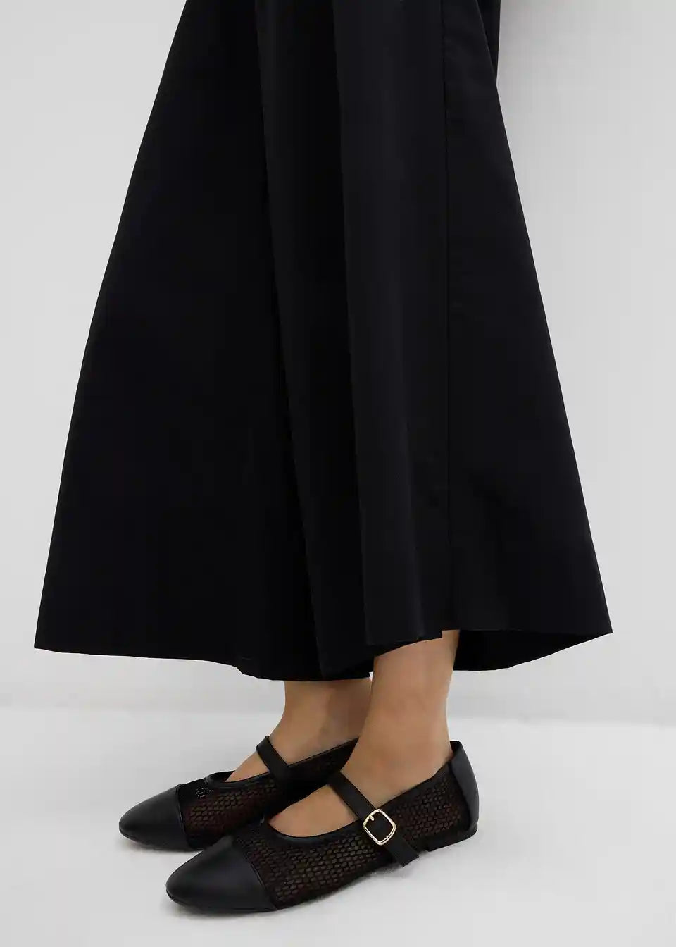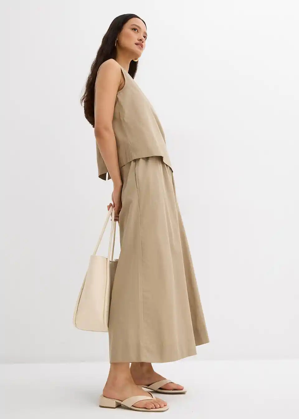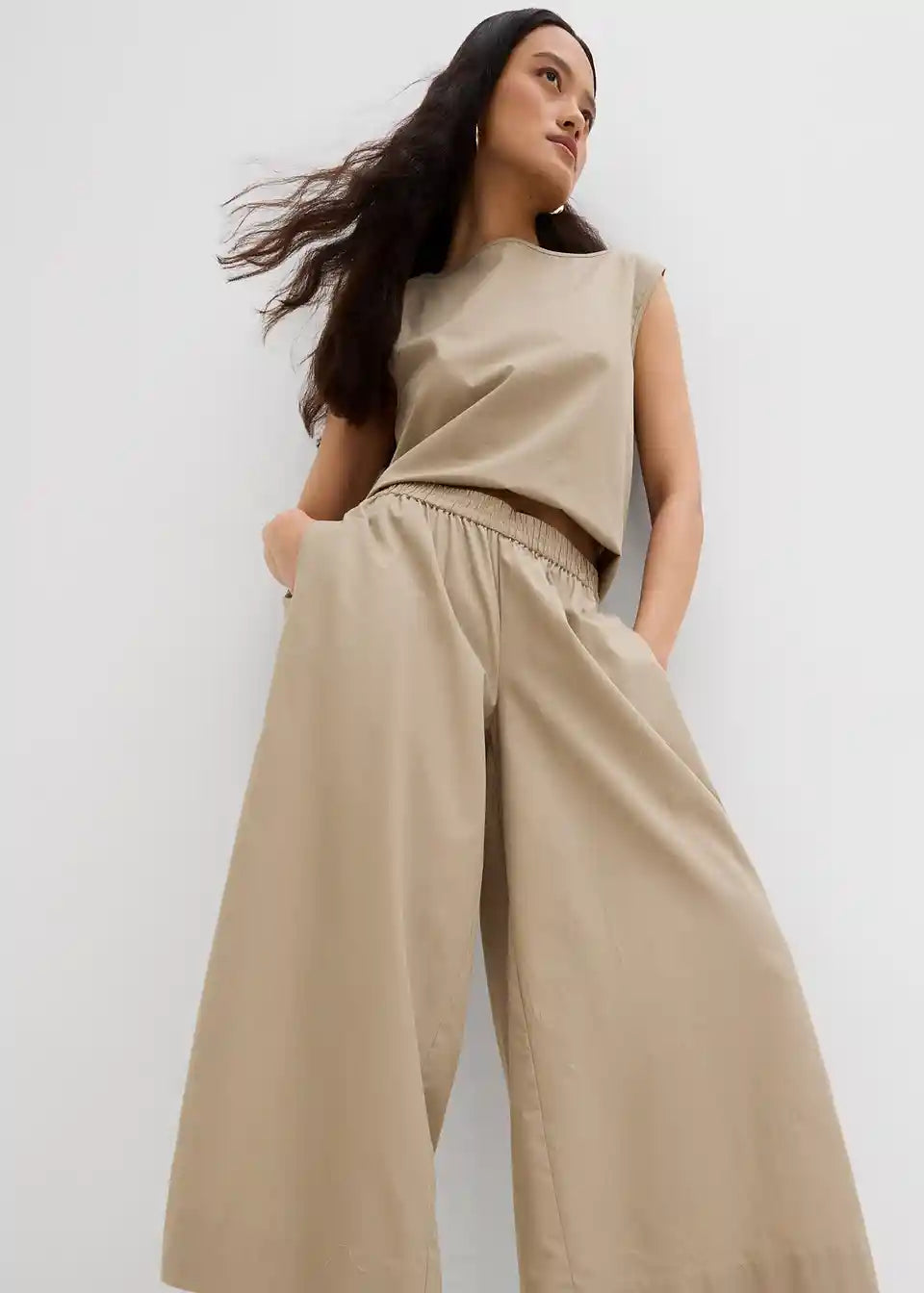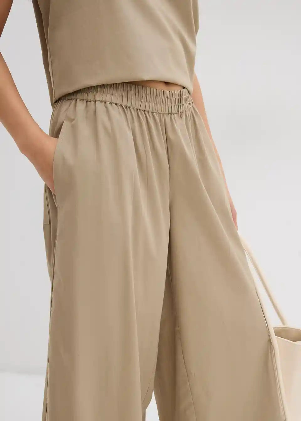 Culotte s posebno širokim nogavicama, udobnim elastičnim pojasom, prednjim džepovima u šavu i našivenim stražnjim džepovima
