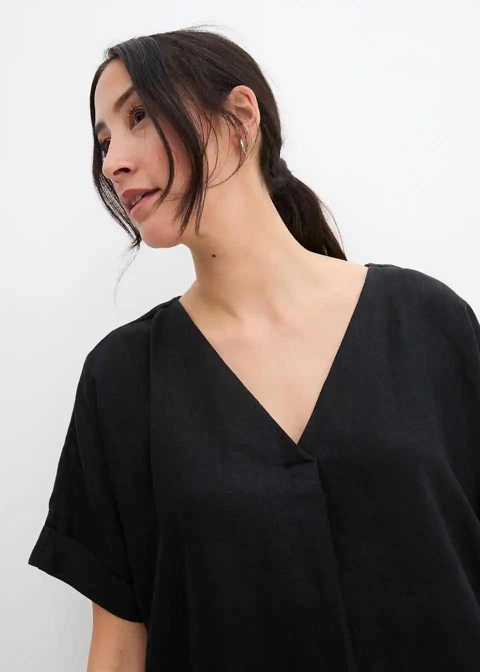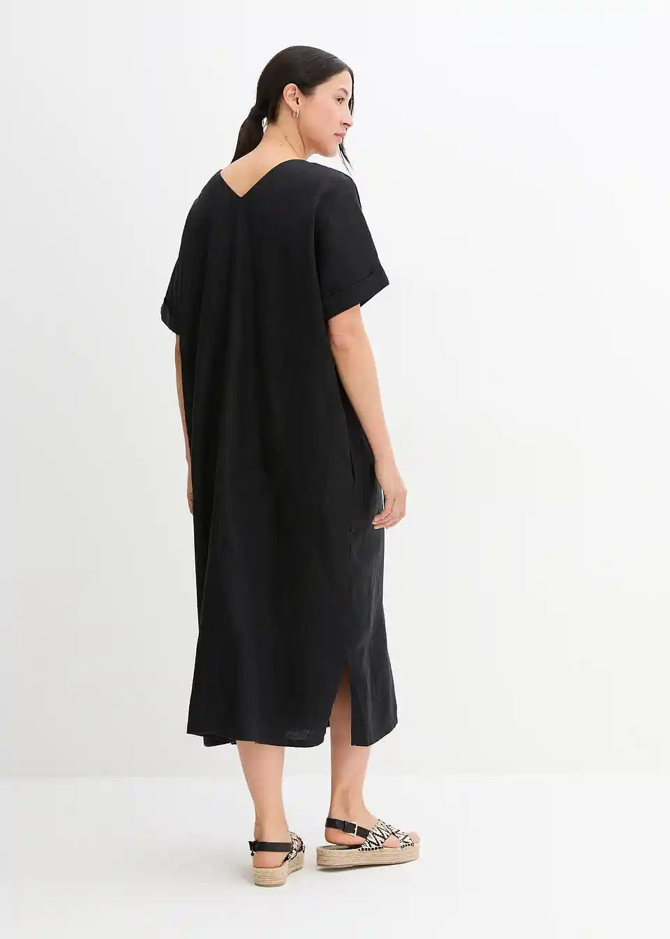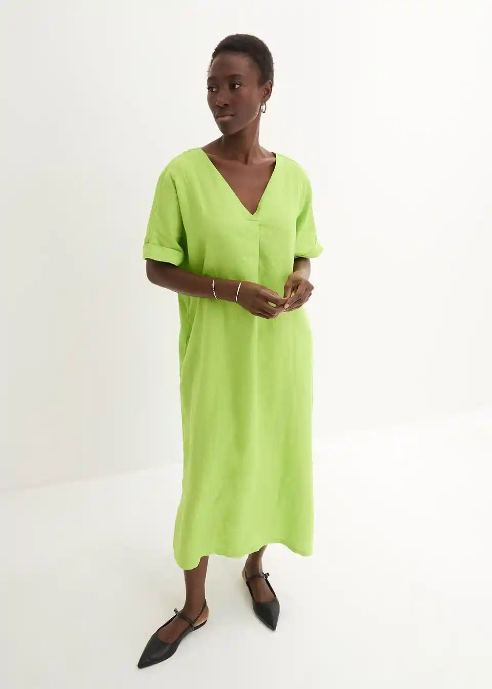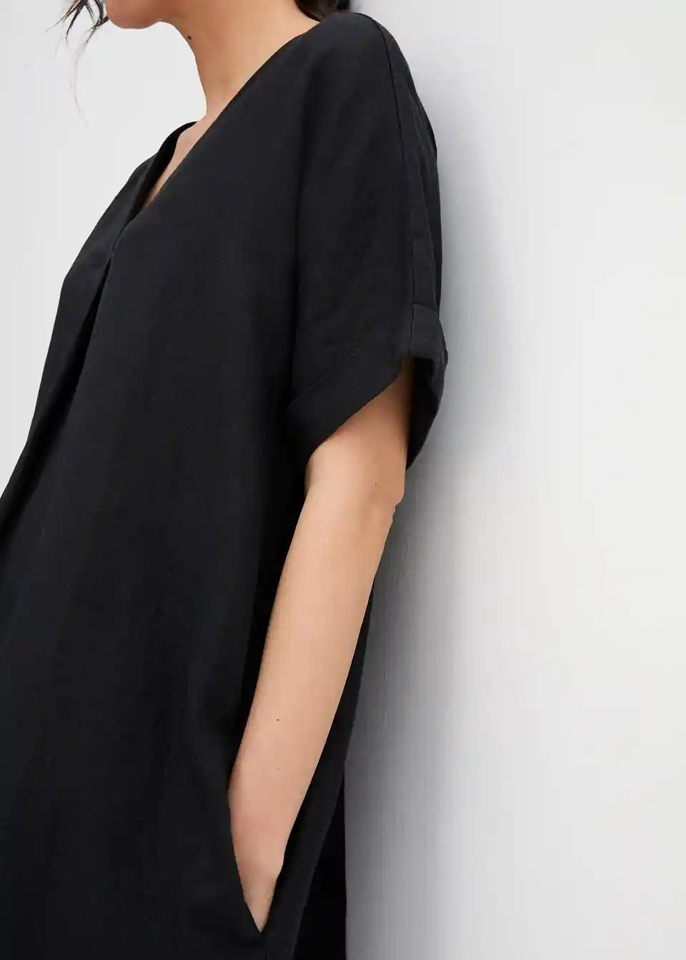 moderna lanena haljina širokog kroja i dubokog V-izreza