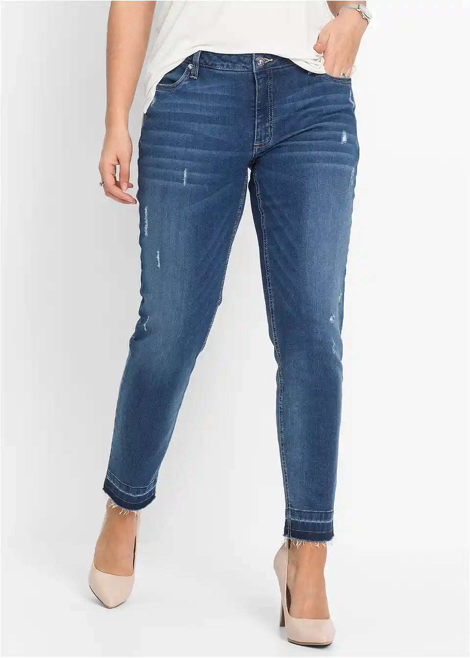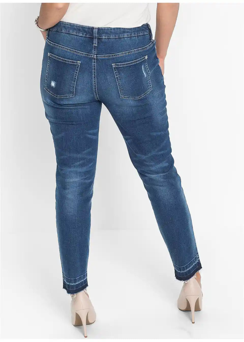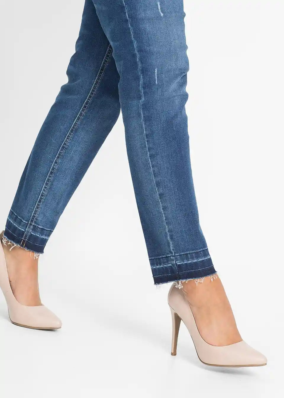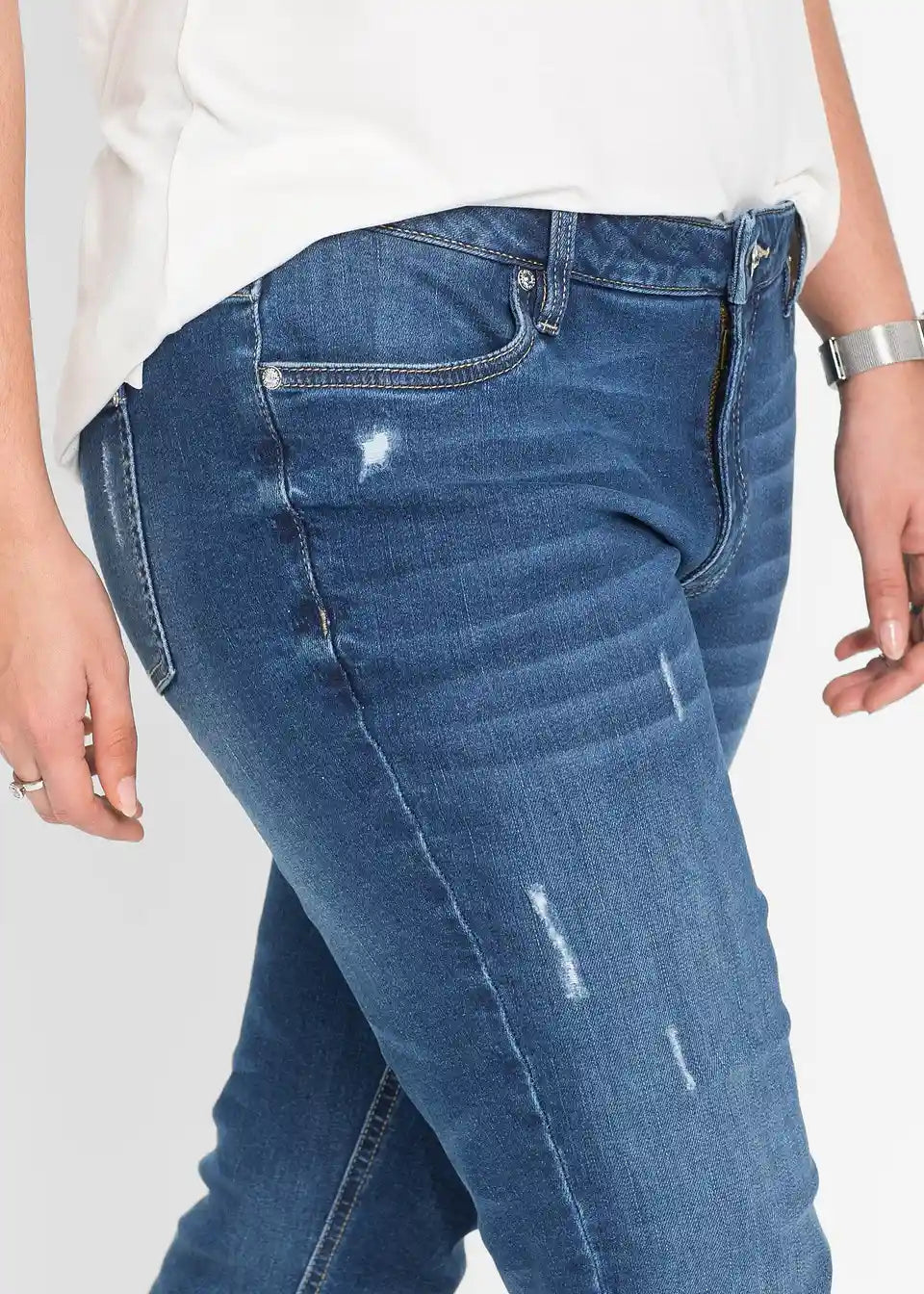 Uski kroj daje ovim 7/8 skinny trapericama zavodljiv izgled. Vrlo trendovski dojam ostavljaju decentni destroyed efekti modela u 5-džepnom stilu marke BODYFLIRT. Hlače s zakovicama na uglovima džepova, na omčama za remen i na prošivenim šavovima zatvaraju se sprijeda gumbom i patentnim zatvaračem. Dekorativan detalj hlača s niskim strukom je posebni rub na završecima nogavica.