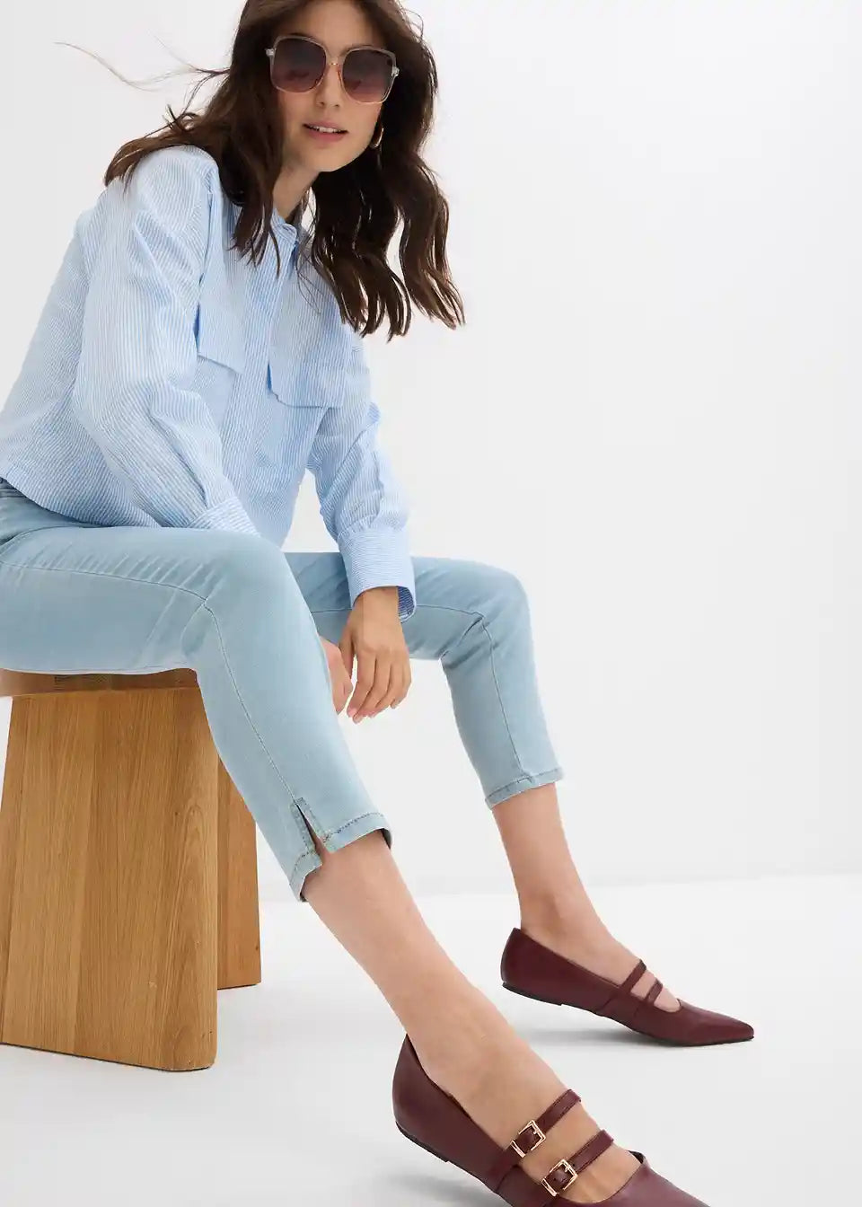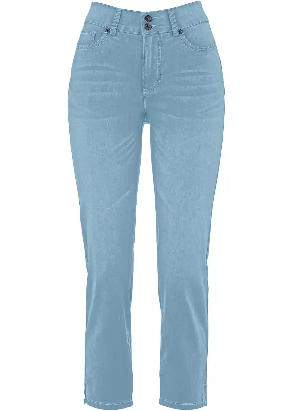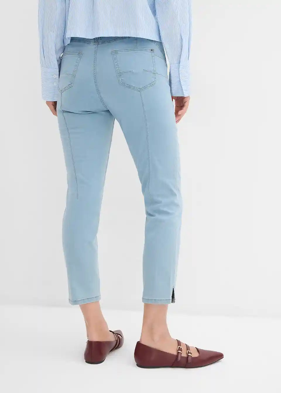 Ove 7/8 traperice udobne su za nošenje i istovremeno oblikuju lijepu figuru. Posebno pozicionirani šavovi na nogavicama i stražnjici vizualno ističu figuru. Stražnji prošiveni umetci i visok udio elastana u hlačama osiguravaju dodatnu udobnost. Push-up rastezljive traperice s prorezom imaju podignuti struk. Model marke bpc ima ravan kroj nogavica i kopča se na gumb i patentni zatvarač.
