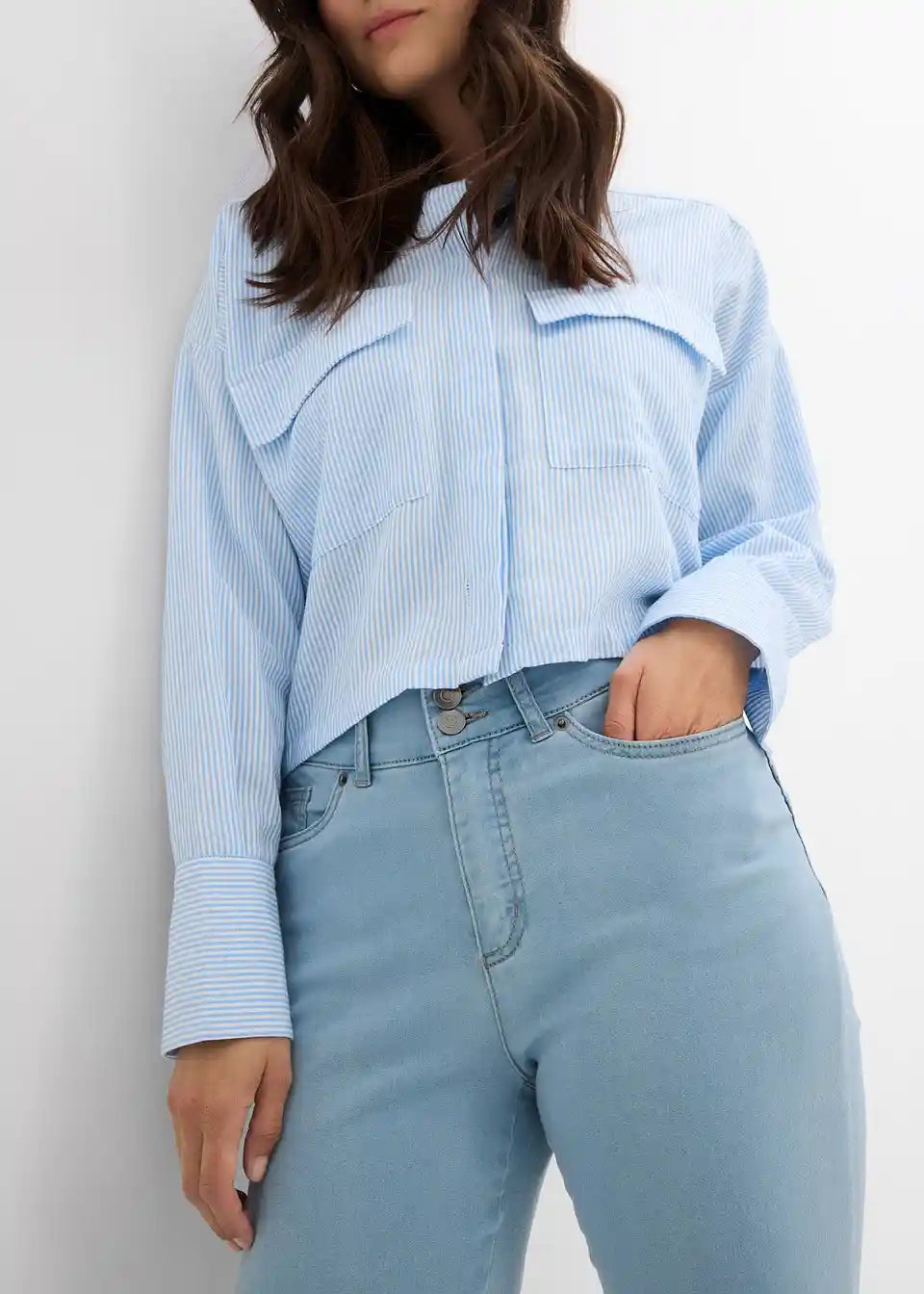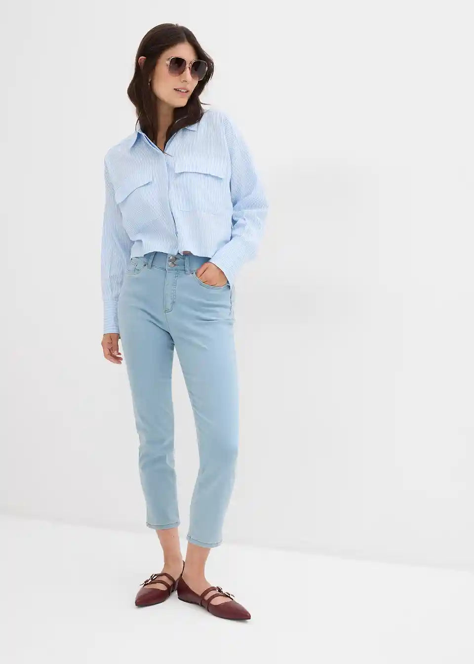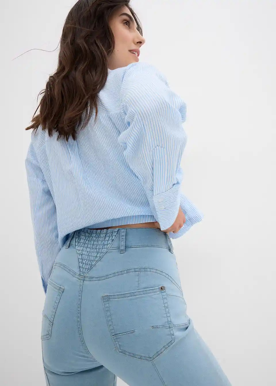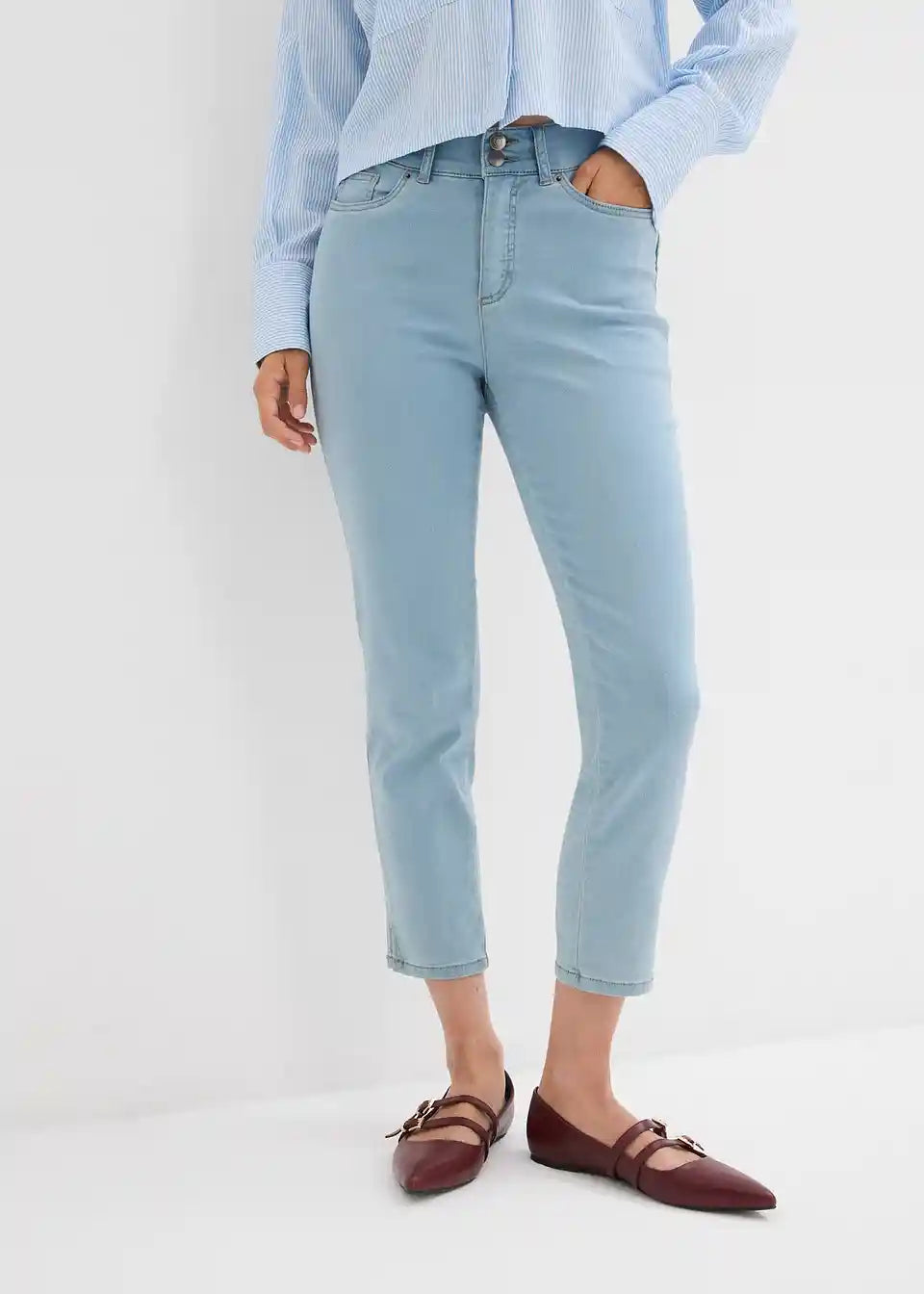 Ove 7/8 traperice udobne su za nošenje i istovremeno oblikuju lijepu figuru. Posebno pozicionirani šavovi na nogavicama i stražnjici vizualno ističu figuru. Stražnji prošiveni umetci i visok udio elastana u hlačama osiguravaju dodatnu udobnost. Push-up rastezljive traperice s prorezom imaju podignuti struk. Model marke bpc ima ravan kroj nogavica i kopča se na gumb i patentni zatvarač.