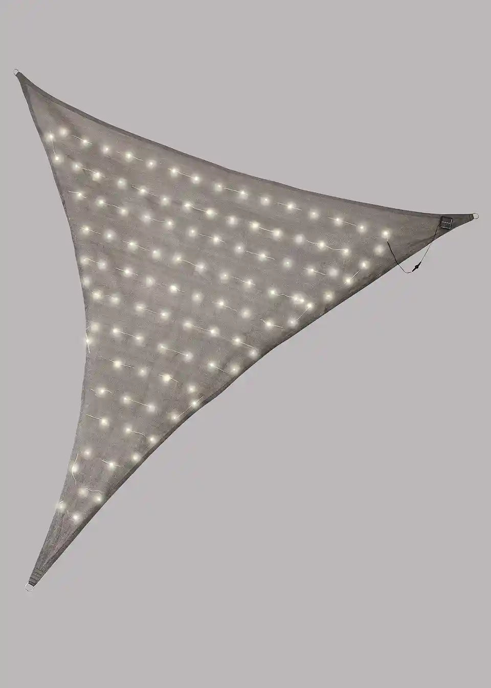 Senzor sumraka, vrijeme osvjetljenja cca 8 sati, 110 toplo bijelih LED dioda, s akumulatorskom tehnologijom NI-Mh 1x AA 1,2V 300mAh (baterija uključena). Uključuje daljinski upravljač, moguće birati između 6 različitih svjetlosnih funkcija. Kutovi su ojačani aluminijskim prstenovima, a za pričvršćivanje su dostupna 3 PE remena, svaki duljine 75 cm. Tenda pruža sjenu, propušta kišu (bez nakupljanja vode!) i zrak (bez nakupljanja topline!). Napravljena je od 100% tvrdog polietilena (HDPE).