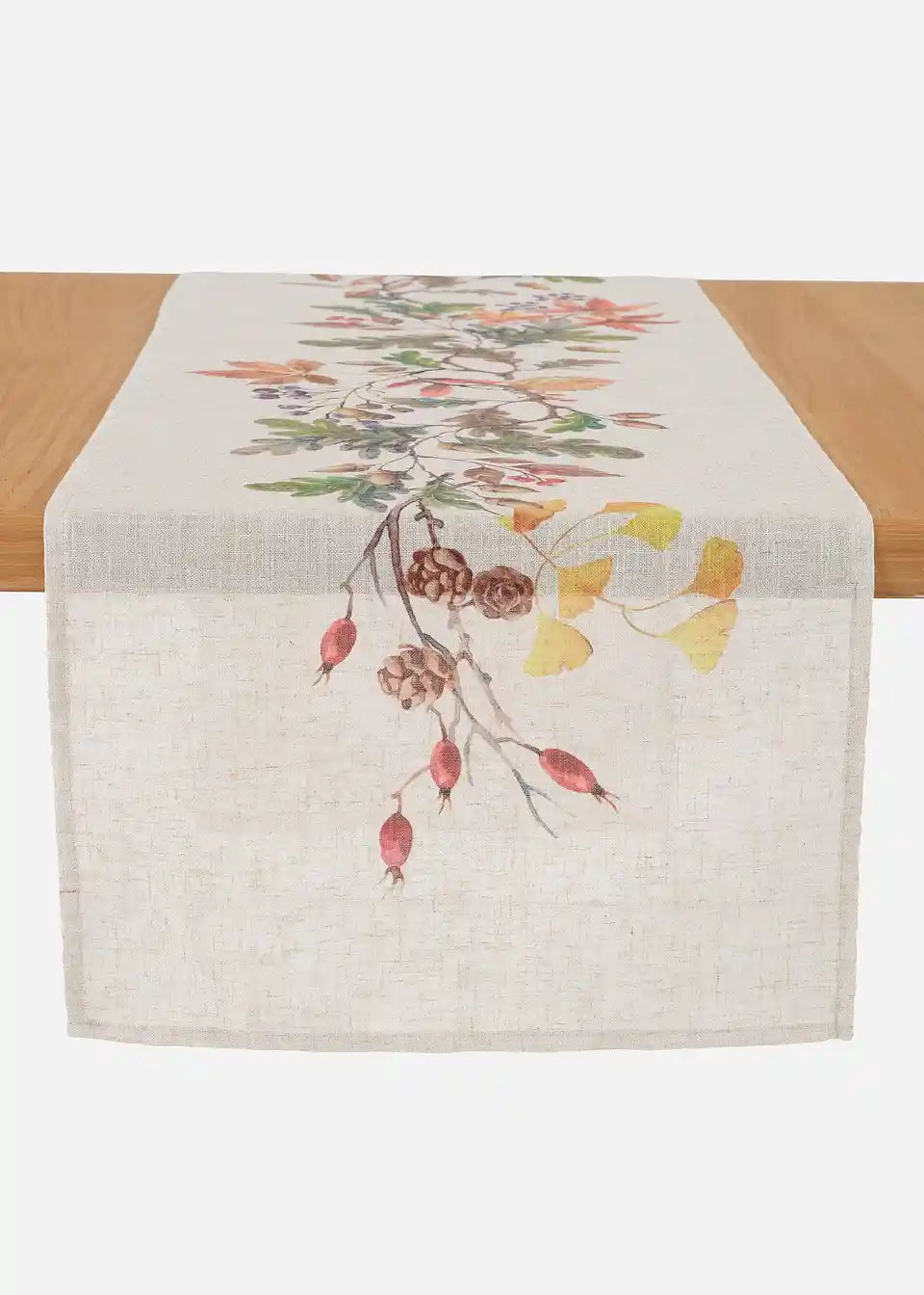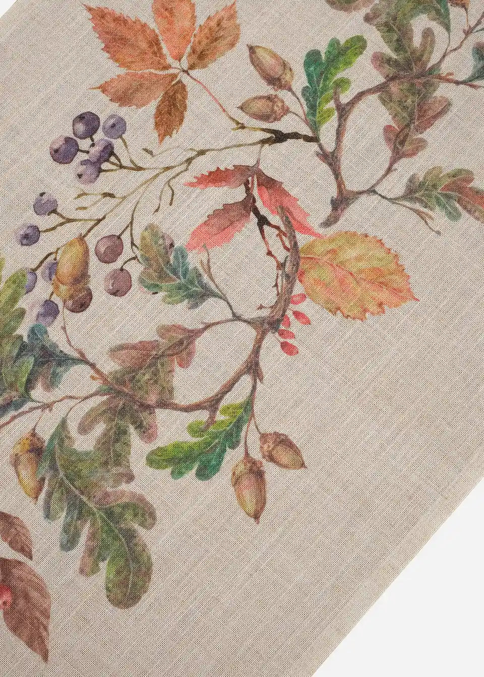 Stolnjak dolazi u dvije veličine i ima jesenski print postavljen u sredini. Tkanina ima udio lana i lijepu strukturu.