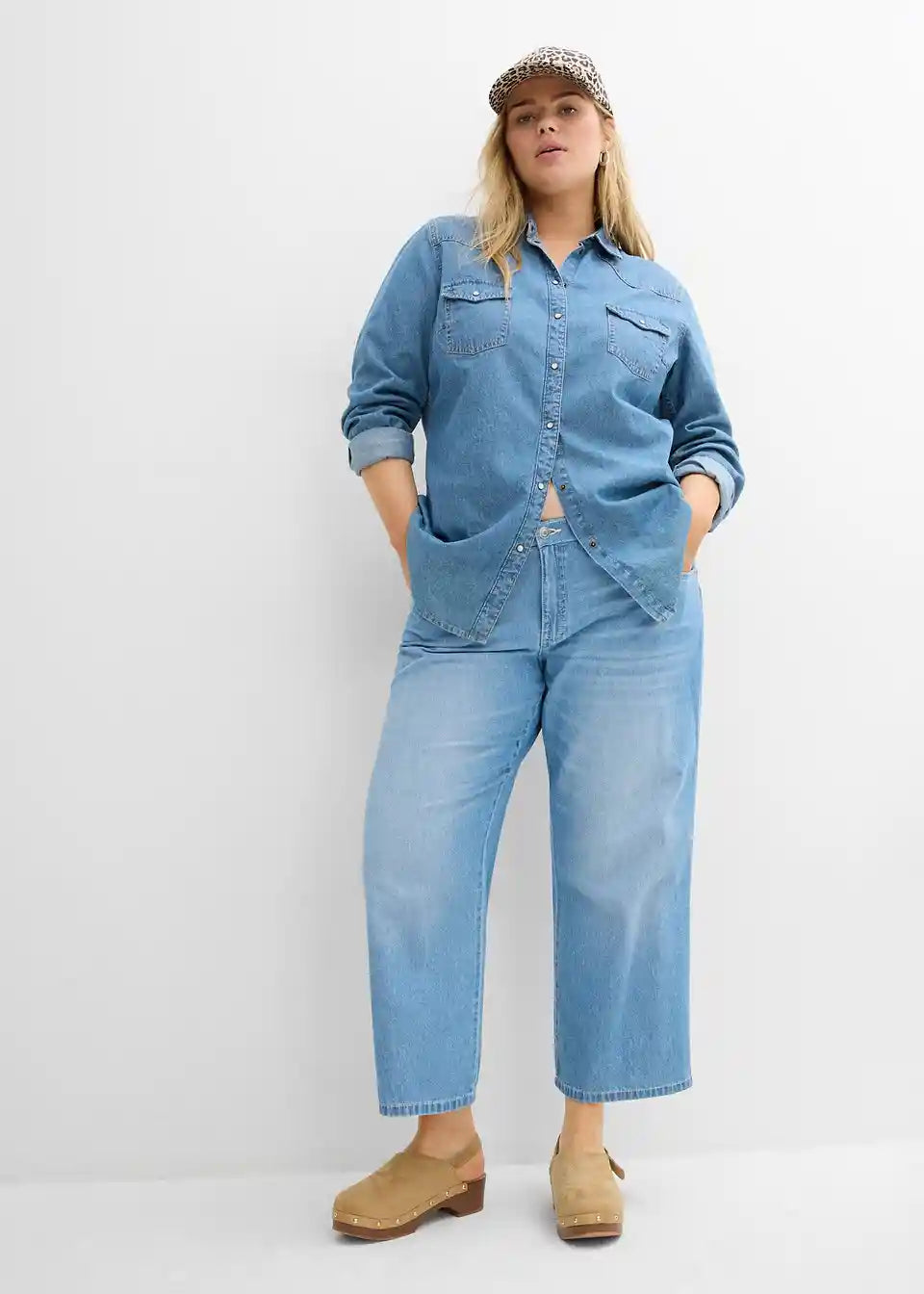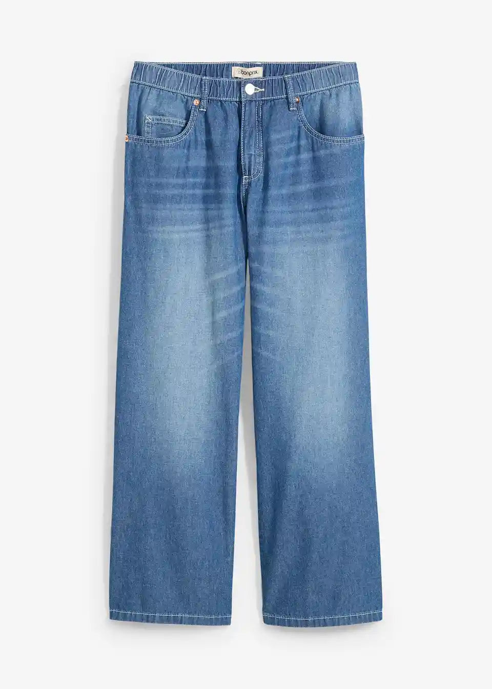 Ležerne ravne 5-džepne traperice s elastičnim udobnim pojasom izrađene od čvrstog pamučnog trapera koji je u početku nešto krut, ali čestim nošenjem postaje mekši i udobniji. Srednje visoki struk sa zatvaračem i gumbom. Skraćena dužina. Unutarnja duljina nogavice u veličini 42 cca 64,5 cm, perive u perilici rublja.
