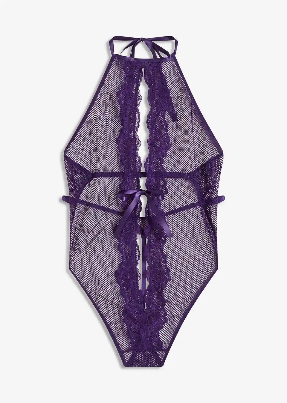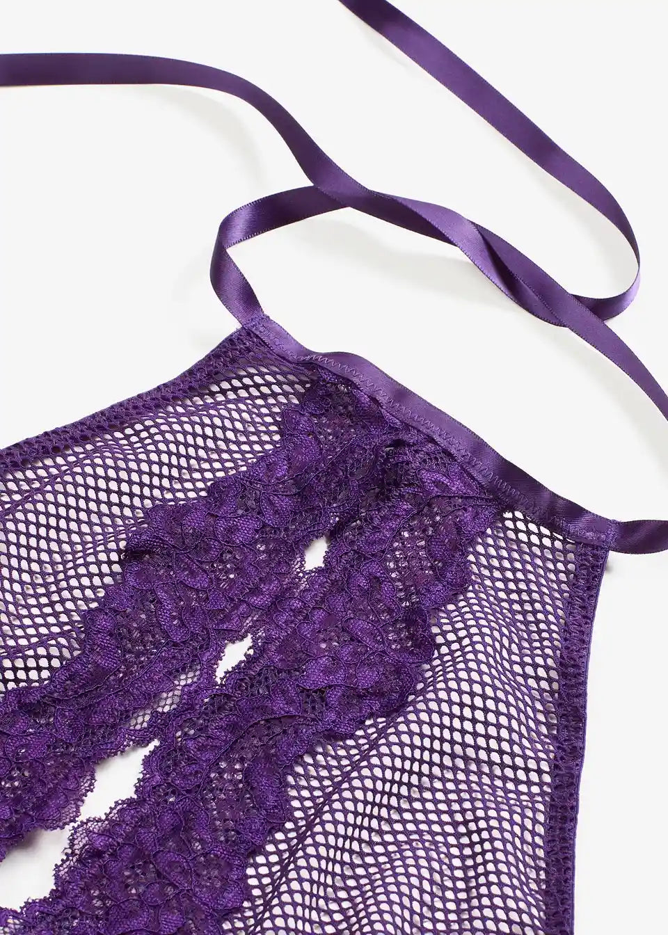 Stringbody od mrežastog materijala s prekrasnim čipkastim detaljima.