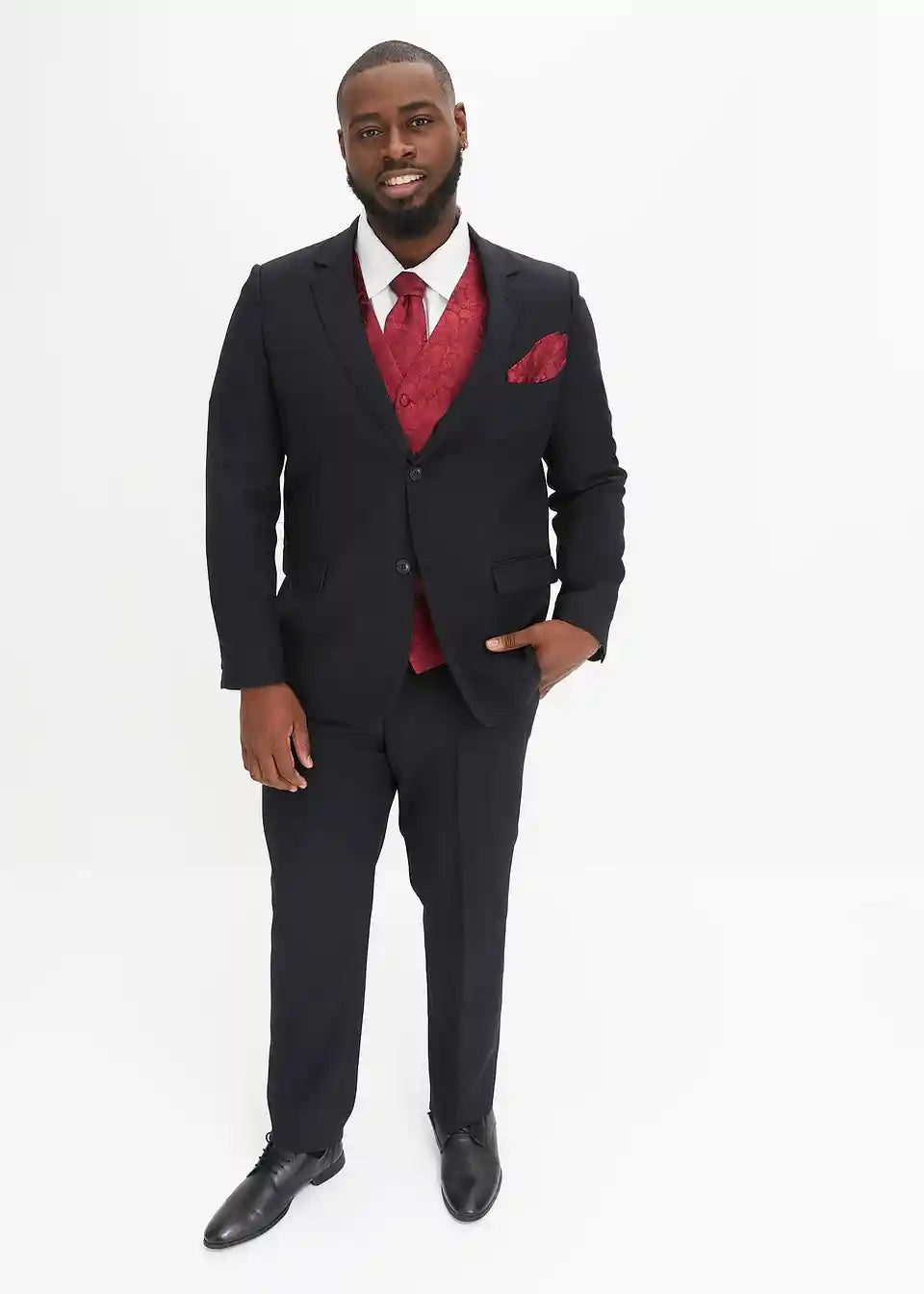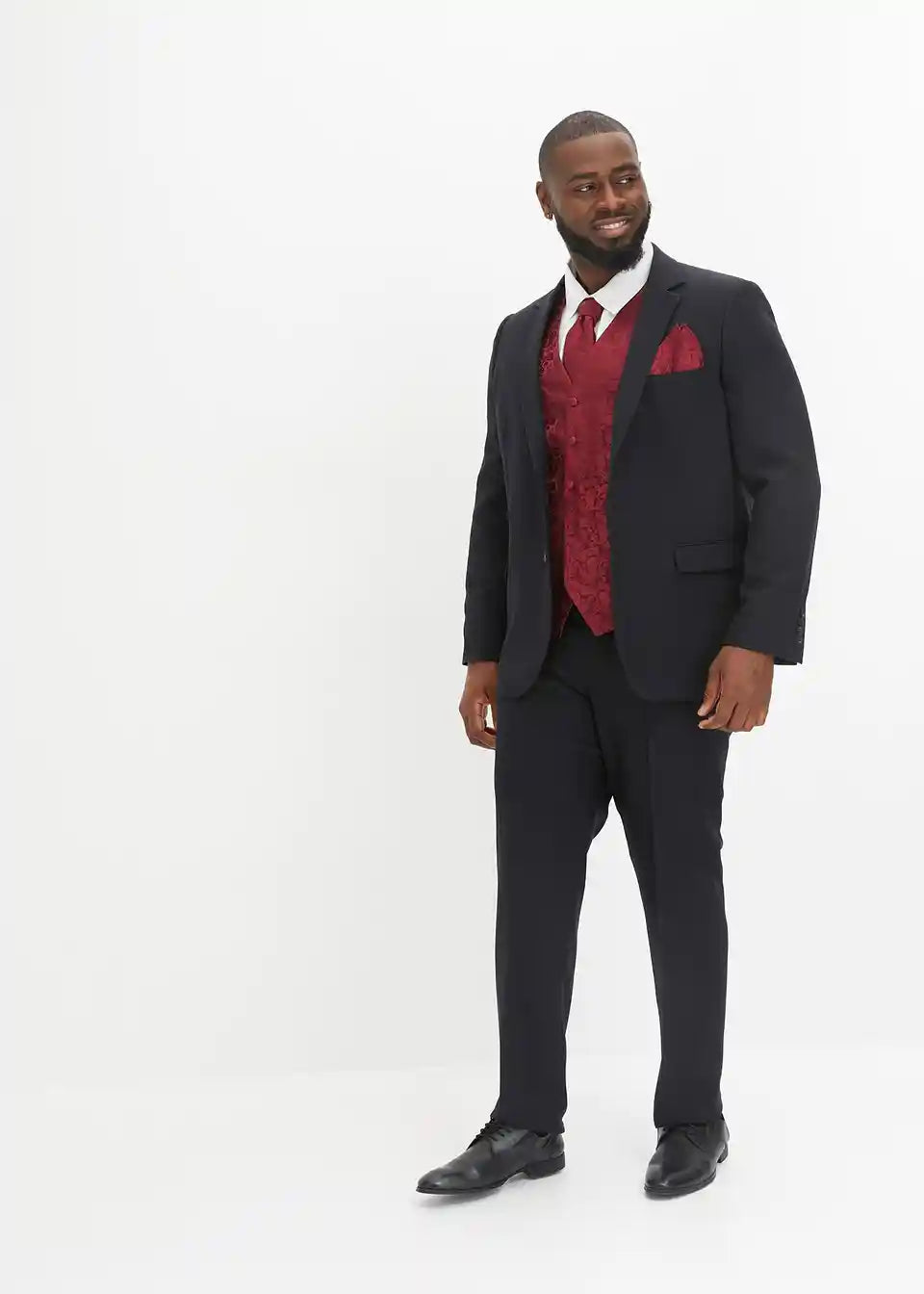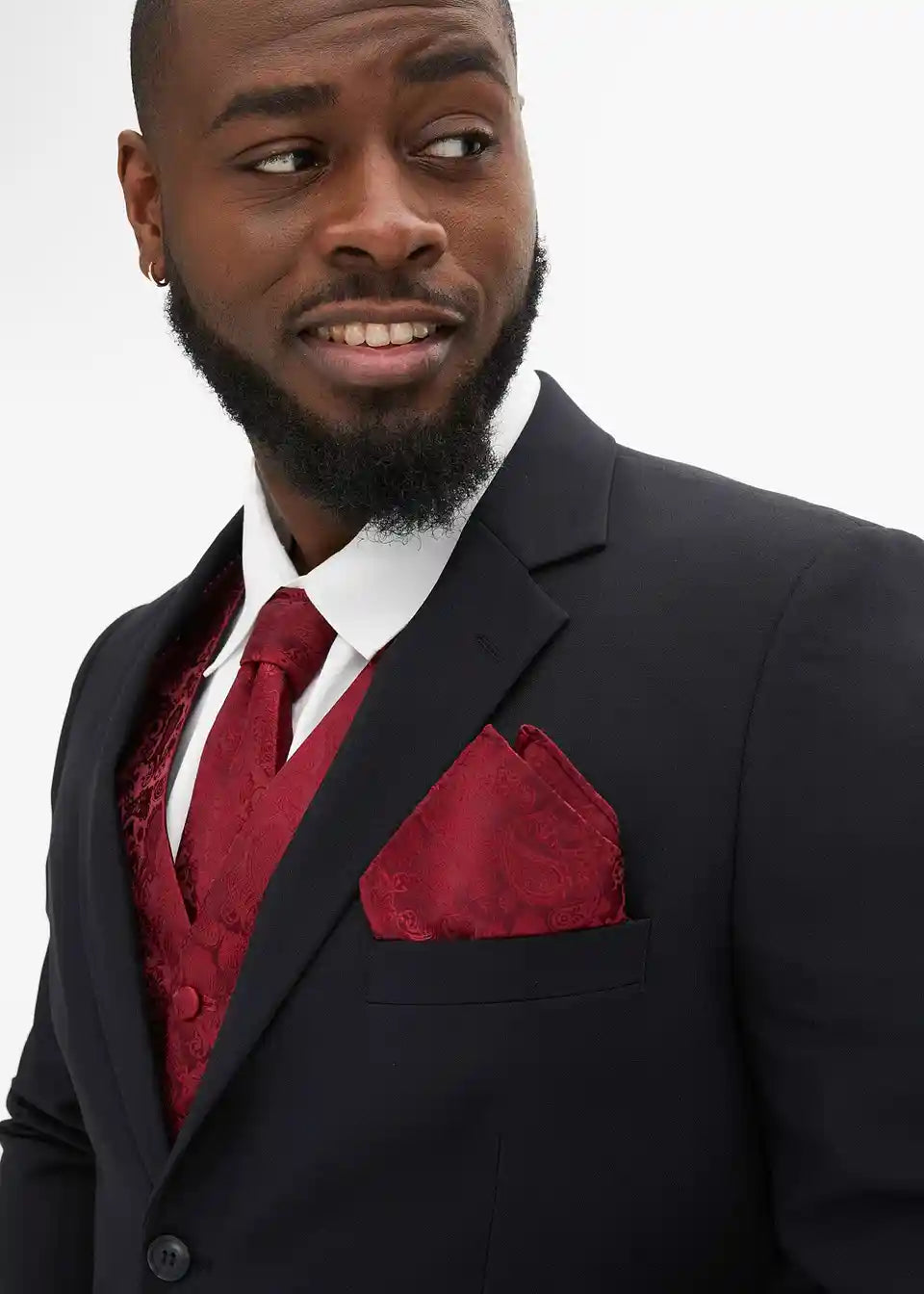Moderan 5-dijelni svadbeni odijelo sastoji se od Sakoa, Hlača, Prsluka, Kravate i Džepne maramice u Slim Fit kroju