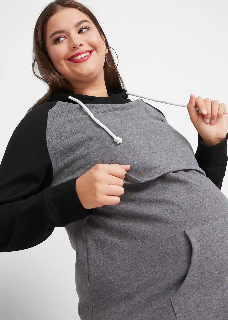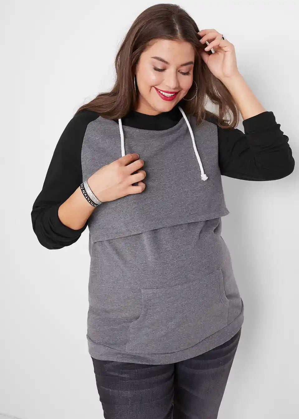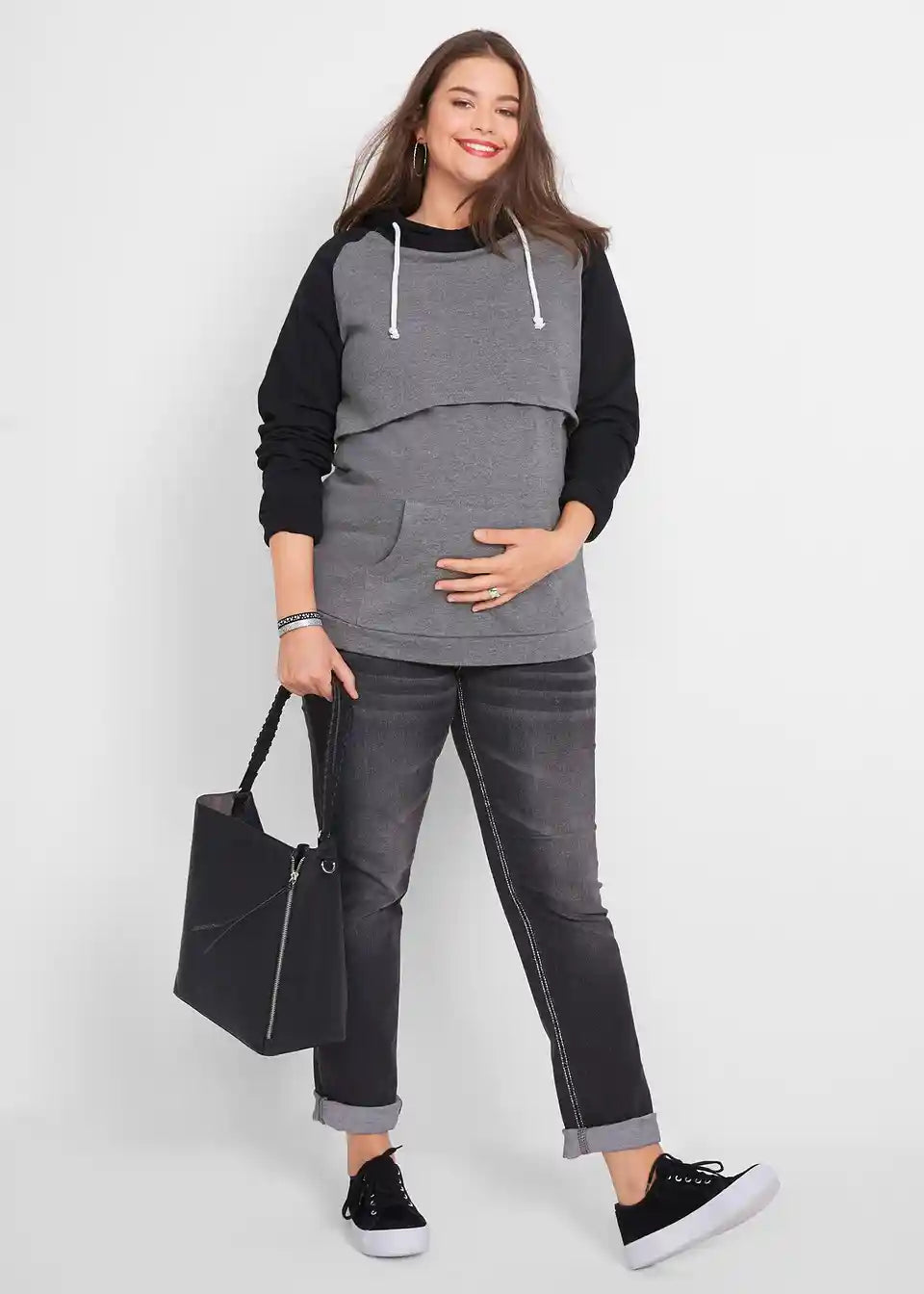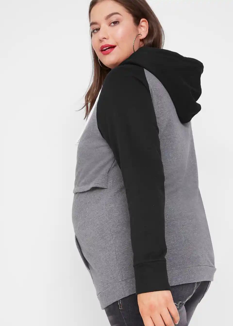 Kao moderan streetwear stil, ova sweatshirt majica prati buduće majke kroz trudnoću i također se pokazuje kao udoban pratitelj nakon poroda. Zahvaljujući udobnom kroju u kombinaciji s ugodnim sweat-materijalom, majica za trudnoću raste zajedno s trbuhom. Tijekom razdoblja dojenja, prednji dio u dva sloja može se jednostavno podignuti za hranjenje.