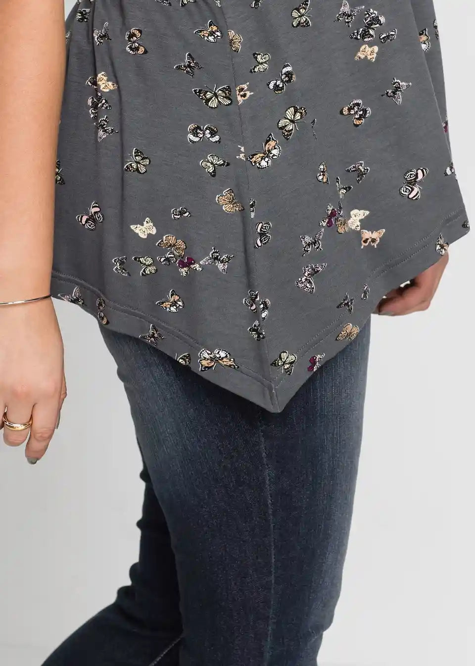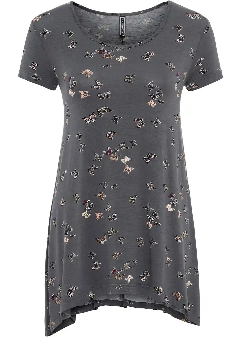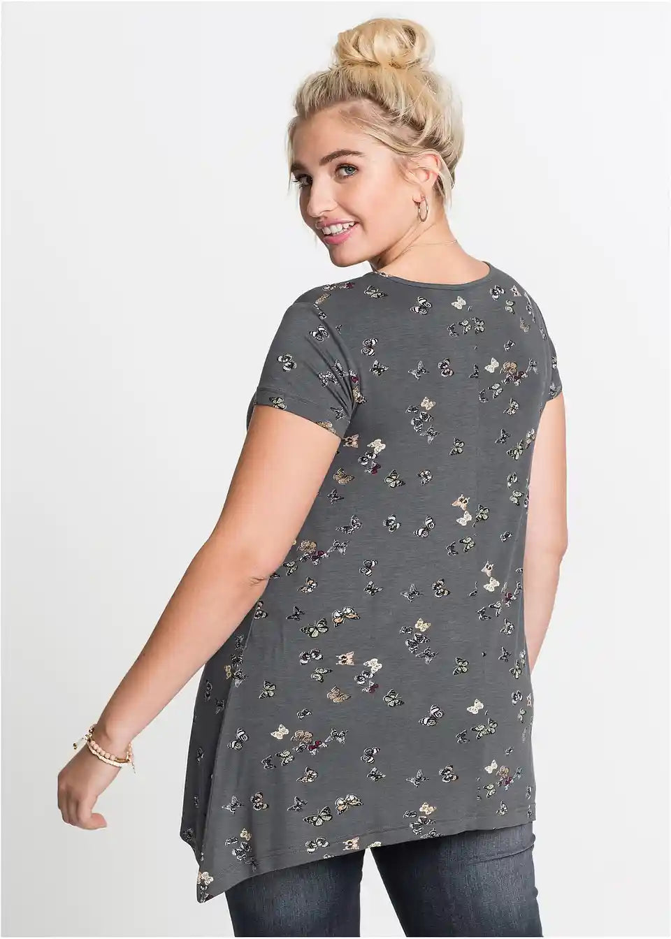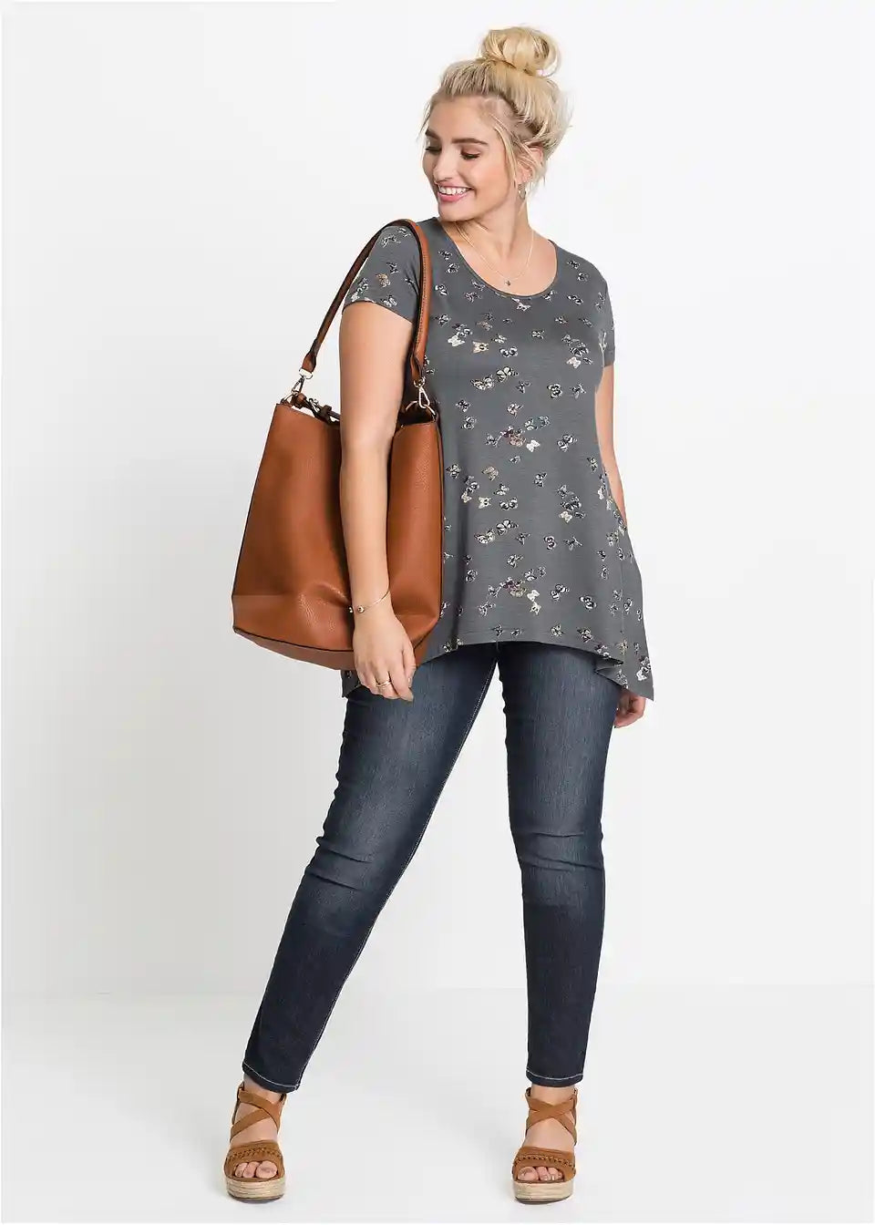 Ova lagano proširena majica dobiva moderan izgled zahvaljujući produženim bočnim rubovima. Model s kratkim rukavima i okruglim izrezom oduševljava svojim laskavim efektom. Majica je odlična kao osnova za cool stil s traperom. Trendovski oversize izgled postiže se s Palazzo hlačama i grubim pletenim kardiganom. Leggingsice ili uske traperice s uništenim detaljima također je lijepo ističu.