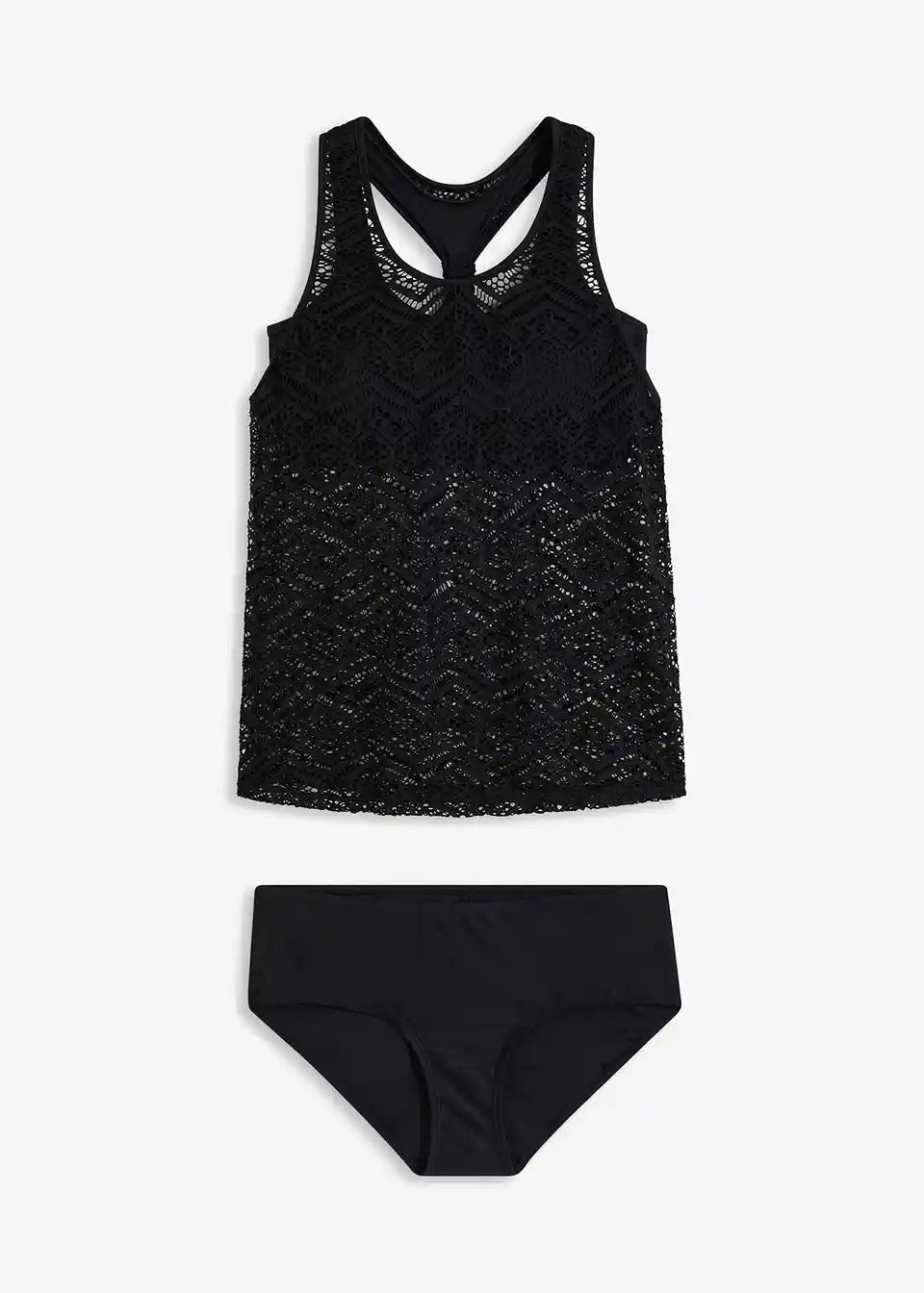 Ovaj cool Tankini oduševljava svojim dvostruko složenim gornjim dijelom: Bustier dolazi s uklonjivim Softcup umetkom, sportskim leđima, podstavom za grudi i donjim elastičnim pojasom. Preko toga se nalazi prozirni top s kukičanom čipkom. Oba sloja su na leđima spojena šivanjem. Prateće Tankini hlačice izrađene su od istog materijala kao i Bustier, te su šire krojene.