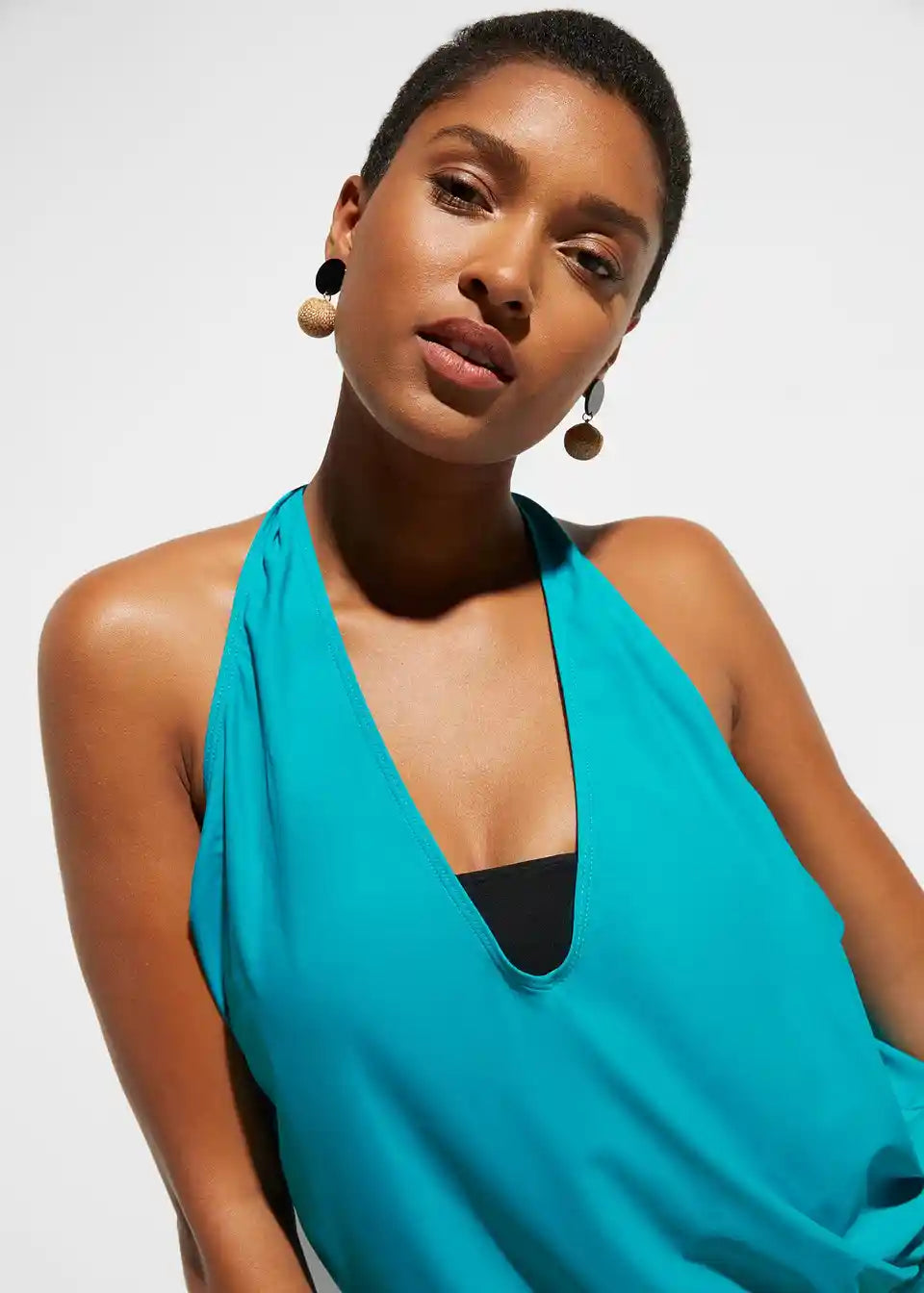 3-dijelni tankini sa grudnjakom, tank topom i bikinijem. Top šireg kroja s V-izrezom u obliku vezivanja oko vrata. Bandeau-top s podstavom za prsa i uklonjivim mekanim košaricama. Oko cijelog gumenog pojasa ispod grudi nalazi se elastična traka. Obični bikini donji dio.