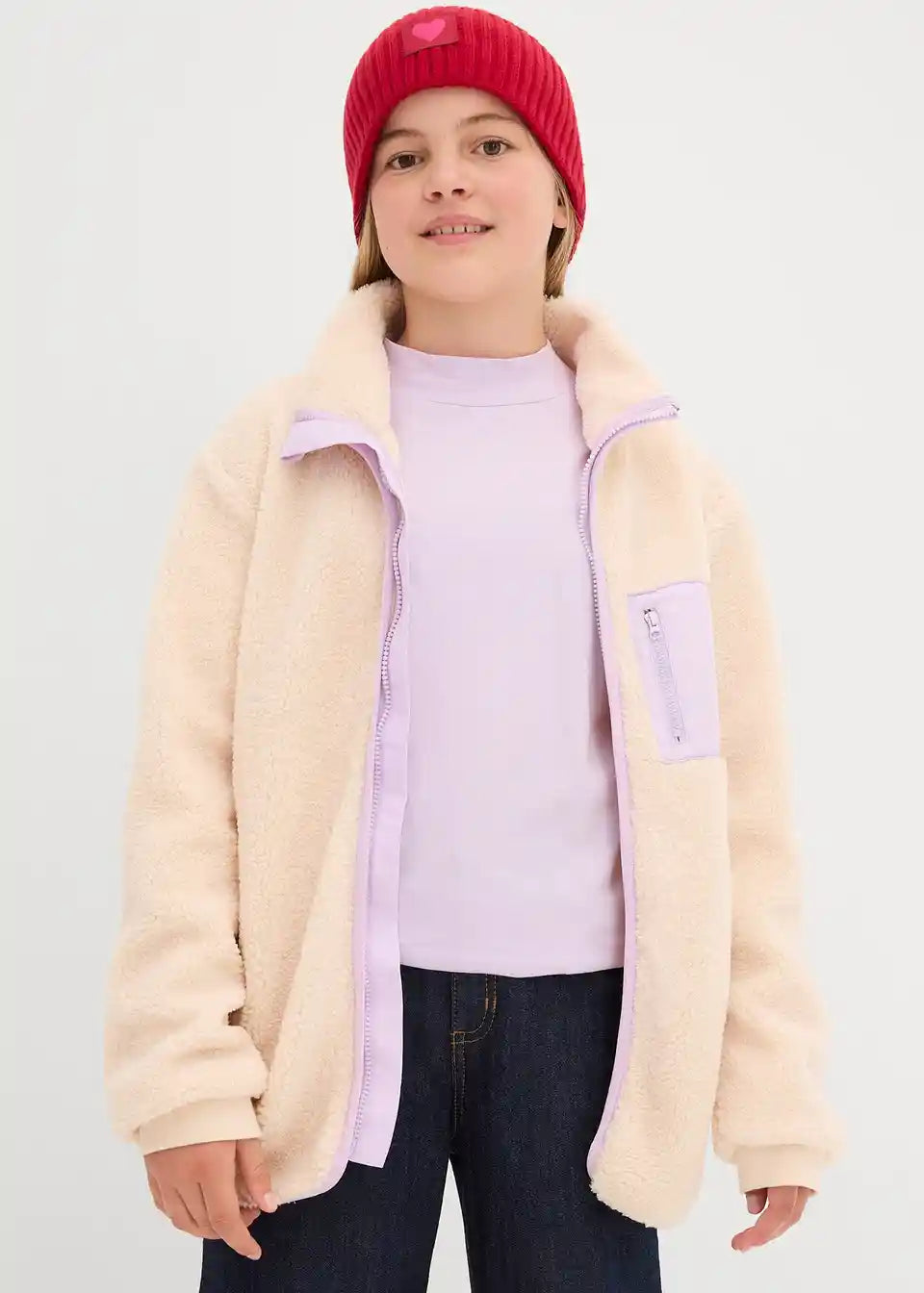 Ova teddy-fleece jakna je savršen pratitelj za hladne dane! Ima praktičnu stojeću kragnu i duge, ušivene rukave koji pružaju dodatnu udobnost. S oversize krojem koji prekriva bokove, nudi ležernu siluetu. Ravni porub ukrašen je kontrastnom obrubom, kao i patentni zatvarač i džep na prsima. Jakna je potpuno podstavljena jersey tkaninom i pruža ugodan osjećaj nošenja. Idealna za svakodnevicu ili aktivnosti na otvorenom – jednostavno odjenite i osjećajte se dobro!