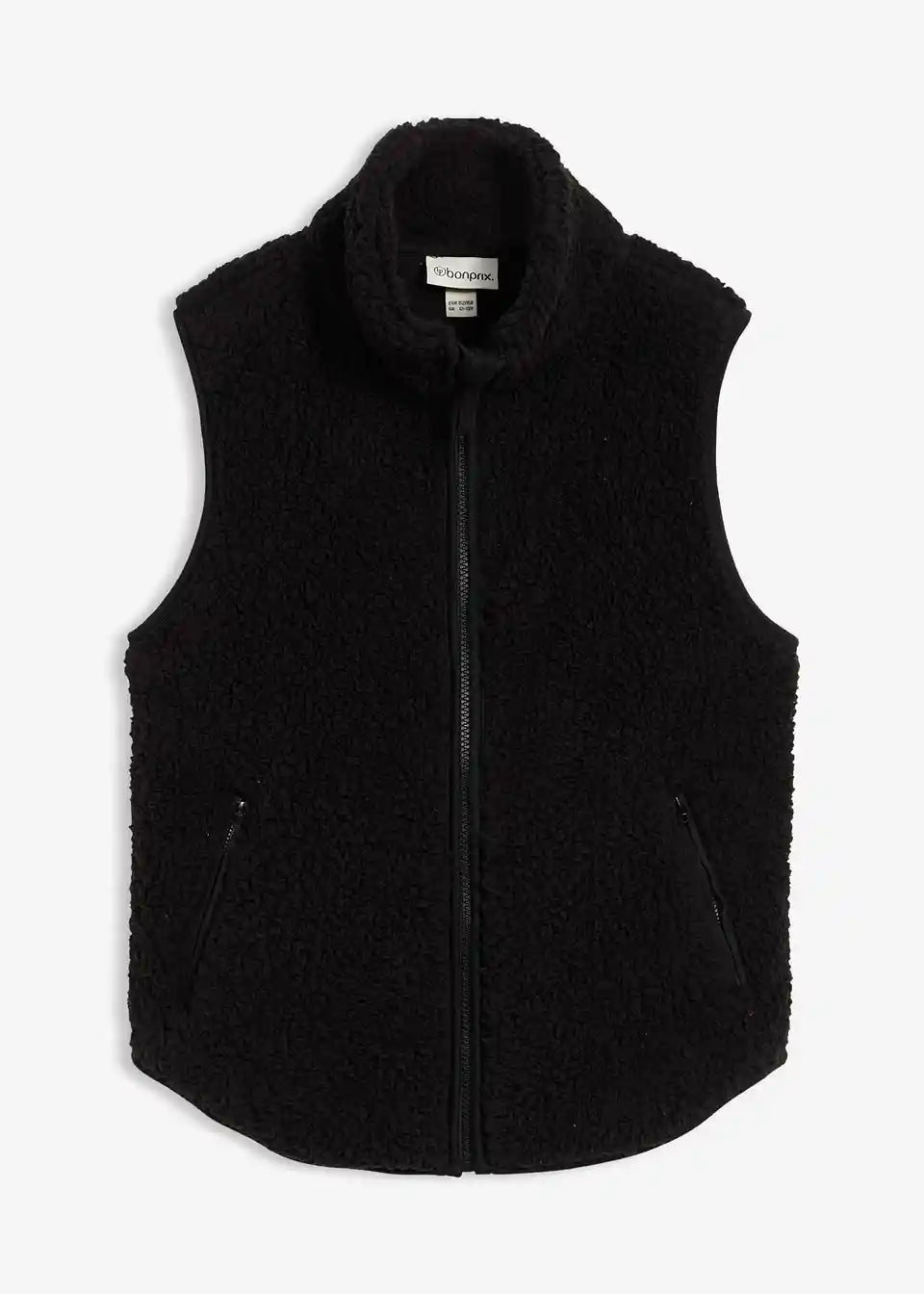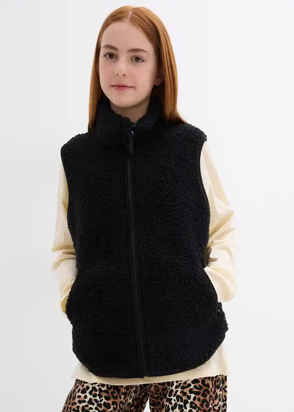 Ovaj Teddy prsluk savršen je pratitelj za hladne dane! Ima praktičnu stojeću kragnu i bez rukava je. S opuštenim krojem koji prekriva bokove, pruža udobnost i slobodu kretanja. Zaobljeni rubovi sprijeda i straga ukrašeni su odgovarajućim obrubom, kao i donji rub i patentni zatvarač. Prsluk ima praktični patentni zatvarač s odgovarajućom trakom za povlačenje te također dvije patentirane džepove s obrubom. Must-have za svaku mladu garderobu – jednostavno odjenuti i osjećati se ugodno!