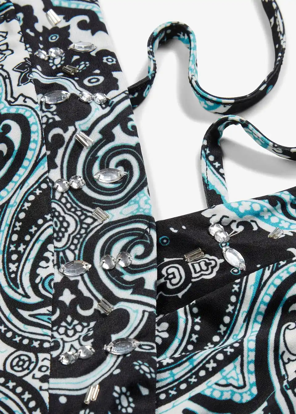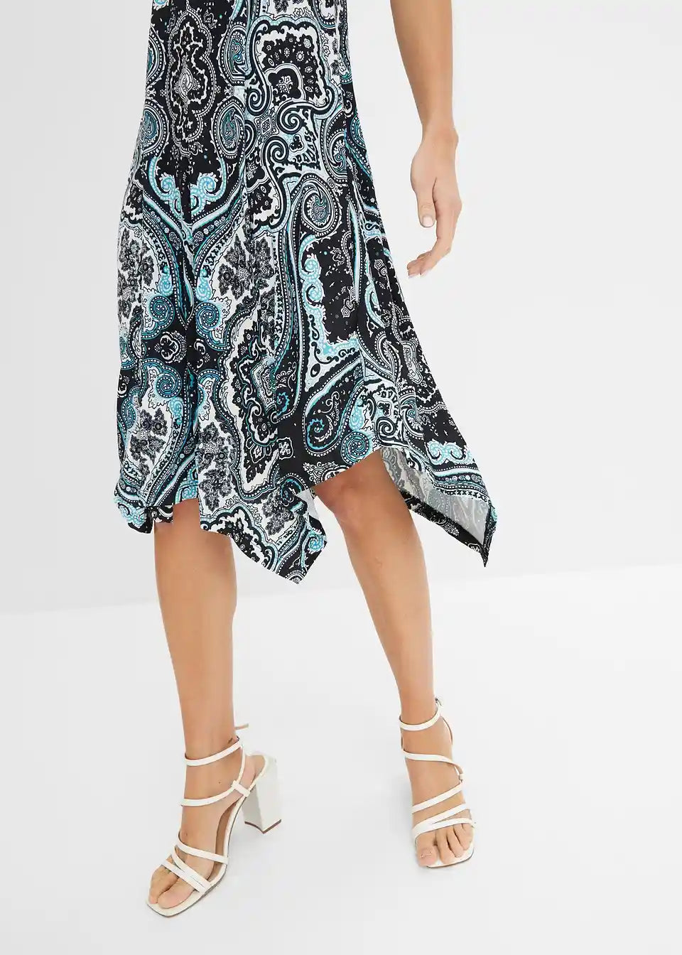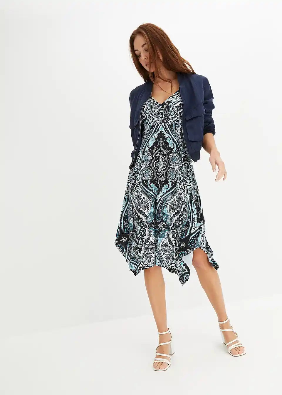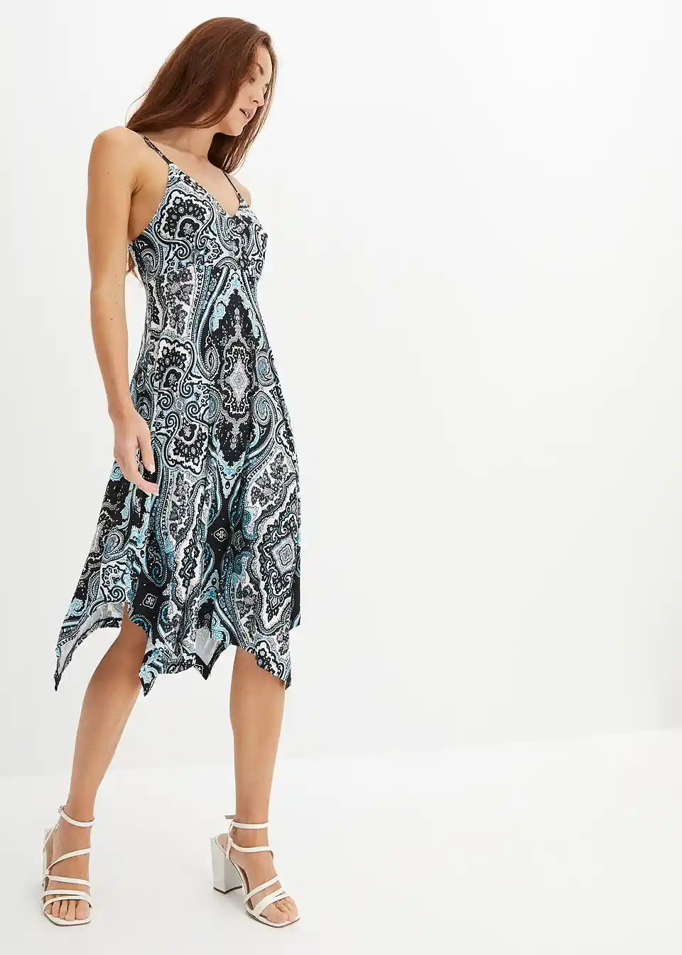 Šarmantna lagana ljetna haljina BODYFLIRT. Haljina s tiskanim uzorkom u stilu carstva s diskretnim šavom ispod grudi. Lagani materijal pada široko i lepršavo ispod grudi. Moderni asimetrični rub lagano obuhvaća noge u visini koljena. Tanke naramenice i duboki V-izrez daju ovom modelu atraktivan izgled.
