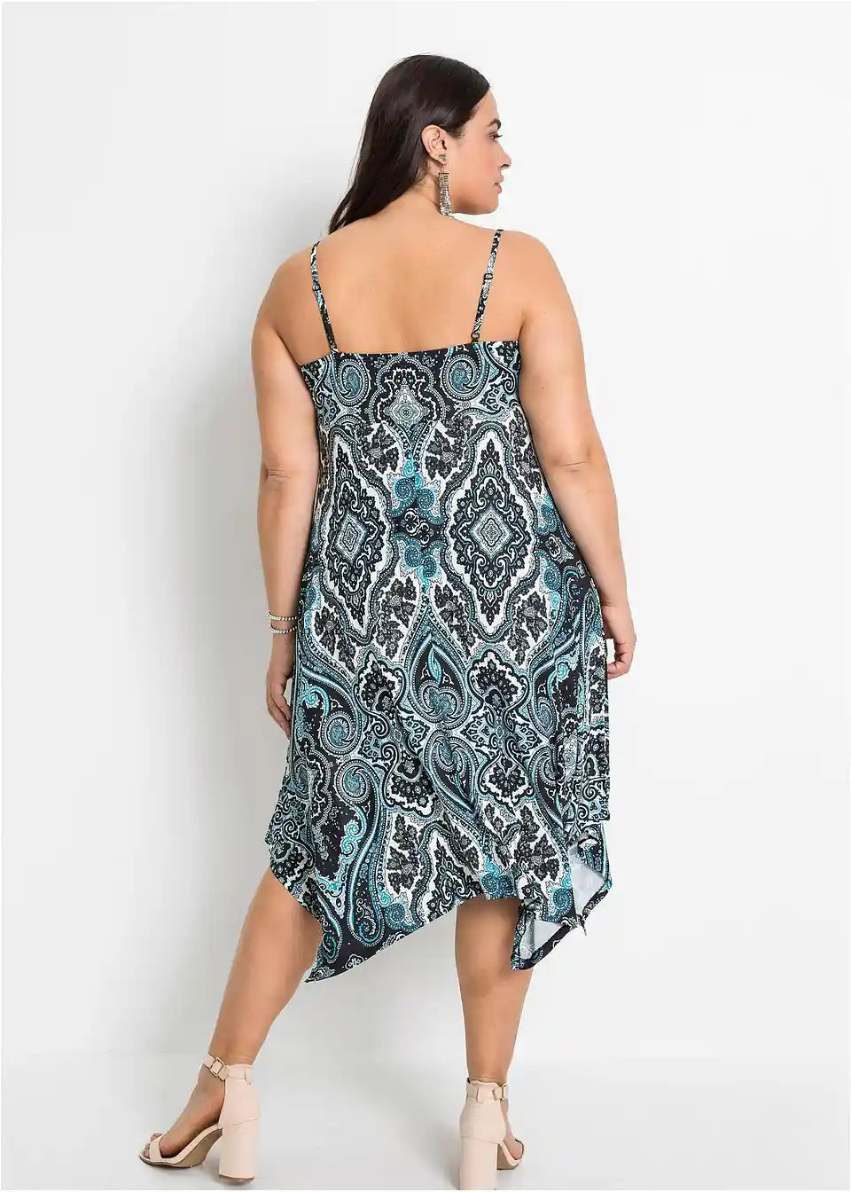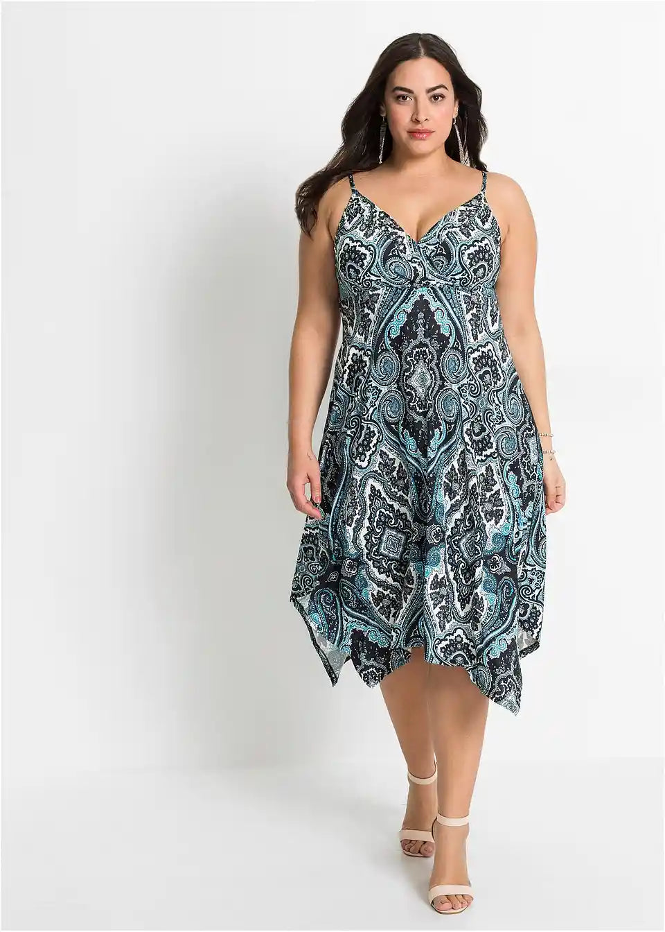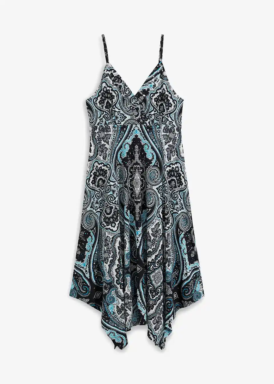 Šarmantno se predstavlja ova lagana ljetna haljina marke BODYFLIRT. Haljina s cjelovitim uzorkom krojena je u Empire stilu sa suptilnim šavom ispod grudi. Ispod grudi lagani materijal slobodno i lepršavo pada prema dolje. Moderan asimetričan porub diskretno otkriva koljena. Spageti naramenice i duboki V-izrez atraktivno stavljaju model u prvi plan.